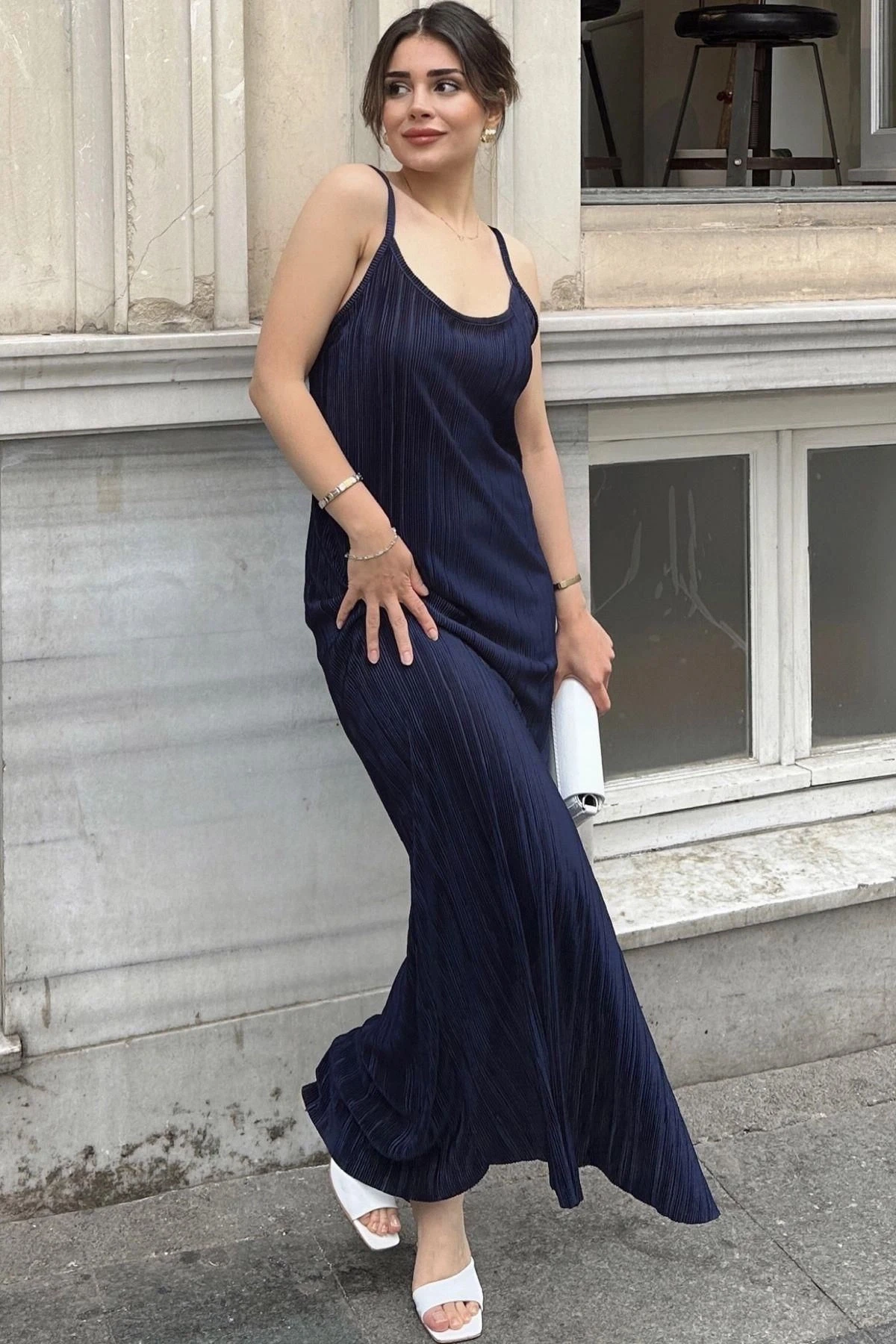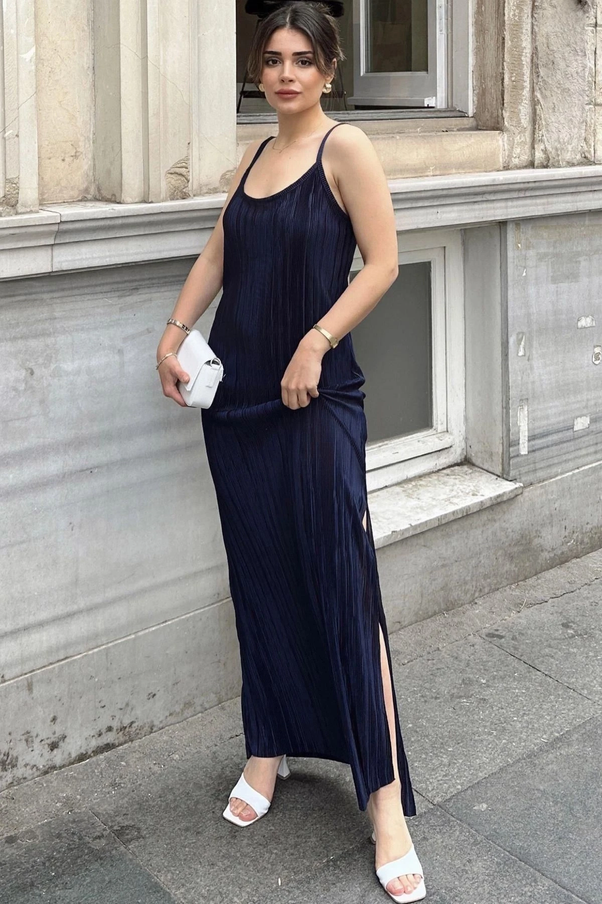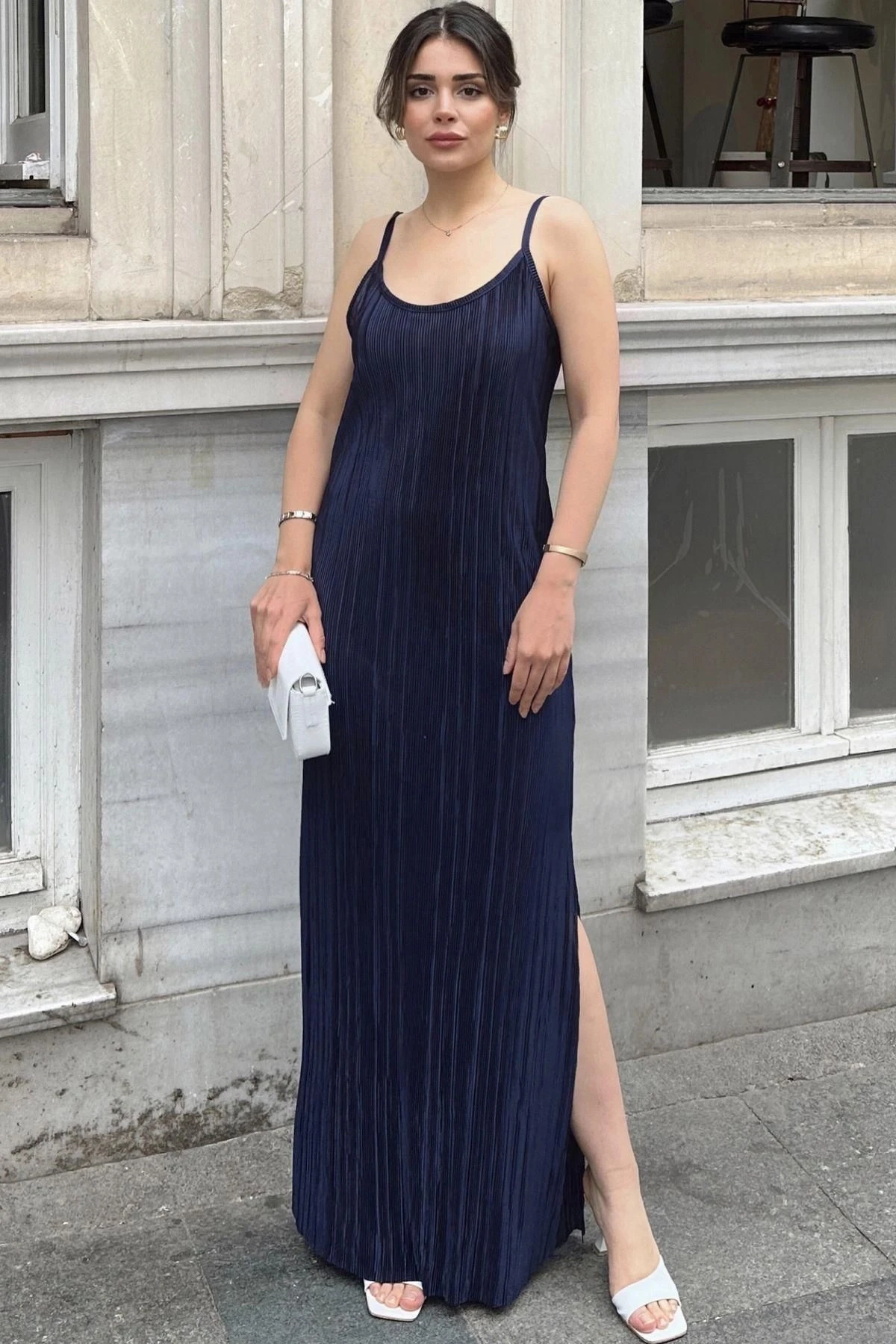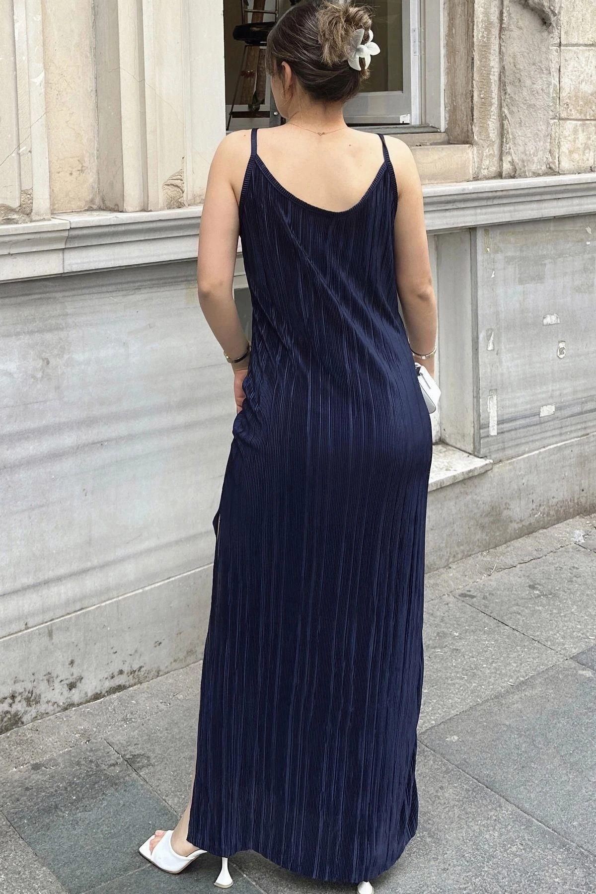 Kadın Laci İnce Askılı, V Yaka, Yırtmaç Detaylı, Uzun Pliseli Elbise