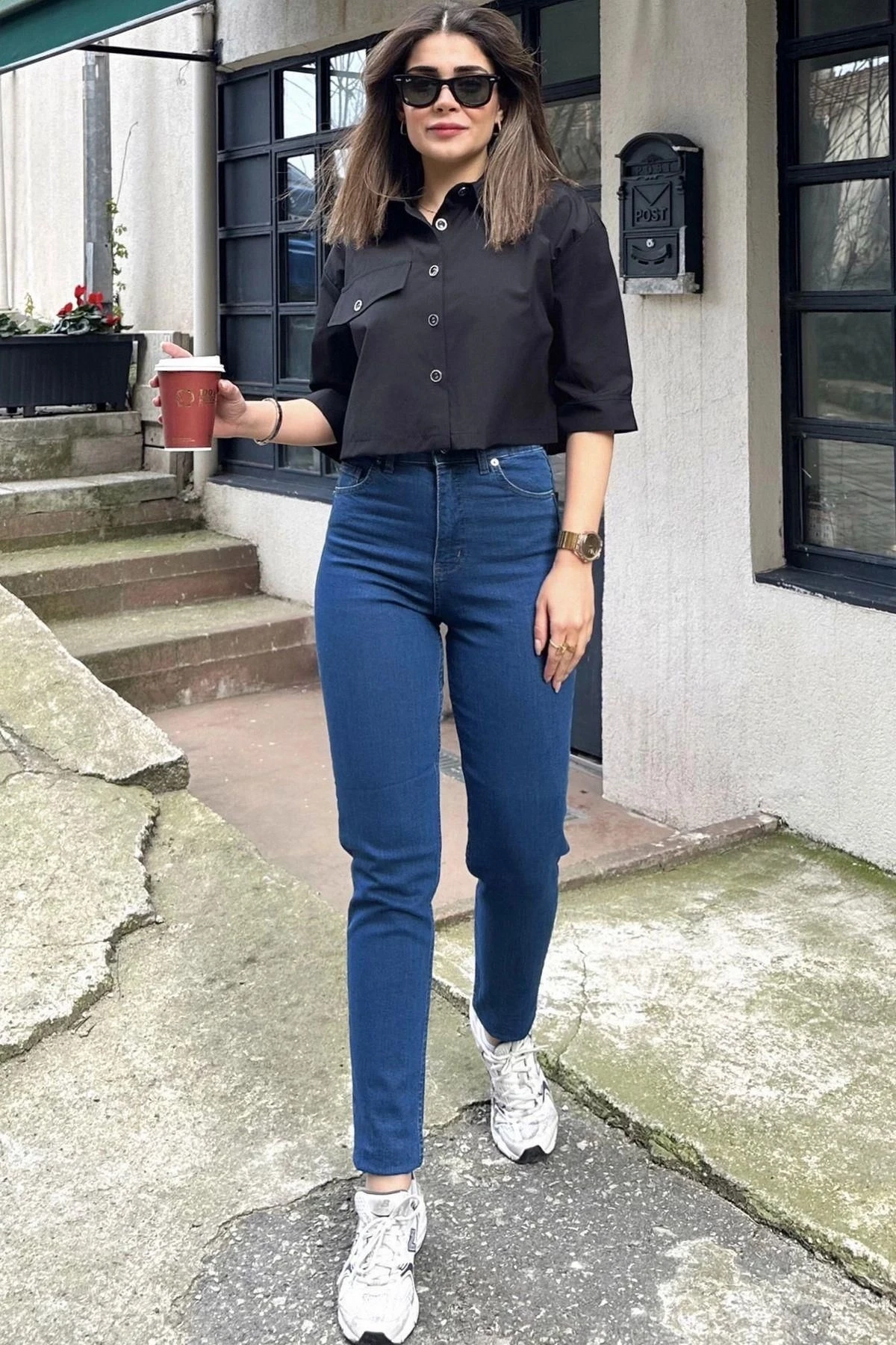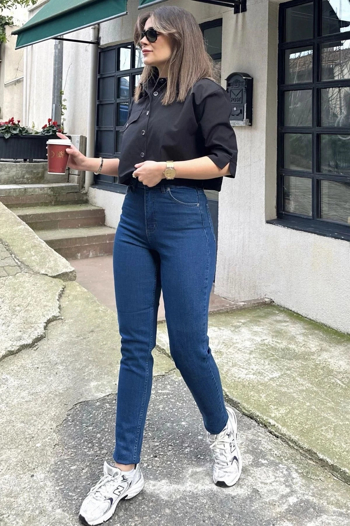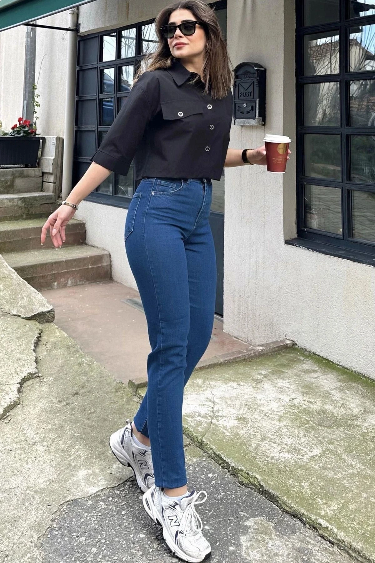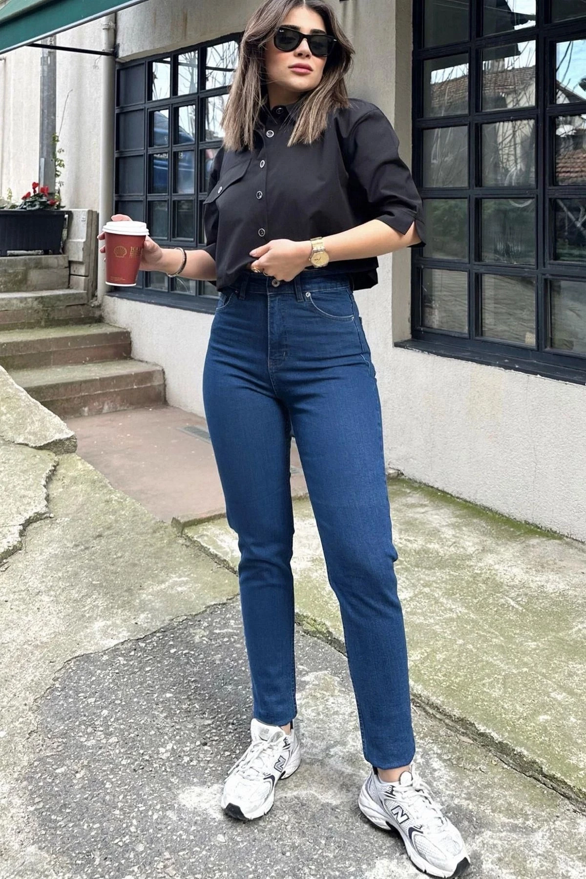 Kadın Laci Yüksek Bel, Rahat Kesim, Boru Paça, Skinny Kot Pantolon - Jeans