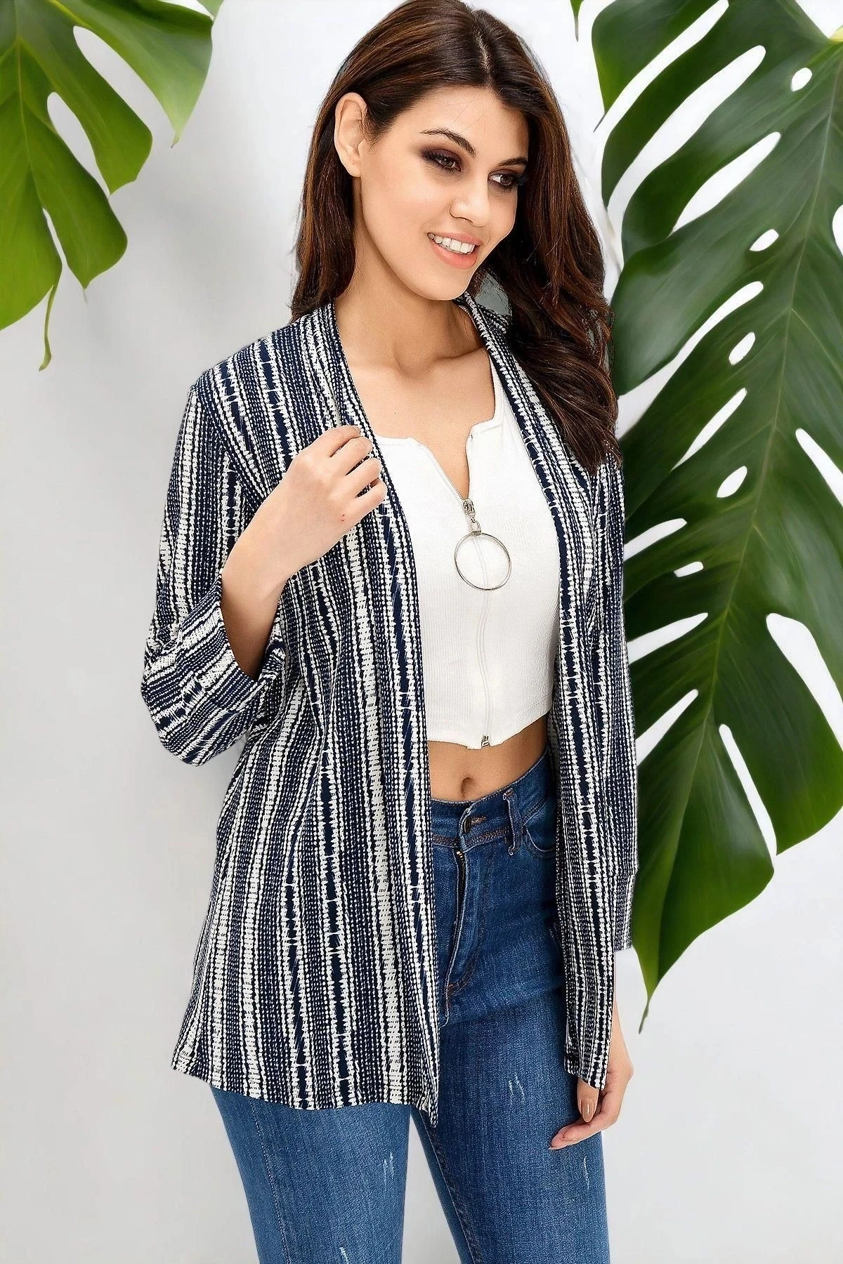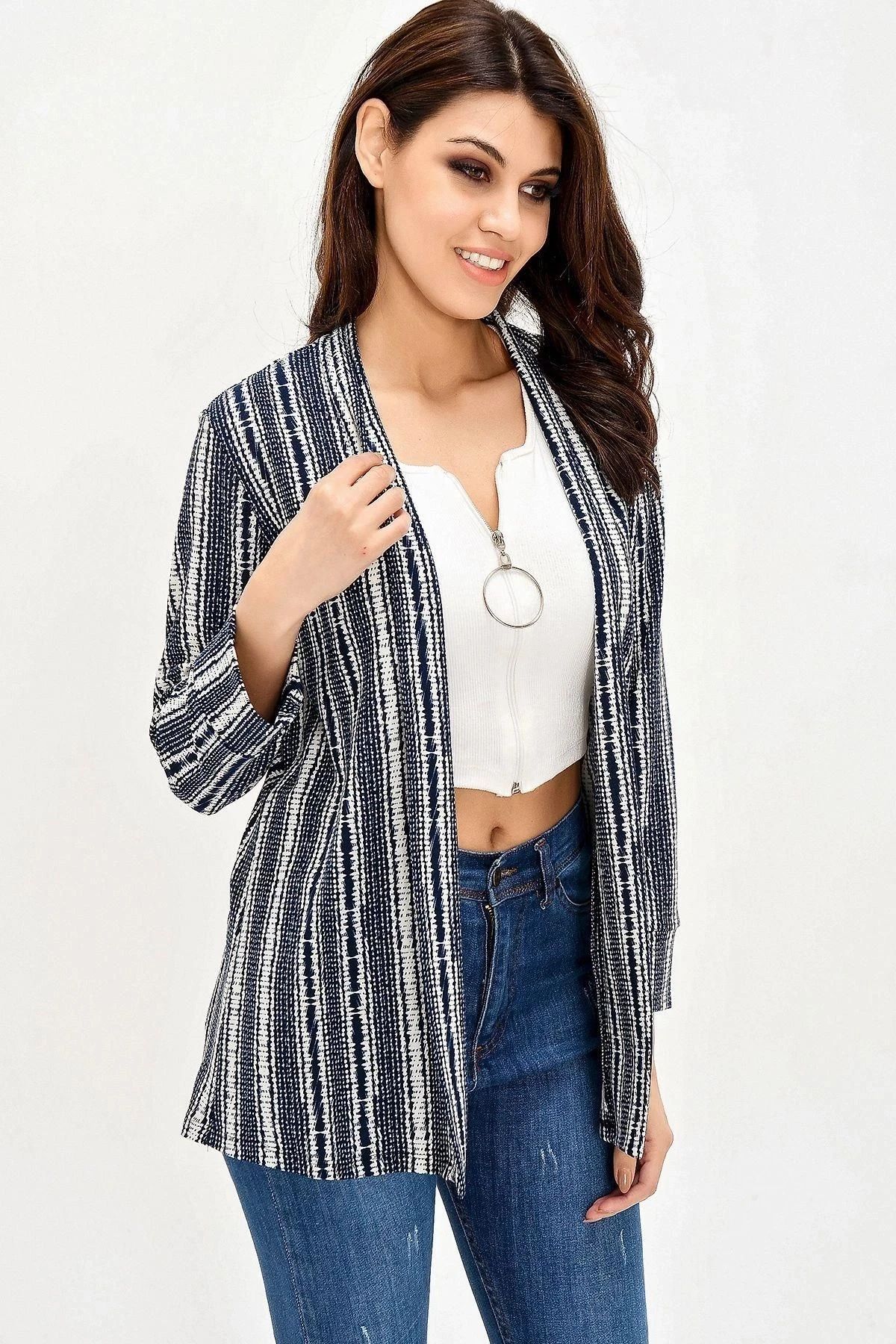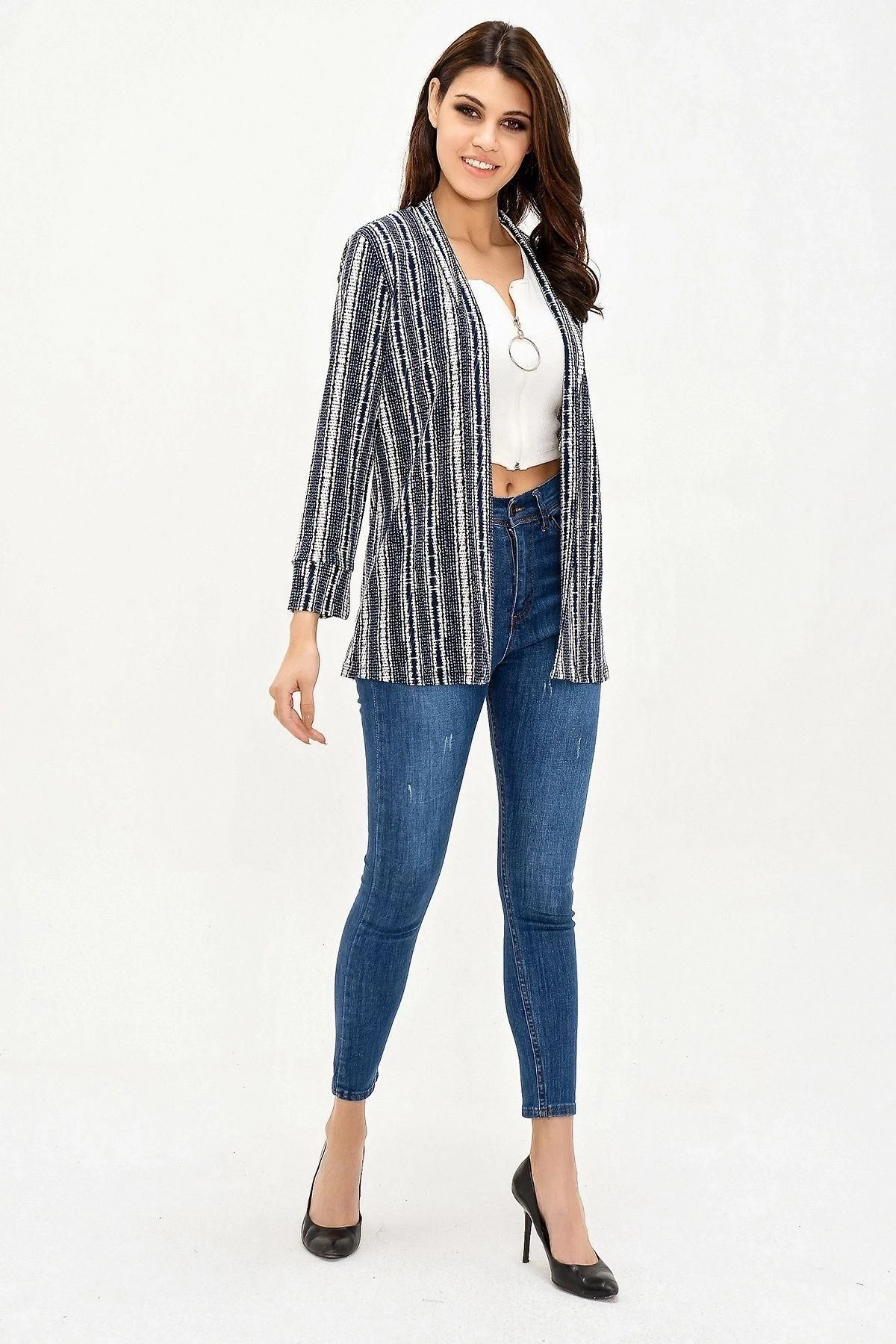 Kadın Lacivert Çizgi Desenli Ceket Uzun Kol Ceket Yaka Düğmesiz Rahat Kesim - Tesettüre Uygun