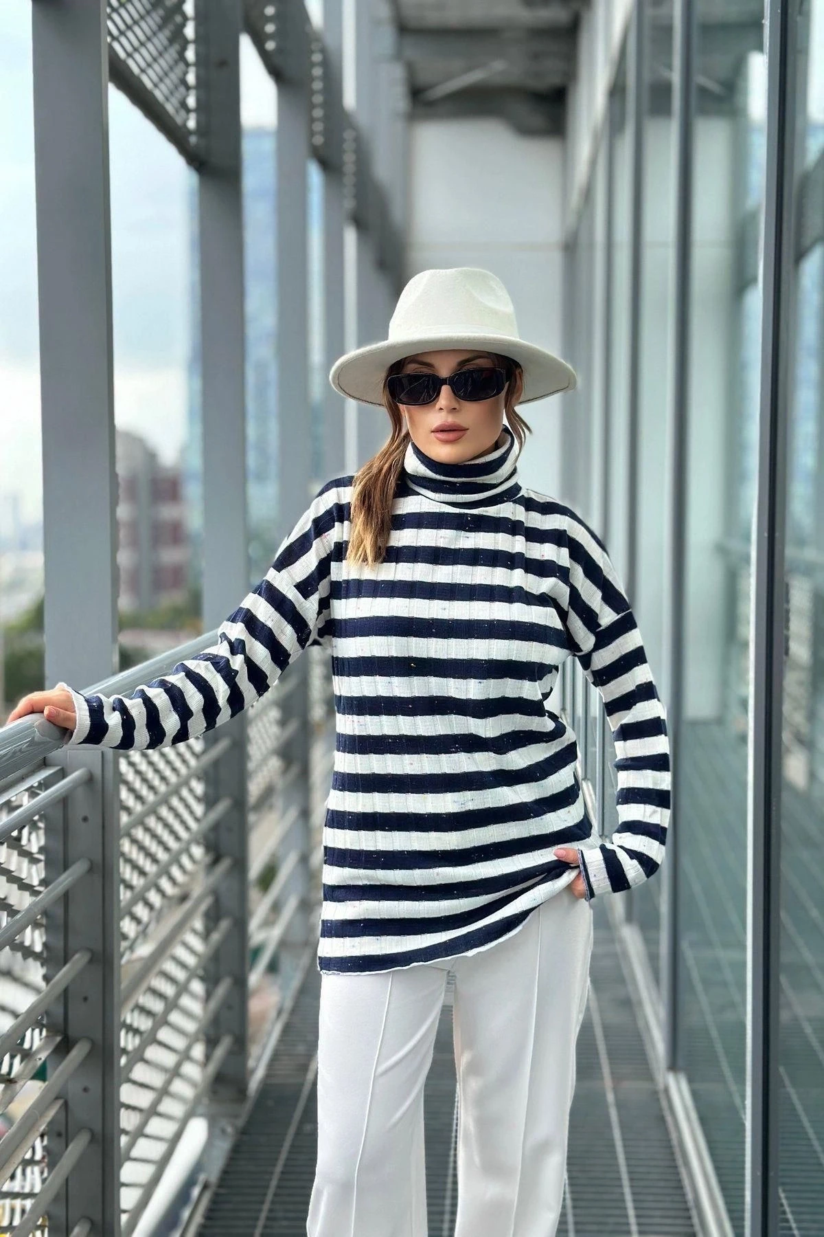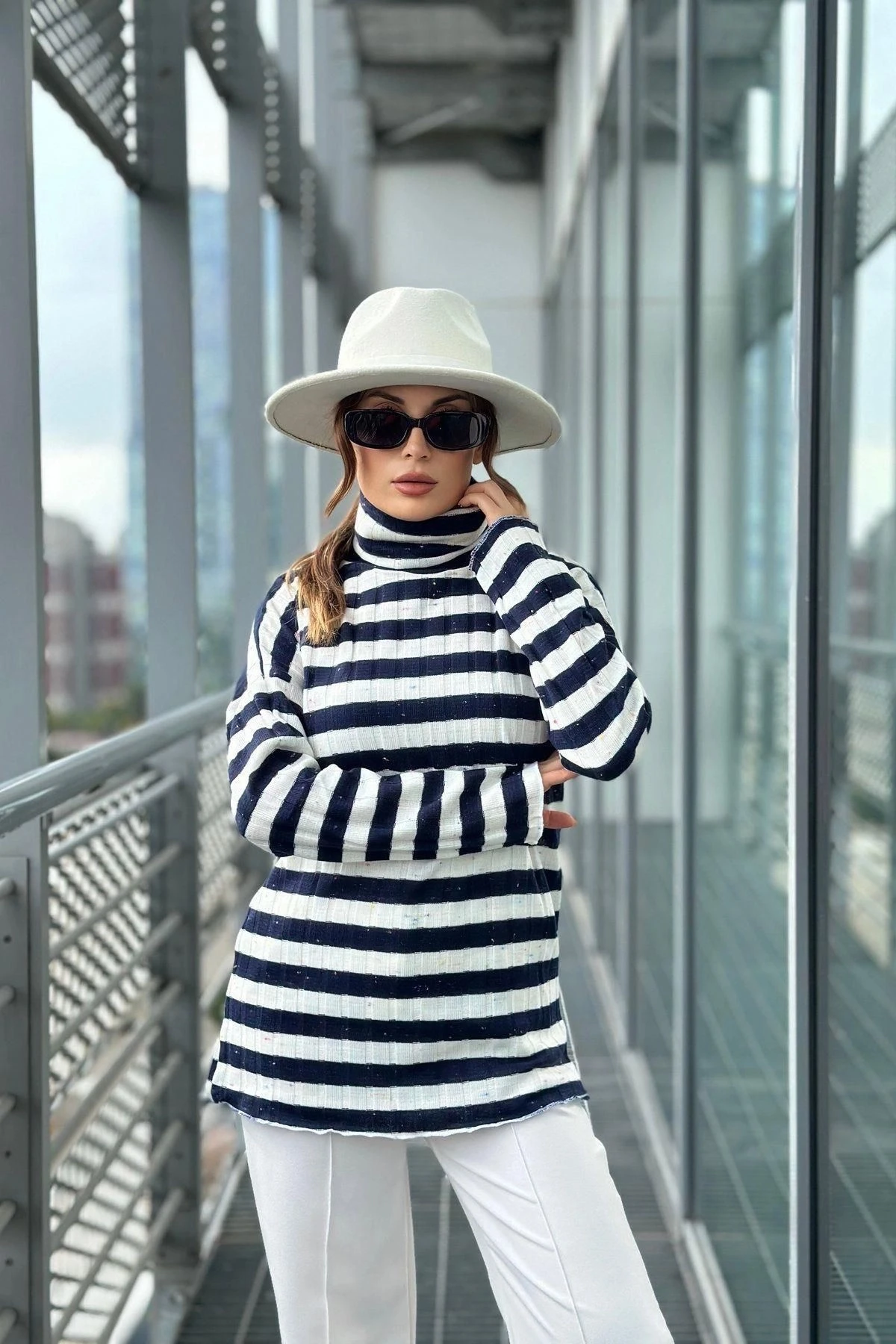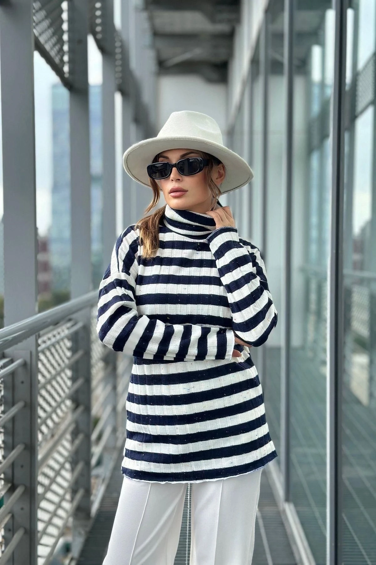 Kadın Lacivert & Ekru Uzun Kol, Çizgili, Fitilli Kumaş, Regular Kesim, Boğazlı Triko Bluz