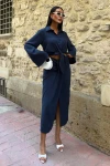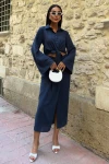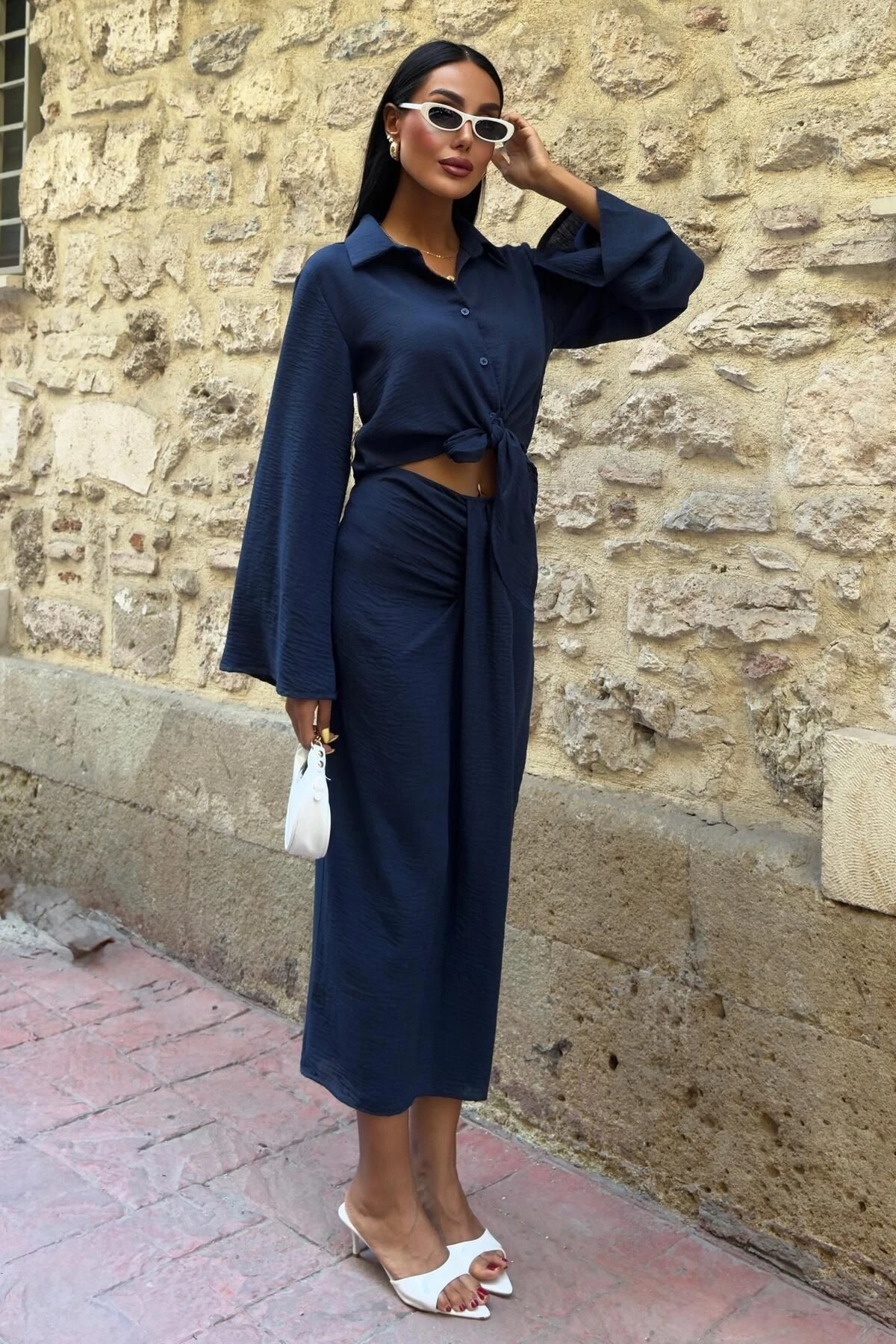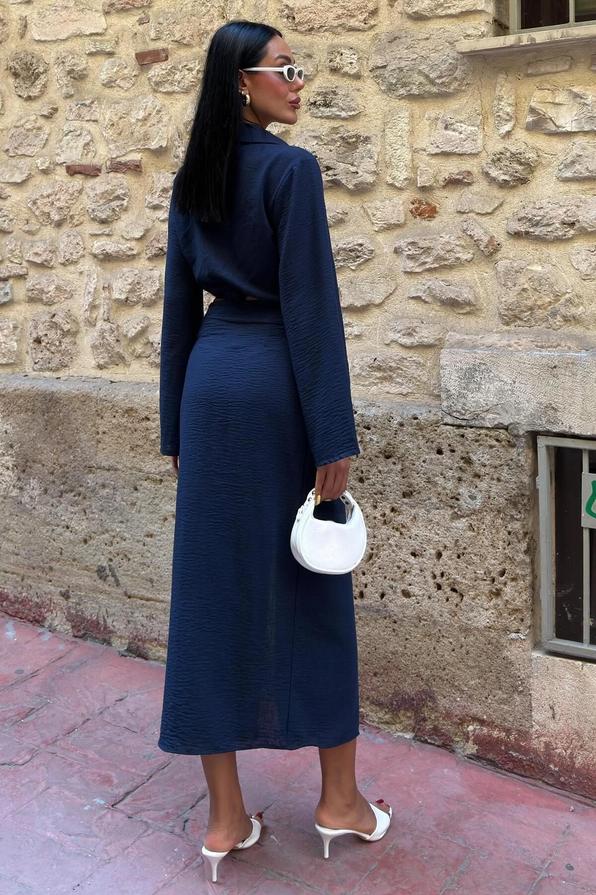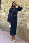 Kadın Lacivert Gömlek Yaka Keten Uzun Takım