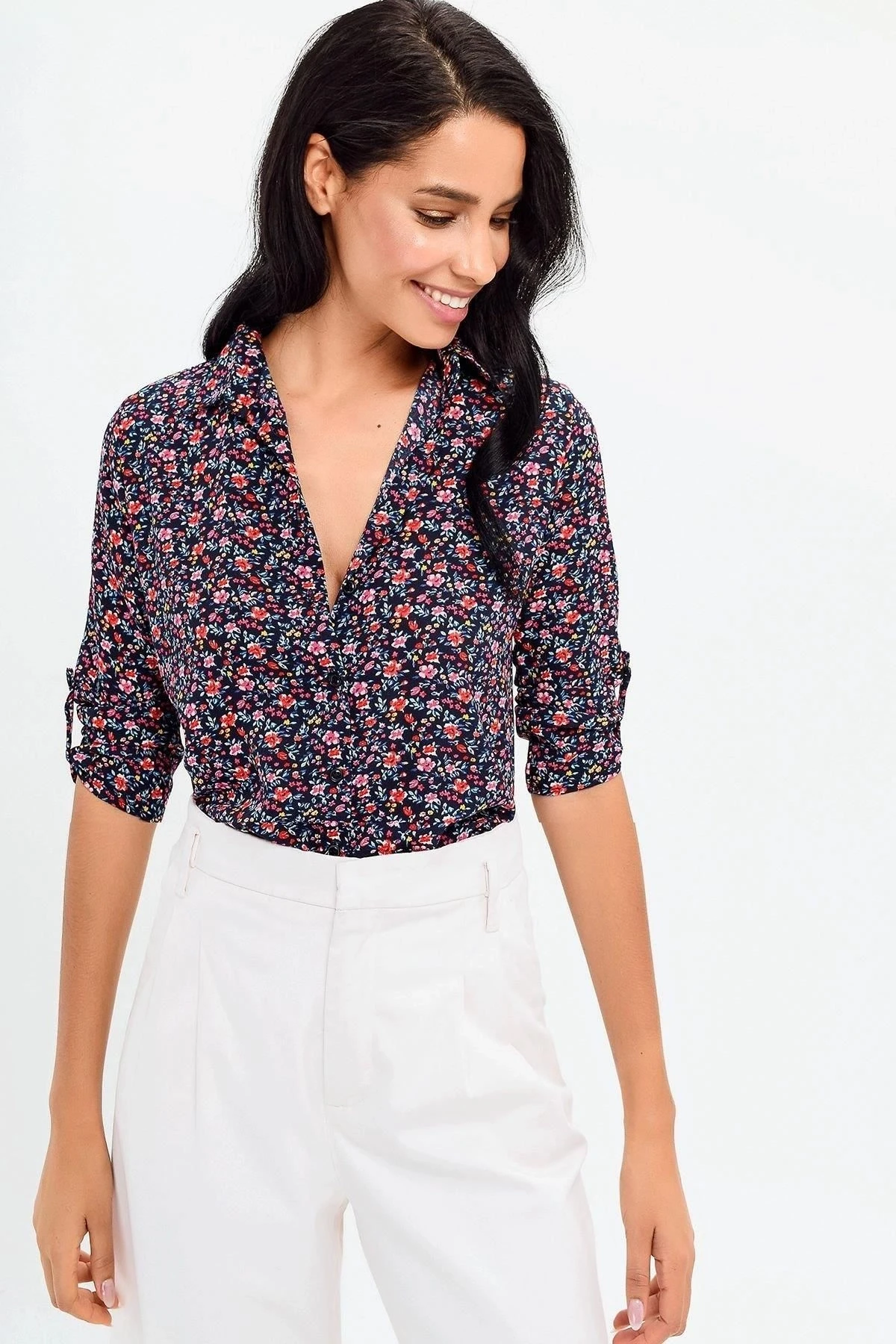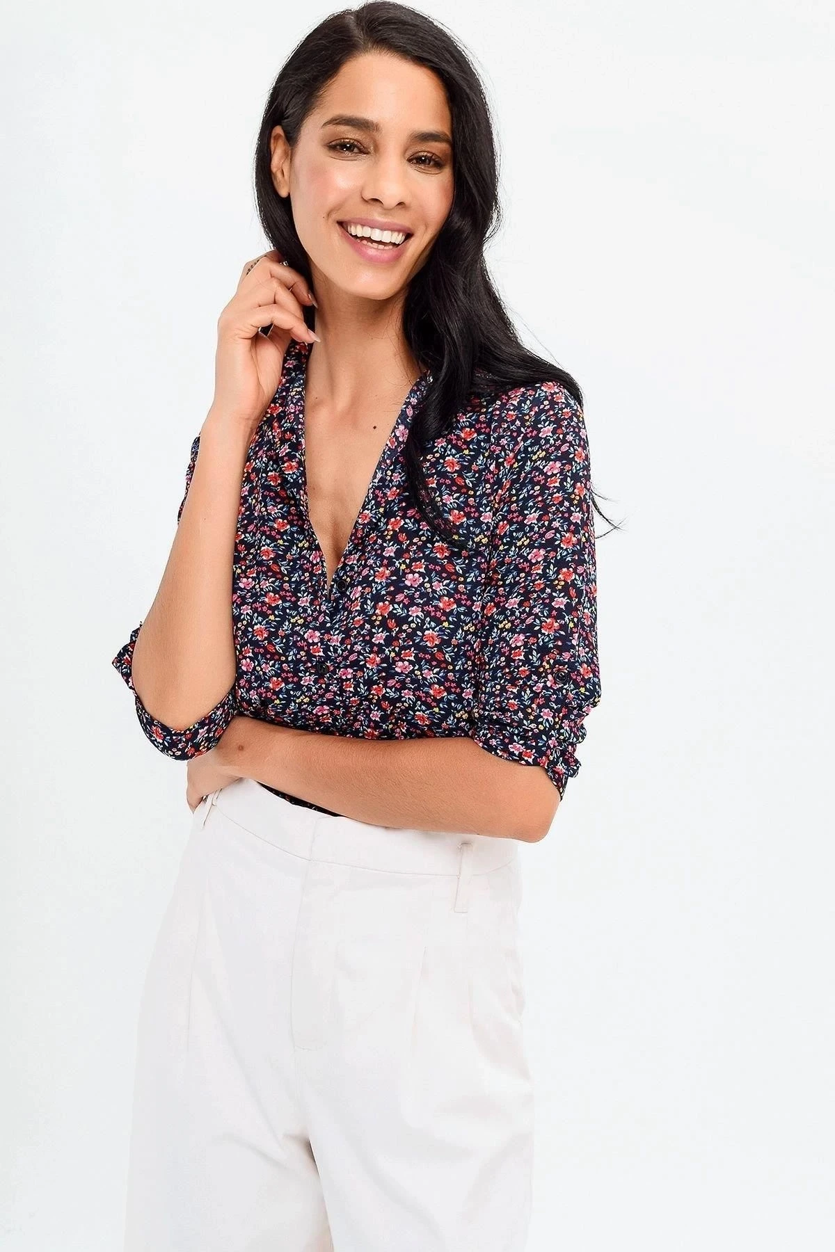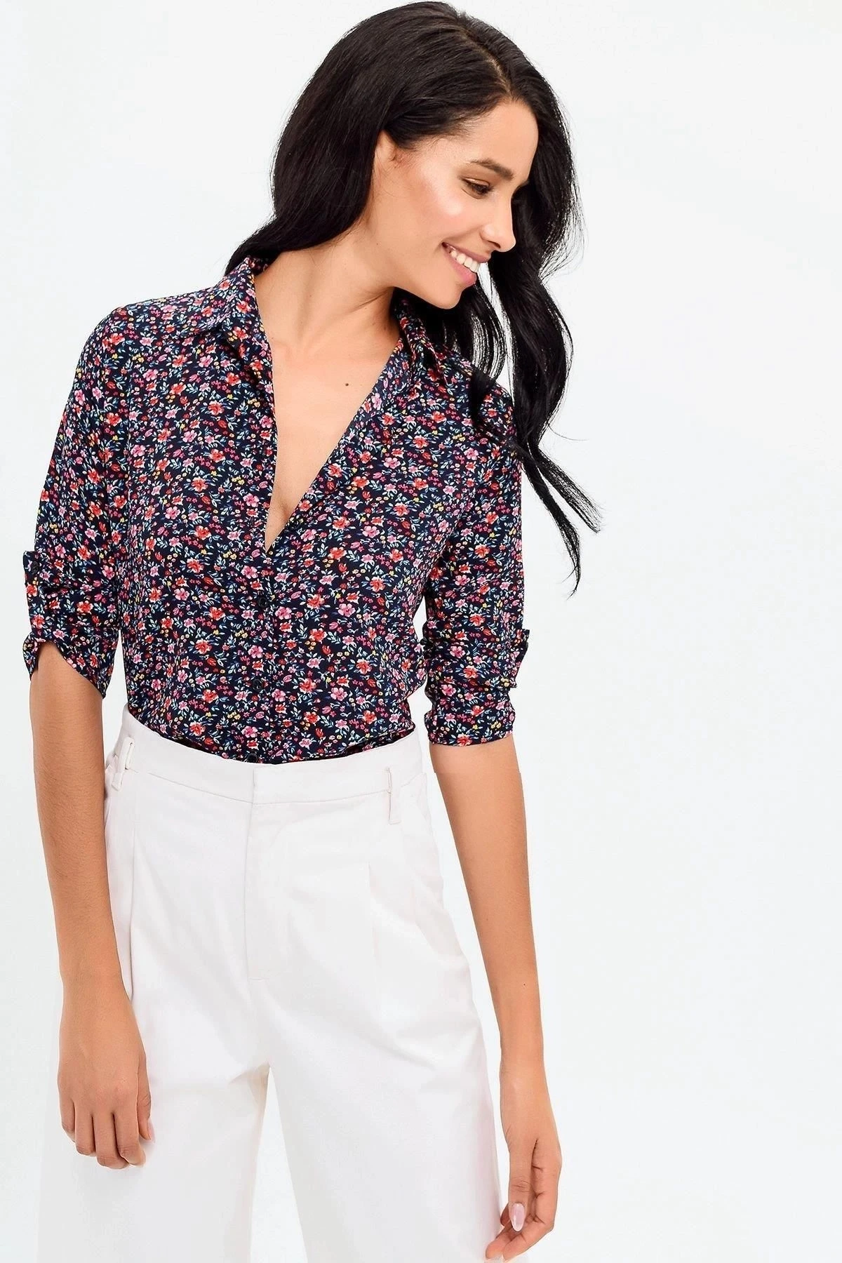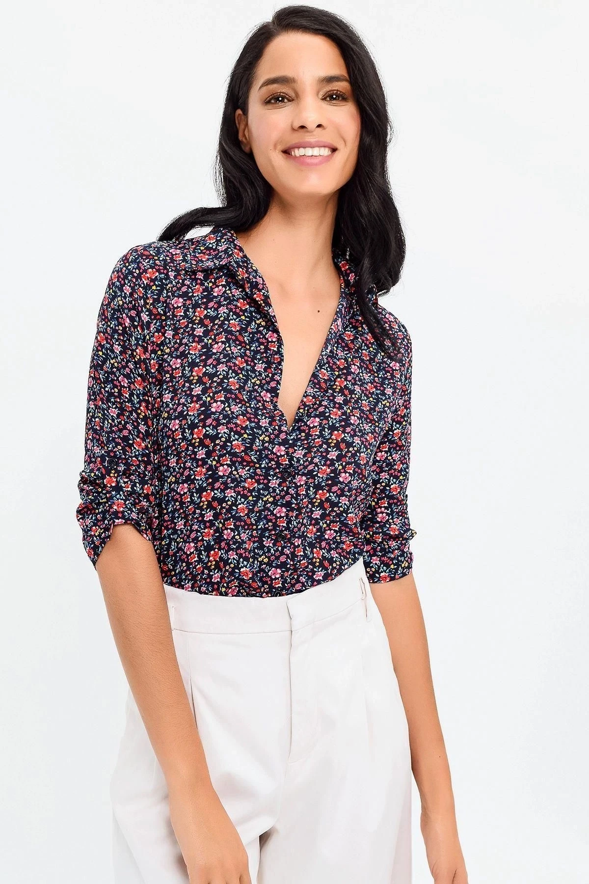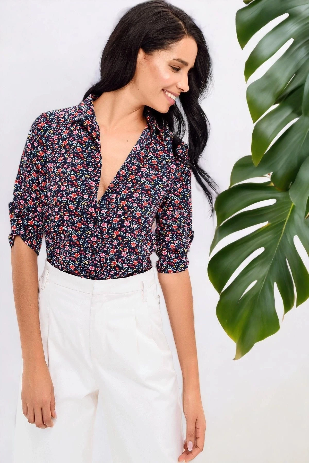 Kadın Lacivert Kaliteli Üretim Çiçek Desenli Krep Klasik Yaka Truvakar Kol Gömlek
