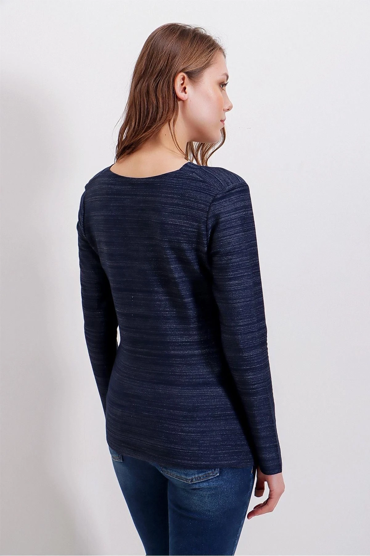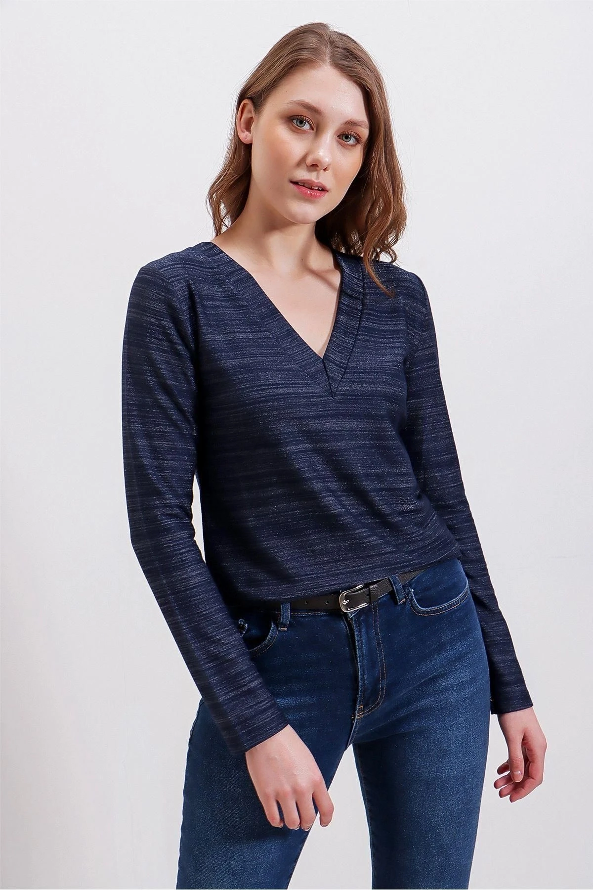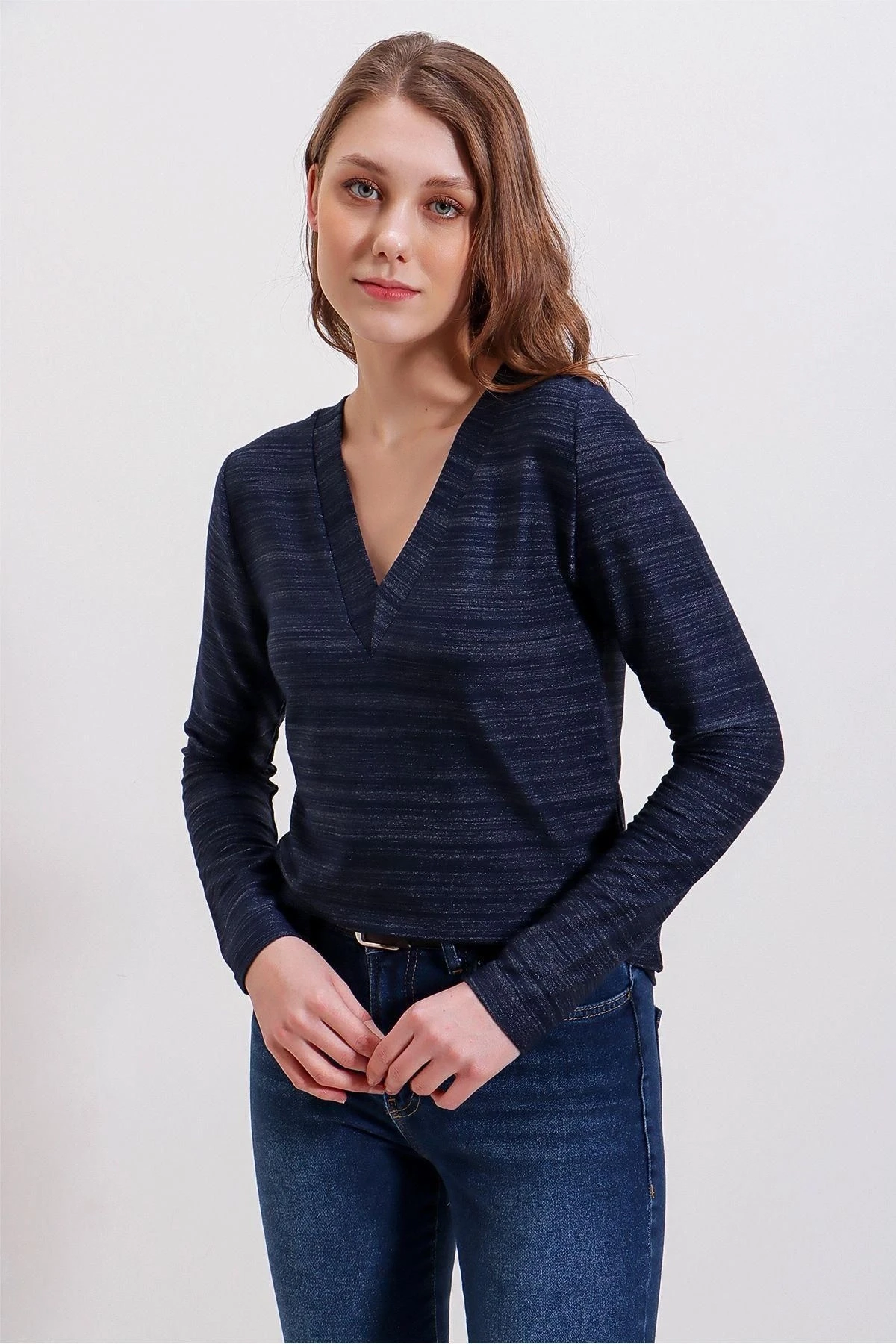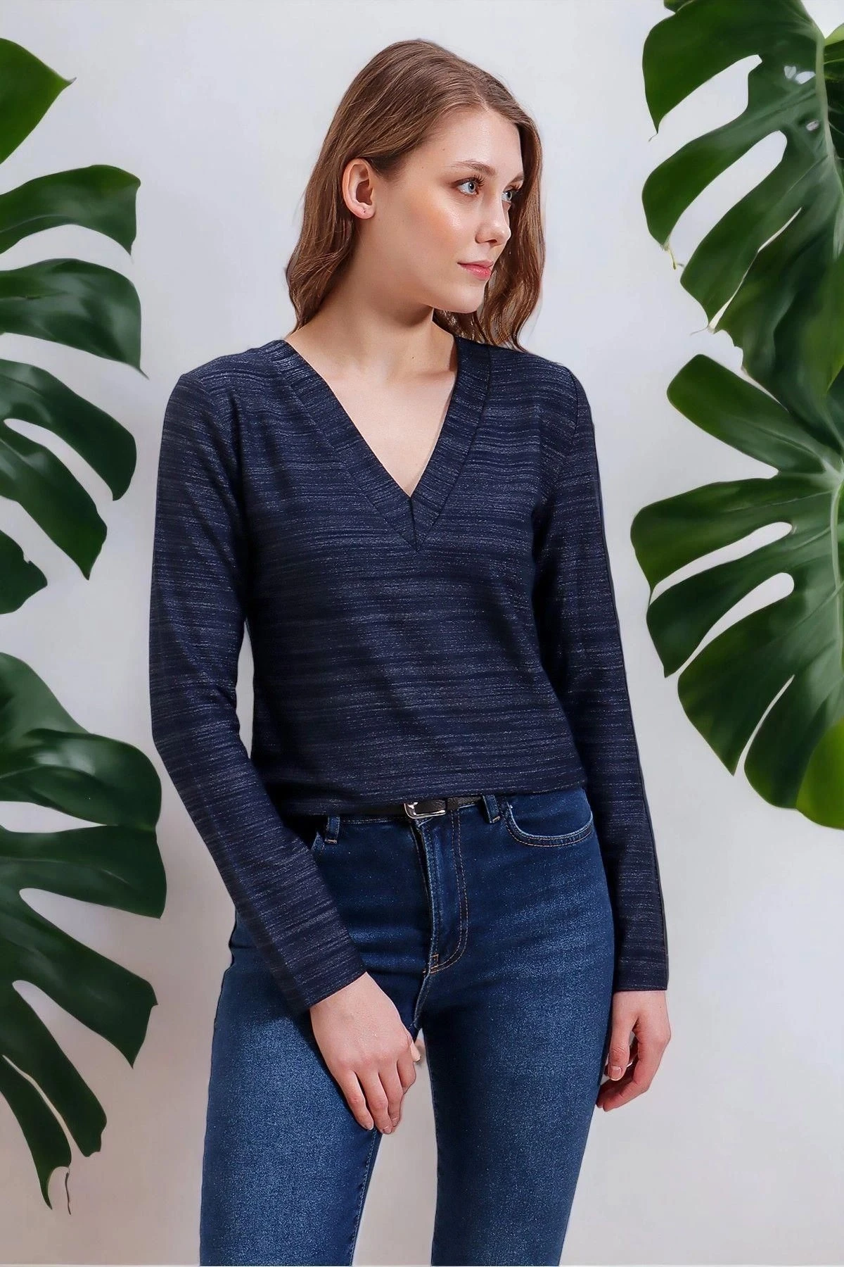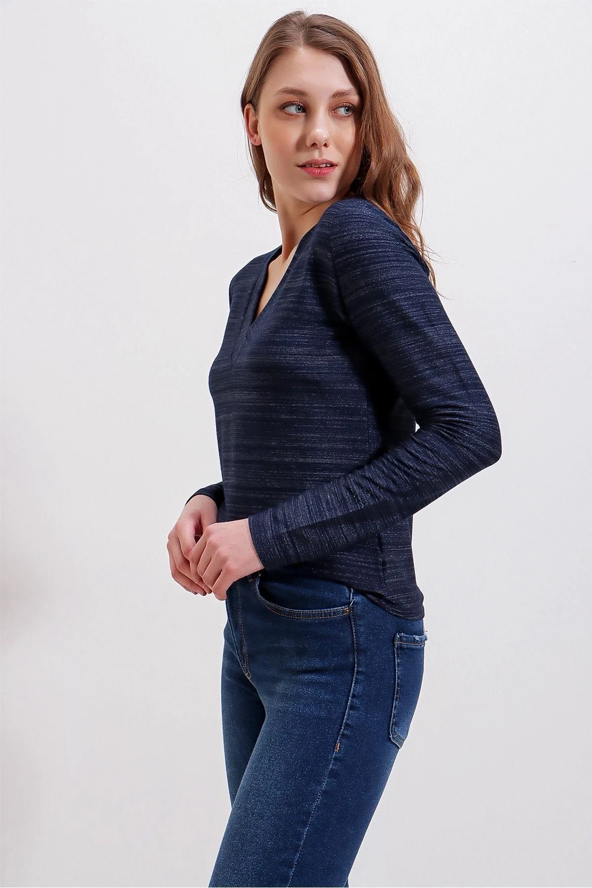 Kadın Lacivert Kendinden Dokulu V Yaka Basic Bluz (DÜZ KESİM, UZUN KOL, STANDART BOY)