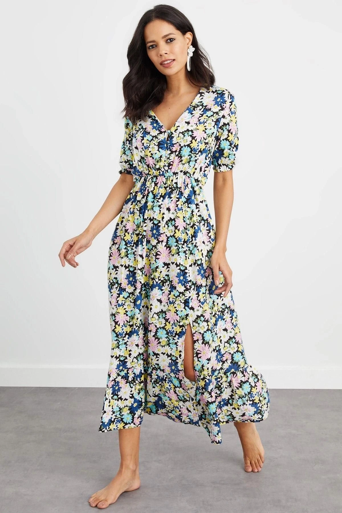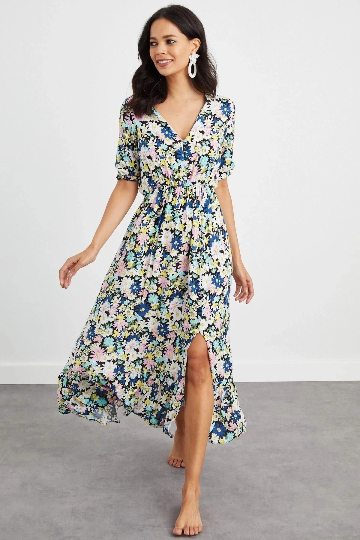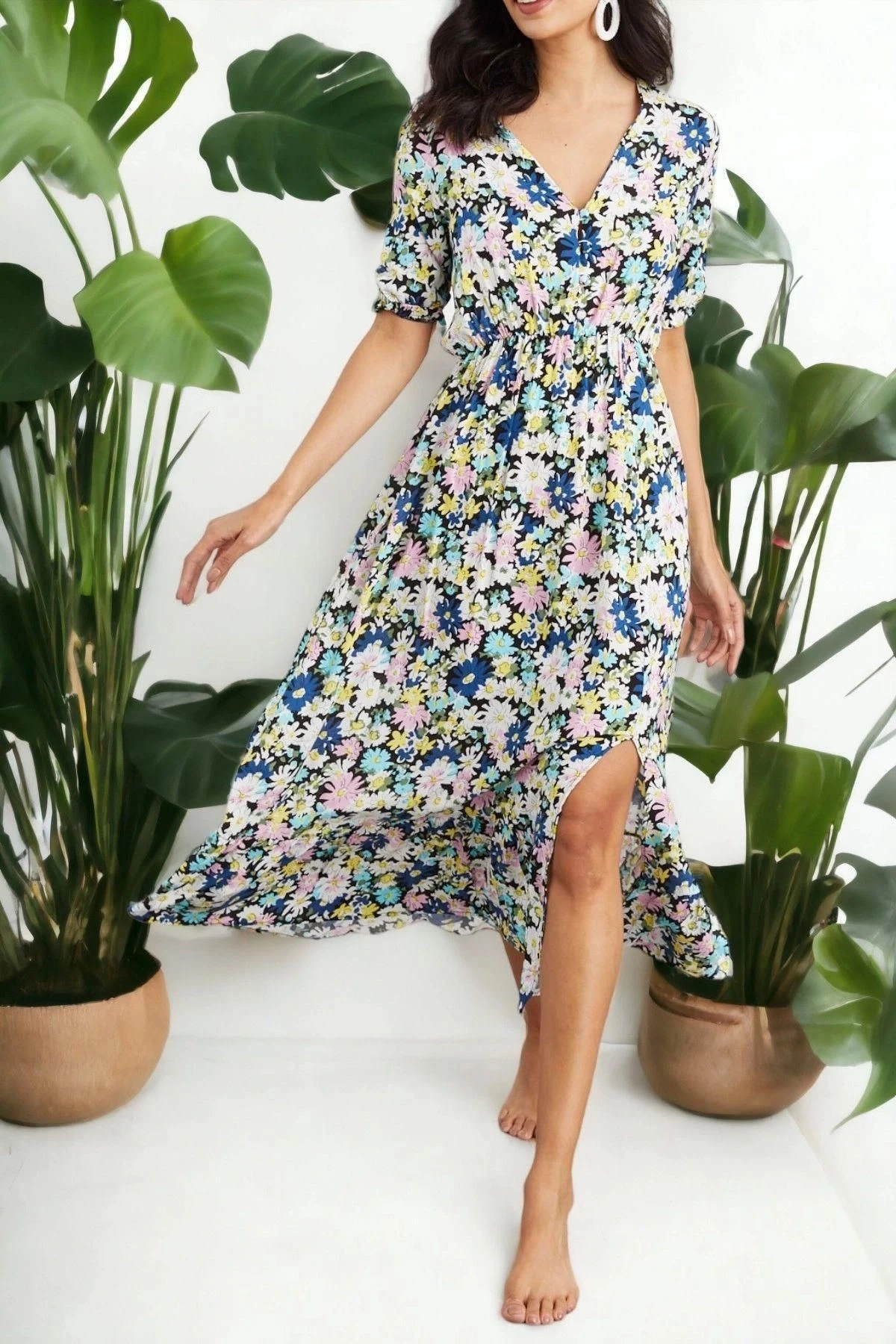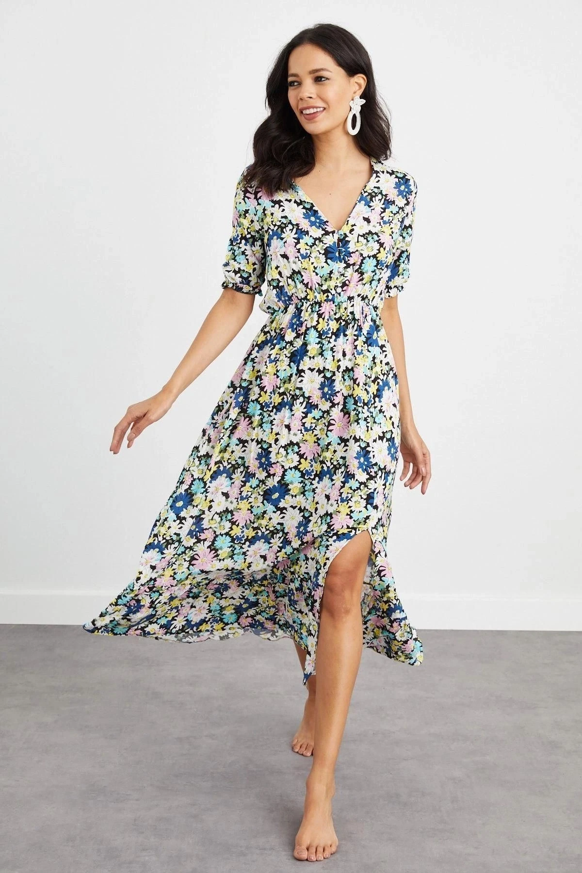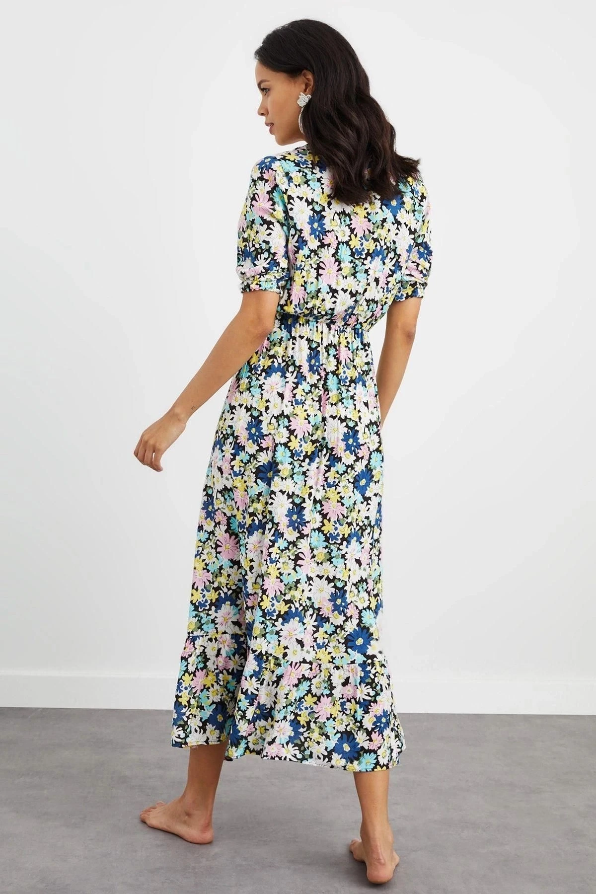 Bu mükemmel elbise, klasik bir tarza sahip olup, lacivert renkte tasarlanmıştır. ; Kaliteli bir kumaştan üretilmiştir ve içeriğinde %95 polyester ve %5 elastan bulunmaktadır. ; Bu kombinasyon, elbisenin rahatlığını ve giyim kolaylığını sağlamaktadır. ; Elbisenin yakası klasik bir yaka kesimine sahiptir ve kısa kolludur, bu da ona modern bir hava katar. ; Çiçek desenli tasarımıyla dikkat çeken elbise, canlı renklere sahip çiçek motifleriyle süslenmiştir. ; Bu desen, elbiseye zarif ve şık bir görünüm kazandırırken, aynı zamanda günlük kullanıma uygun bir tarz sunar. ; Elbisenin etek kısmında yer alan yırtmaç detayı, hareket özgürlüğünü artırırken, aynı zamanda feminen bir dokunuş sağlar. ; A kesimli maksi boyuyla, elbise vücut hatlarını saran ve aynı zamanda rahat bir kesime sahip olan bir siluet sunar. ; Bu sayede, hem şıklığınızı hem de rahatlığınızı bir arada yaşayabilirsiniz. ; Bu elbise, günlük kullanım için mükemmel bir seçenektir. ; Yumuşak ve esnek kumaşı sayesinde uzun süreli kullanımlara uygunluğunu korurken, şık ve çekici bir görünüm sunar. ; Bu sezon gardırobunuzun vazgeçilmez parçalarından biri olacak!;