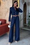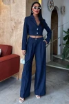 Kadın Lacivert Kruvaze Dokuma Crop Uzun Kol Takım