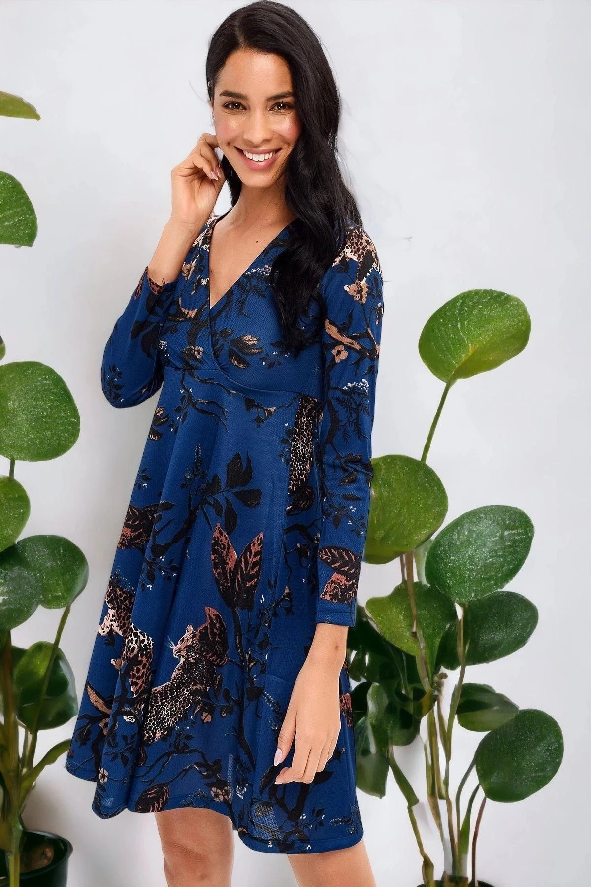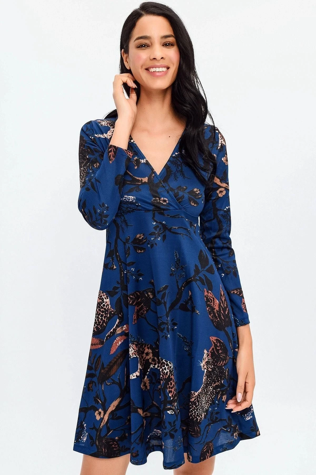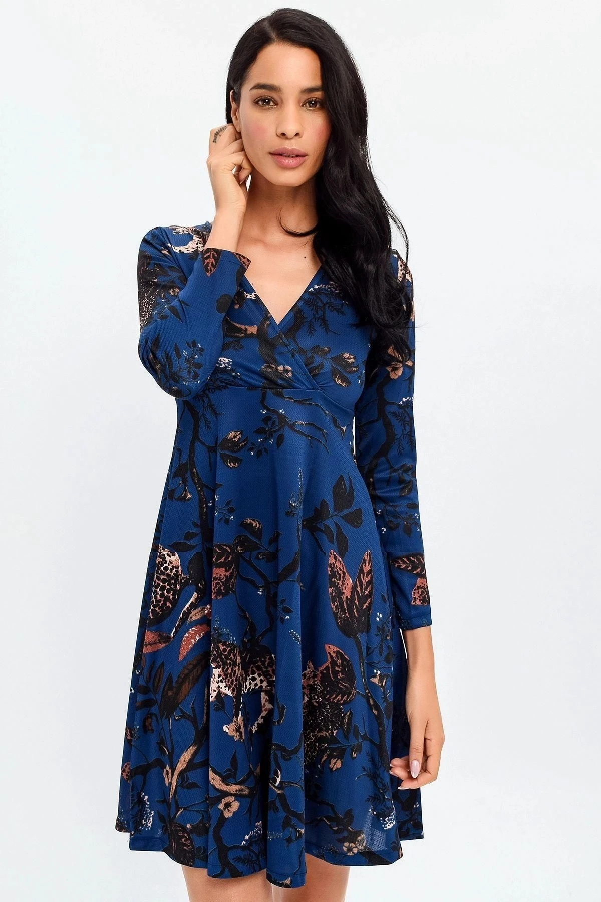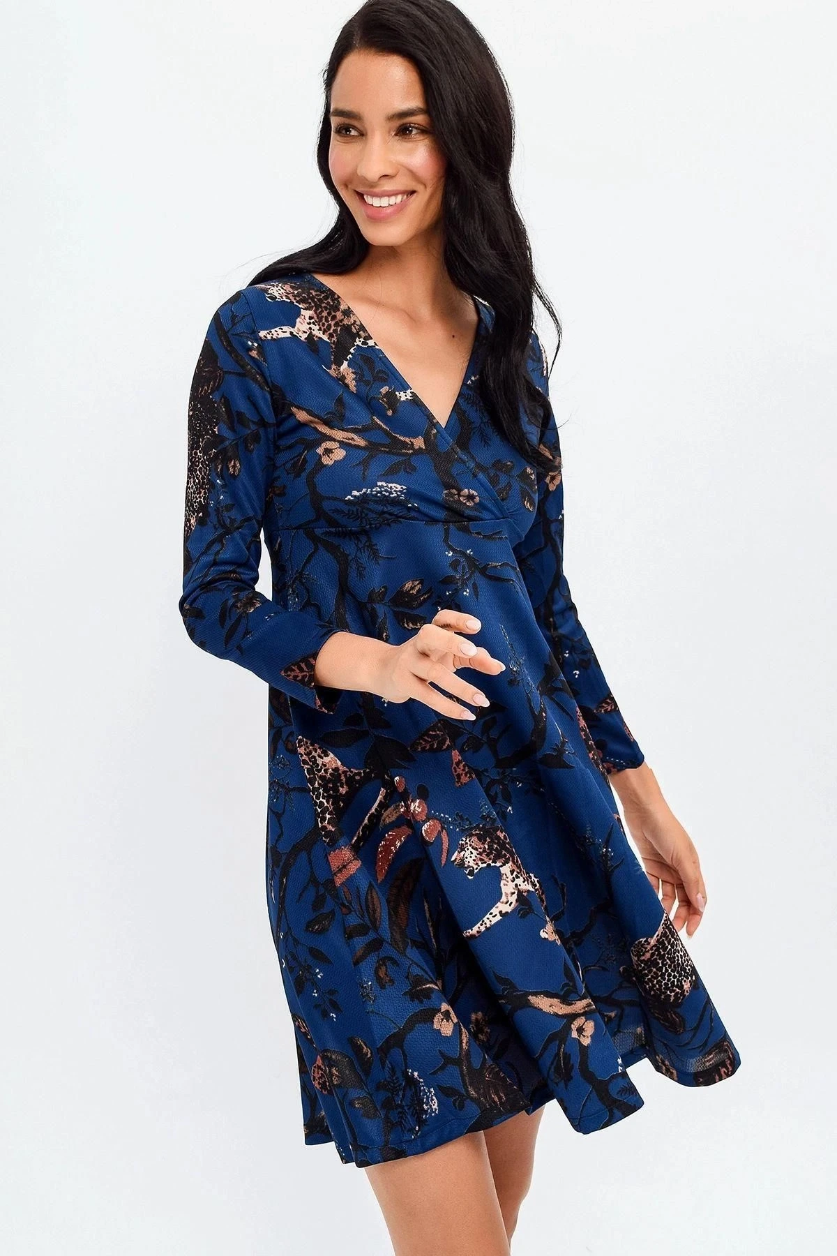 Bu zarif ve şık lacivert renkli kruvaze yaka elbise, tarzınızı tamamlayacak mükemmel bir seçenektir.; Desenli regular kesimi ve midi boyuyla, hem ofis ortamlarında hem de günlük yaşamda kendinizi özel hissetmenizi sağlar.; Bu elbisenin kumaş içeriği %95 polyester ve %5 elastan olup, mükemmel bir uyum ve rahatlık sunar.; Polyester, dayanıklı ve kolay bakım özelliklerine sahip olduğu için uzun süreli kullanım için idealdir.; Elastan ise esneklik sağlar, böylece hareket özgürlüğünüzü kısıtlamaz ve gün boyu rahatlık sunar.; Lacivert renk, klasik ve zarif bir seçimdir.; Bu renk, her mevsimde ve her durumda şık ve sofistike bir görünüm yaratır.; Kruvaze yaka detayı ise elbiseye şıklık ve cazibeli bir dokunuş katar.; Bu detay, boynunuzu zarif bir şekilde vurgulayarak sizi daha da etkileyici hale getirir.; Elbisenin desenli regular kesimi, her bedene uyum sağlamak üzere tasarlanmıştır.; Midi boyu, diz üstünde tamamlanan ve zarif bir görünüm sunan uzunlukta olup, hem profesyonel ortamlarda hem de günlük yaşamda mükemmel bir uyum sağlar.; Bu elbise, ofis ortamlarında da harika bir seçenektir.; İş gününüz boyunca profesyonel ve şık bir görünüm elde etmek için mükemmel bir tercih olacaktır.; Aynı zamanda günlük yaşamda da kullanabileceğiniz bir modeldir, şık bir akşam yemeğine veya arkadaşlarınızla buluşmaya giderken size özgüven ve tarz katacaktır.; Tüm bu özellikleriyle, bu lacivert renkli kruvaze yaka elbise, hem kaliteye önem verenler hem de şıklığından ödün vermeyenler için mükemmel bir tercihtir.; Bu elbiseyle kendinizi özel hissedecek ve her ortamda dikkatleri üzerinize çekeceksiniz.