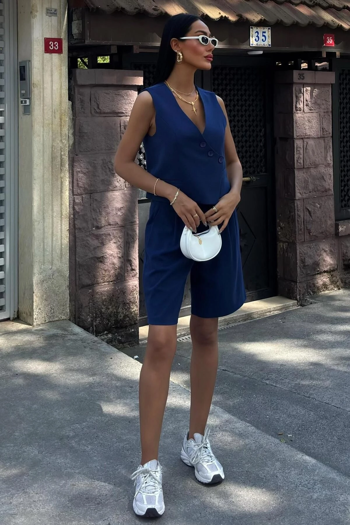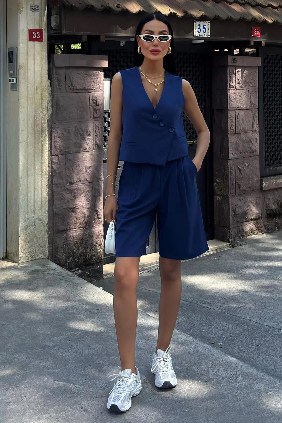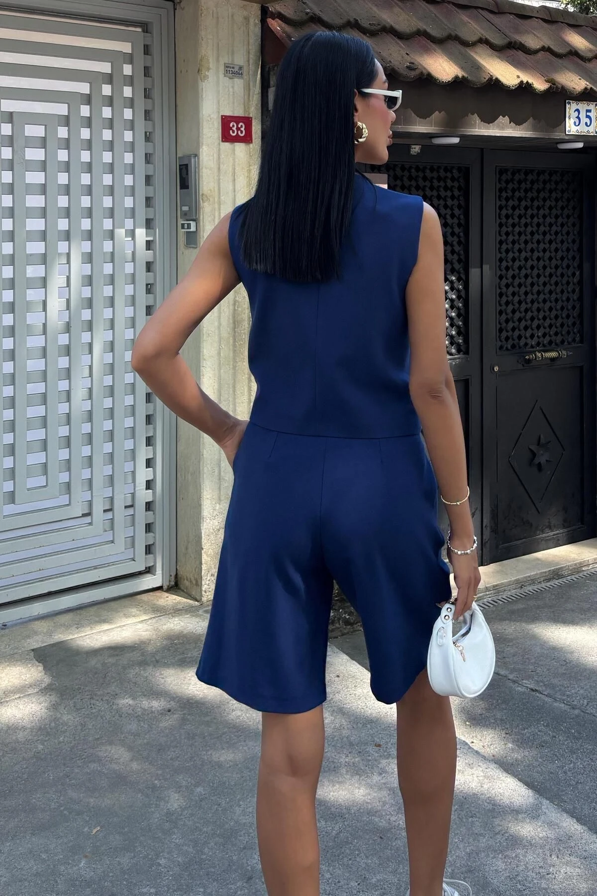 Kadın Lacivert Poliviskon Çapraz Düğmeli Kısa Takım