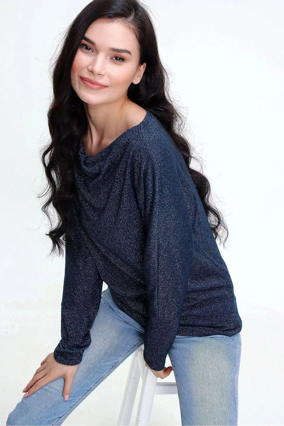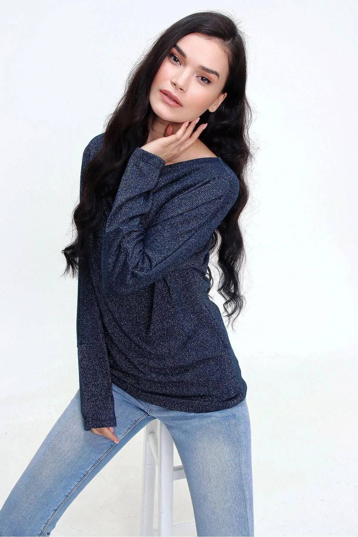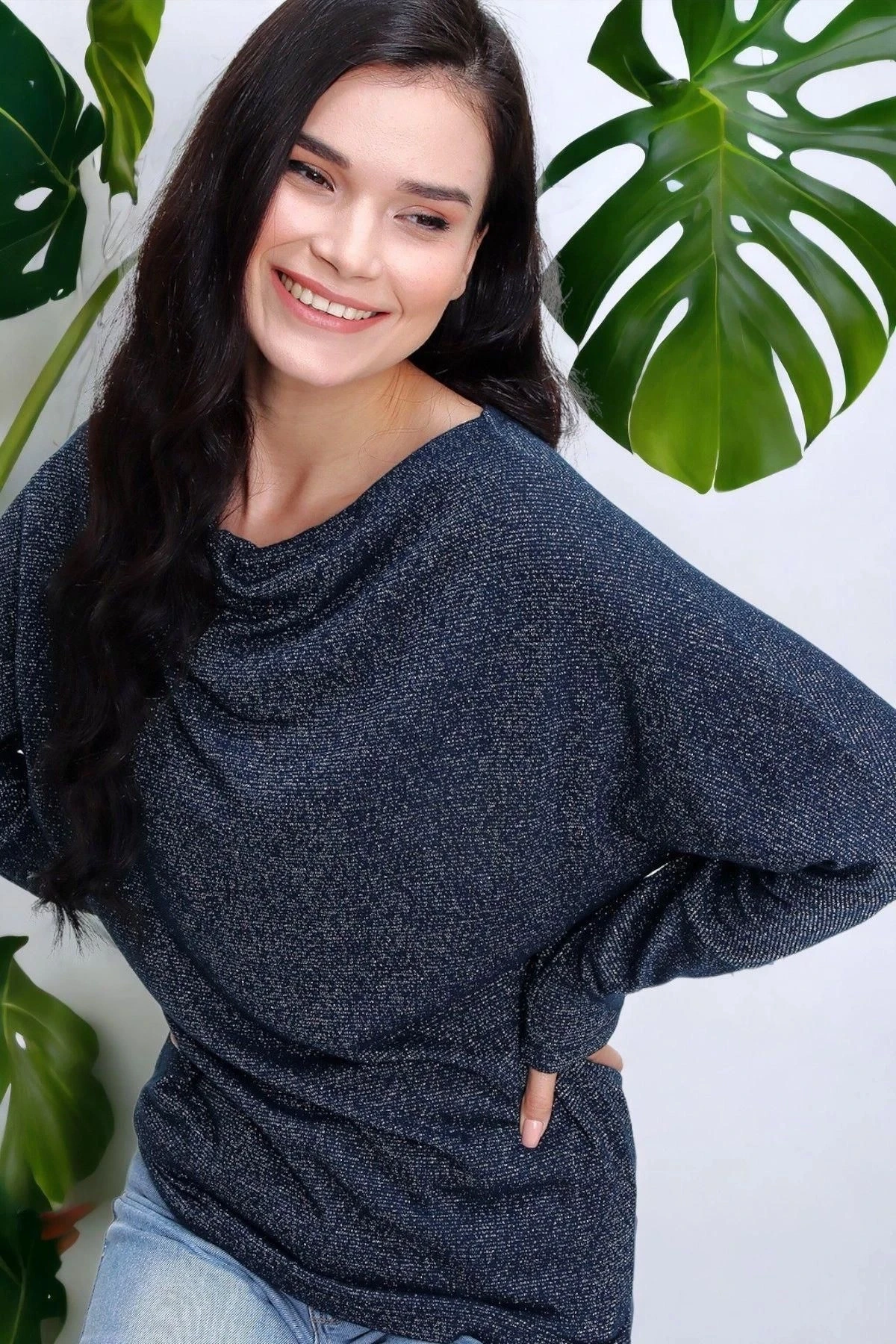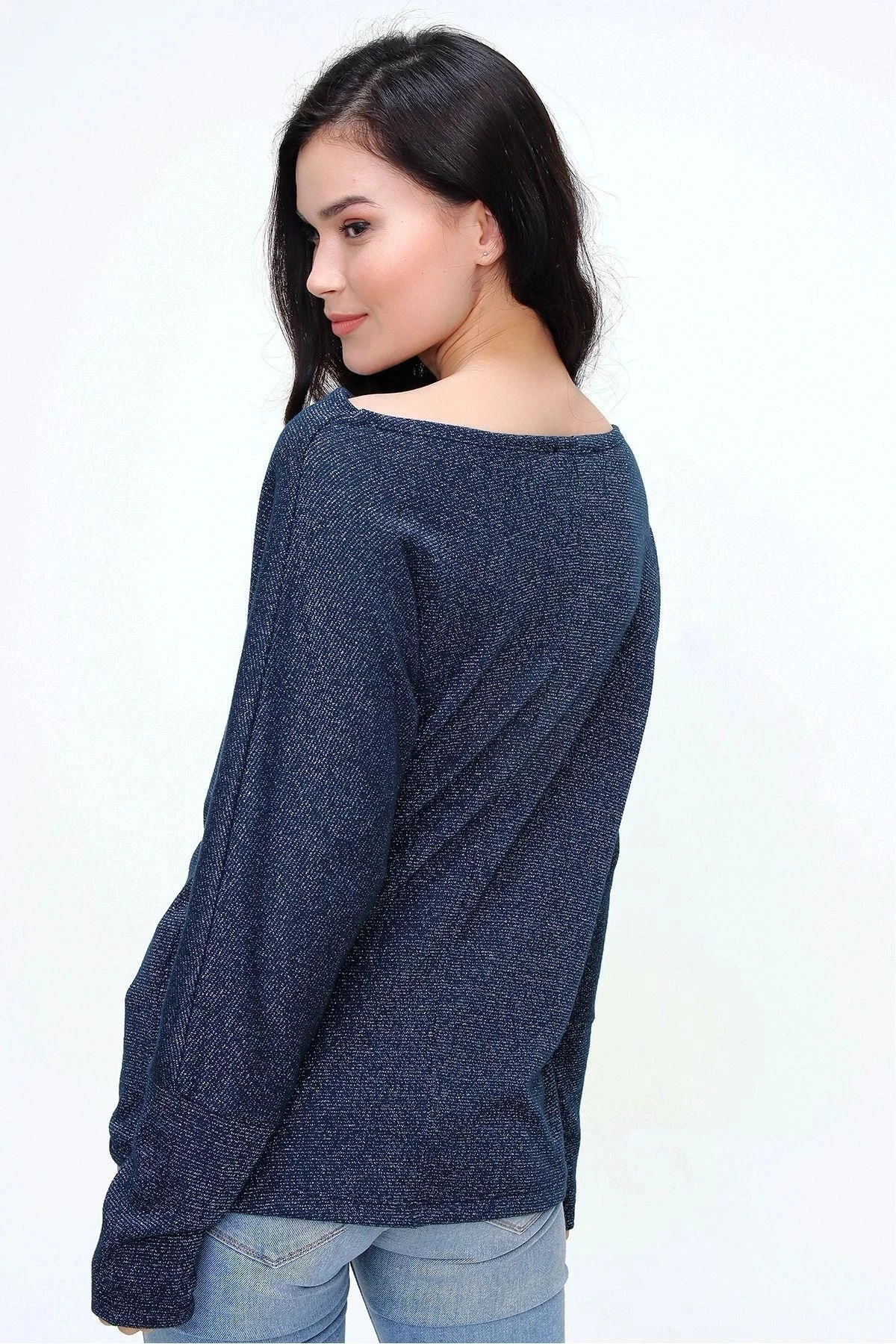 Kadın Lacivert Simli Salaş Kazak Kayık Yaka ve Degaje Yaka Uzun Kol Basic Oversize Kesim
