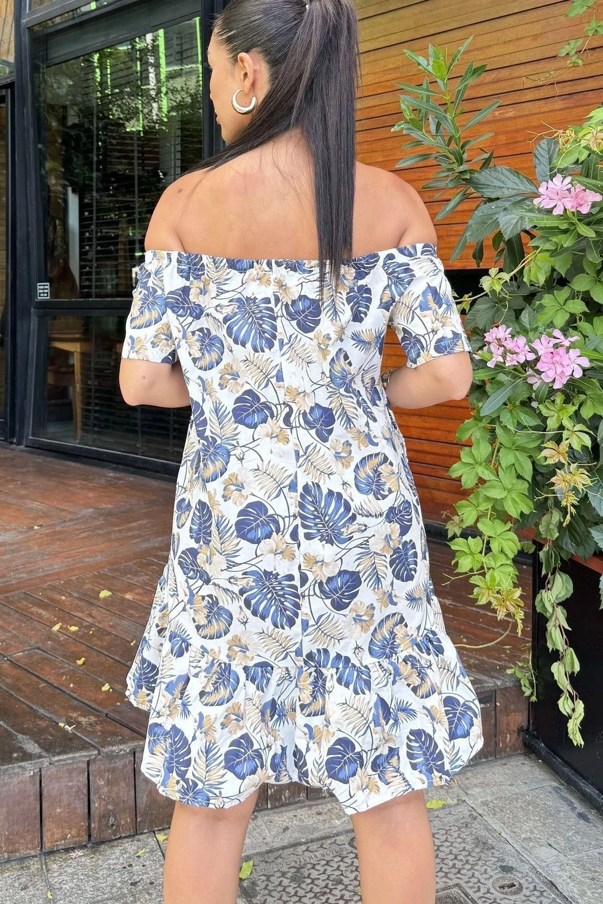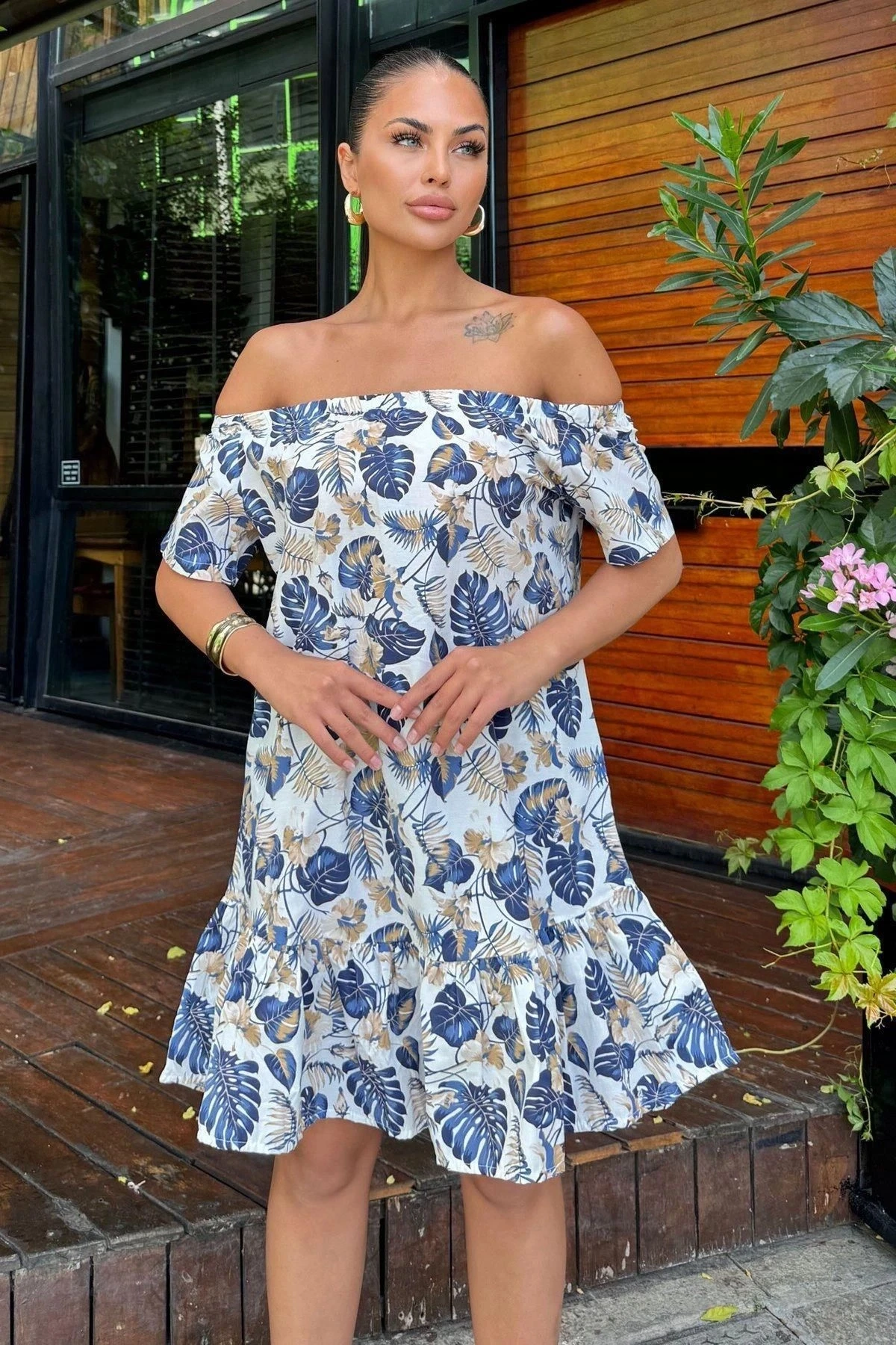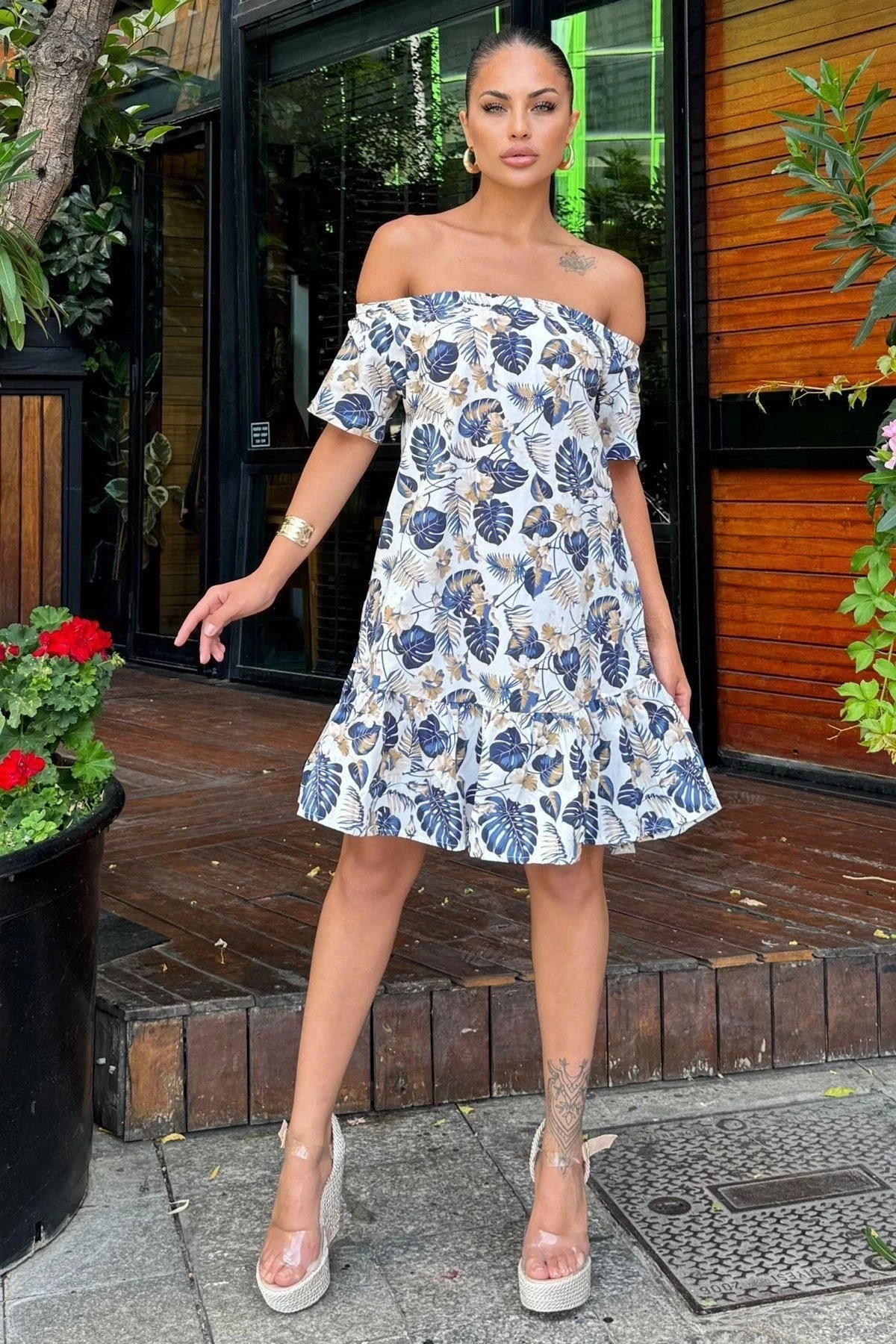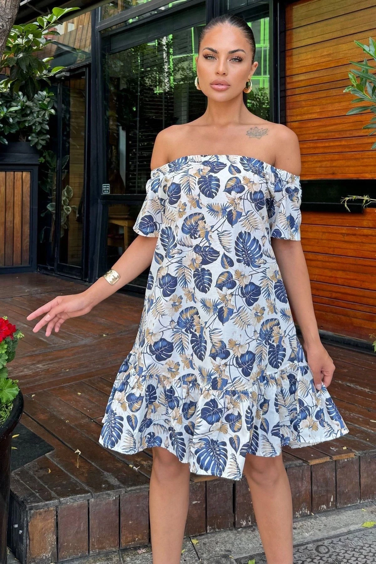 Kadın Lacivert Tropikal Yaprak Desenli, Omuzları Açık, Ruffle Etekli Yazlık Elbise