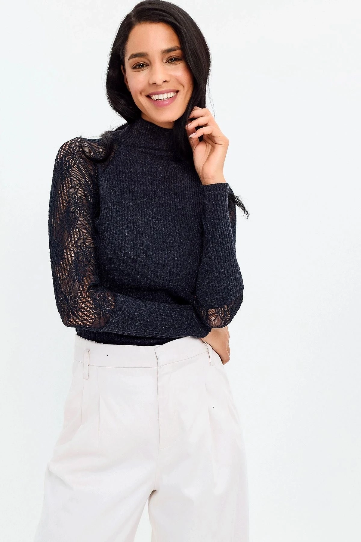 Kadın Lacivert Uzun Kol, Balıkçı Yaka, Dantel Detaylı, , Düz Kesim, Standart Boy Bluz