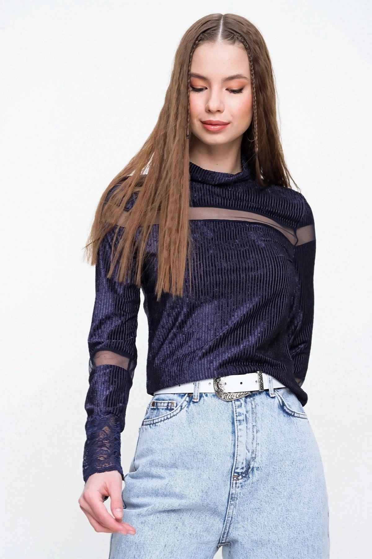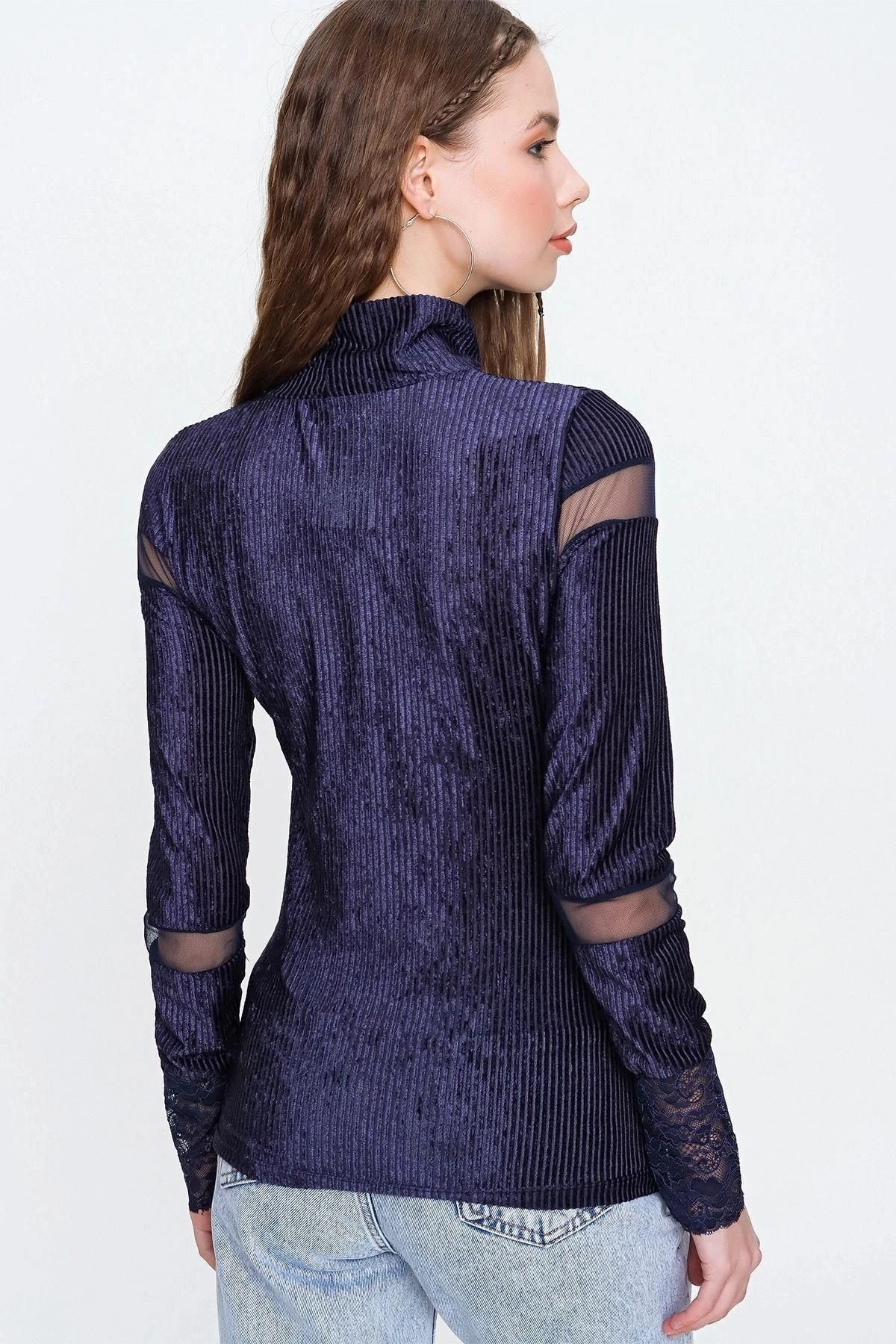 Kadın Lacivert Uzun Kol Tül Detaylı Yumuşak Dokulu Kadife Kumaş Boğazlı Bluz - , Standart Boy