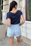 Kadın Lacivert Yarım Kol, Geniş Yaka, Tek Cepli, Beli Lastikli Rahat Crop Bluz