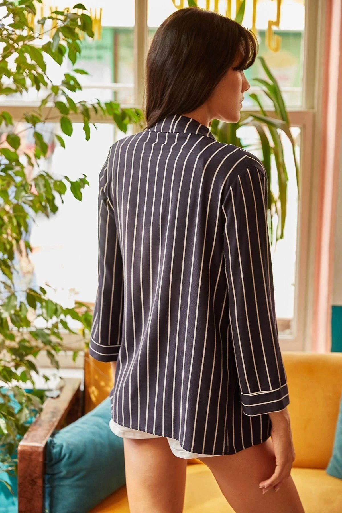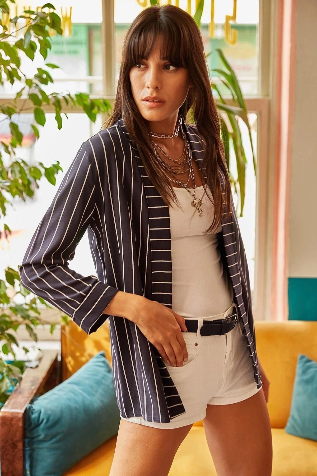 Kadın Lacivert Yuvarlak Yaka, Uzun Kol, Düğmesiz, Çizgili, Regular Kesim, Standart Boy Ceket Kimono