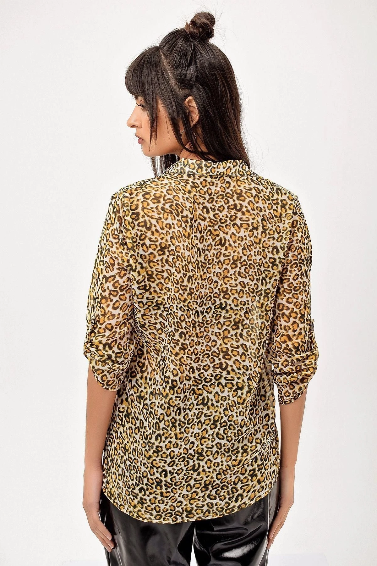 Kadın Leopar Desen Klasik Yaka Uzun Kol Patchwork Desenli Regular Kesim Standart Boy Gömlek
