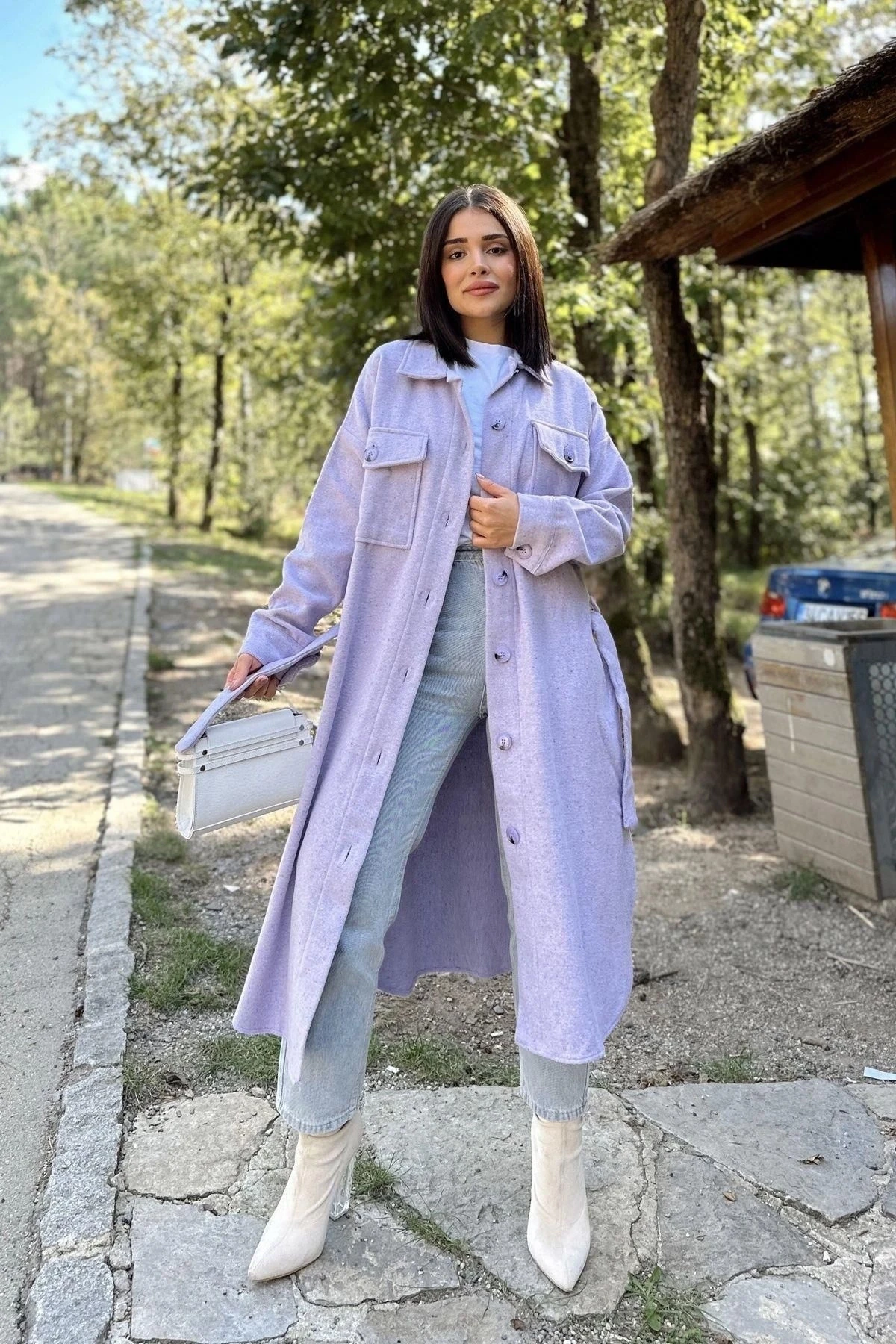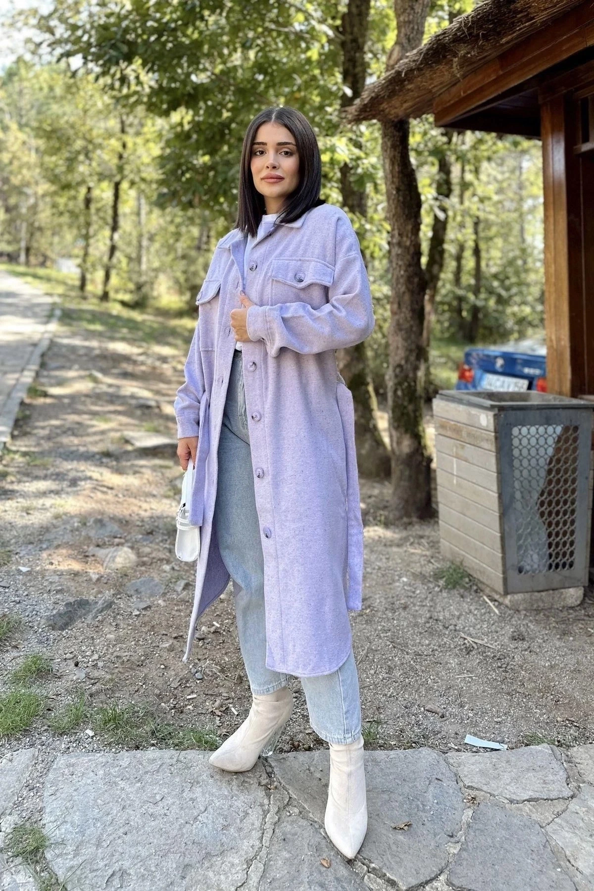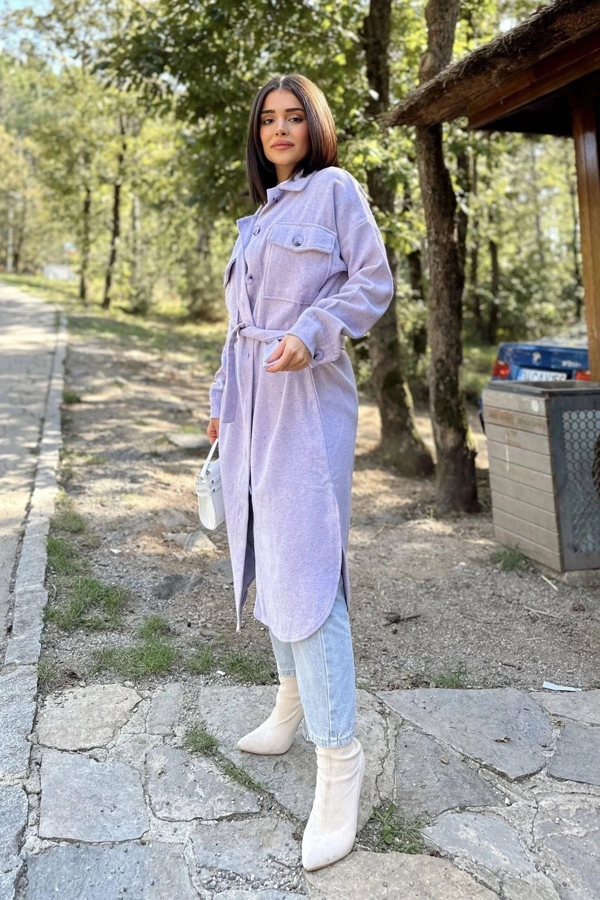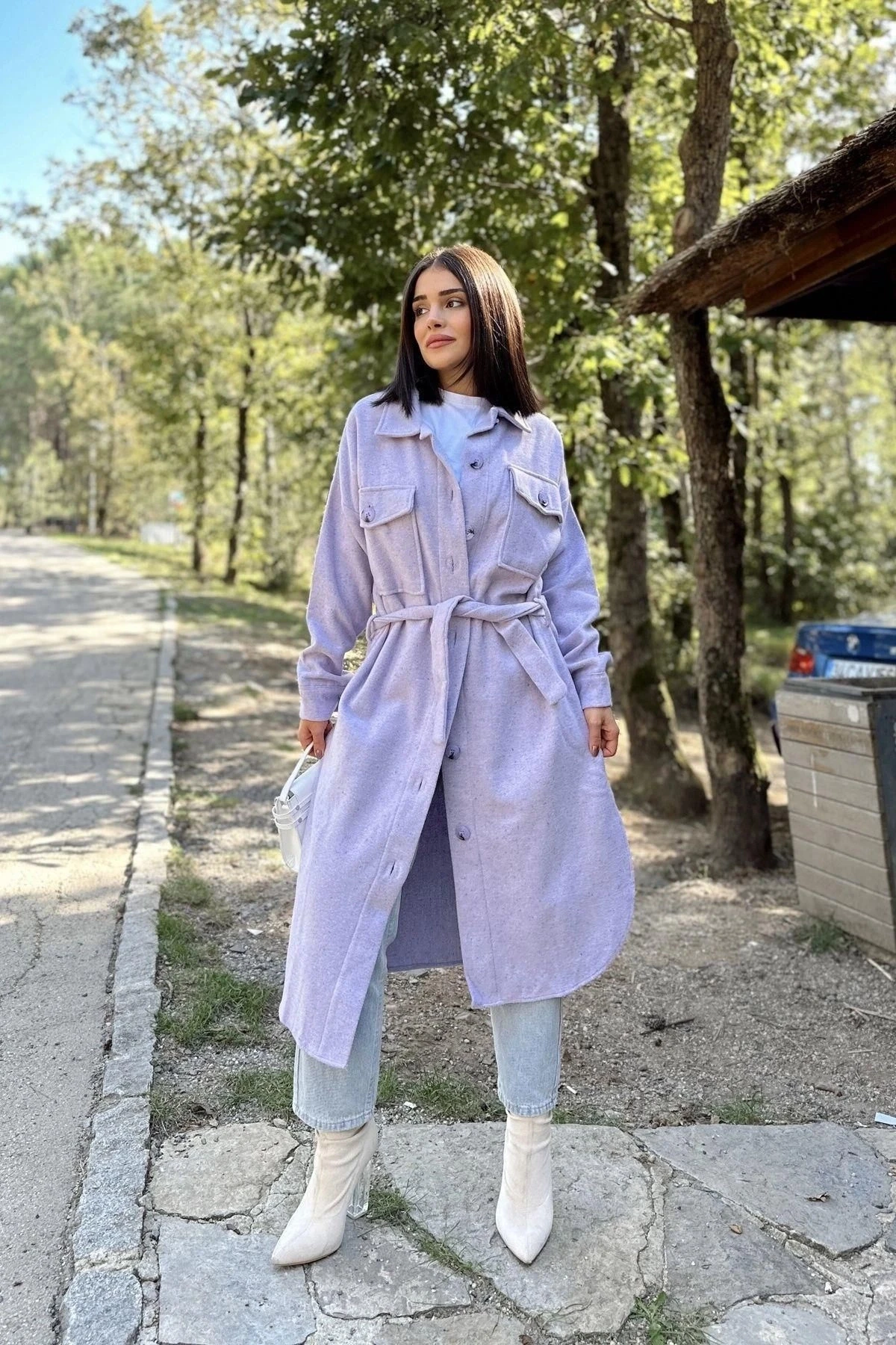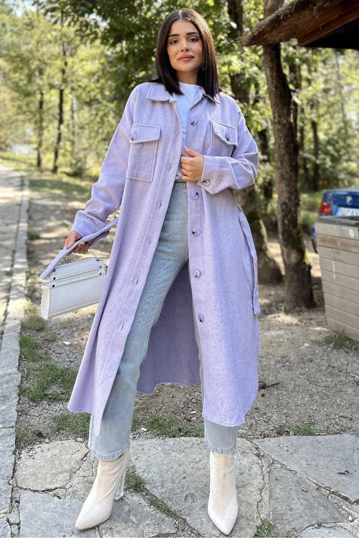 Kadın Lila Uzun Kol, Çift Cepli, Eteği Oval Kesim, Kemerli, Kaşe Gömlek Kaban