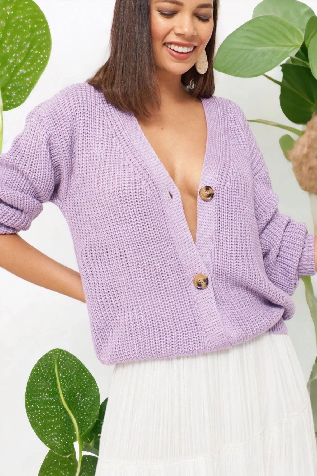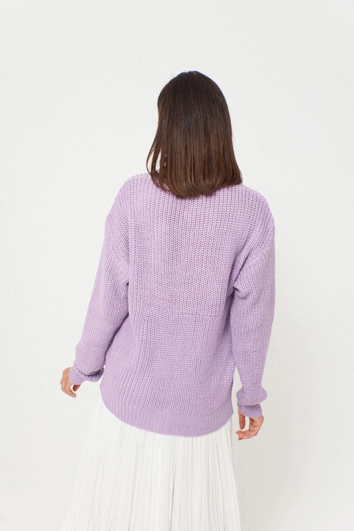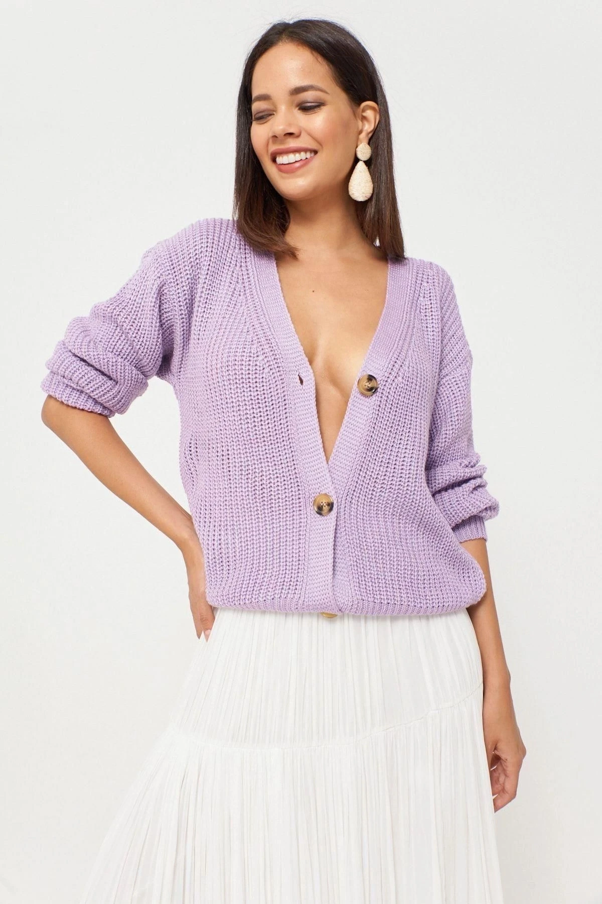Kadın Lila V Yaka Uzun Kol Basic, Düğmeli Düz Kesim Standart Boy Hırka