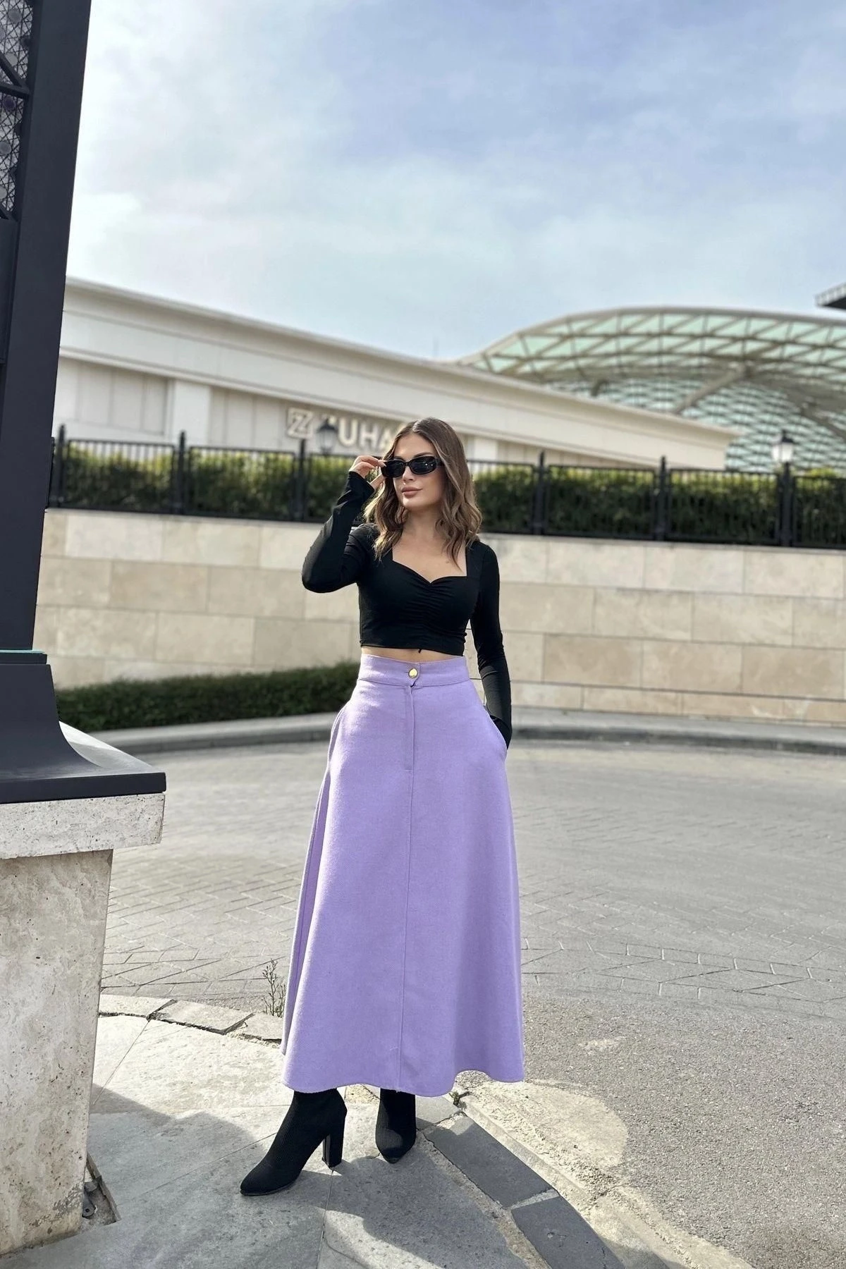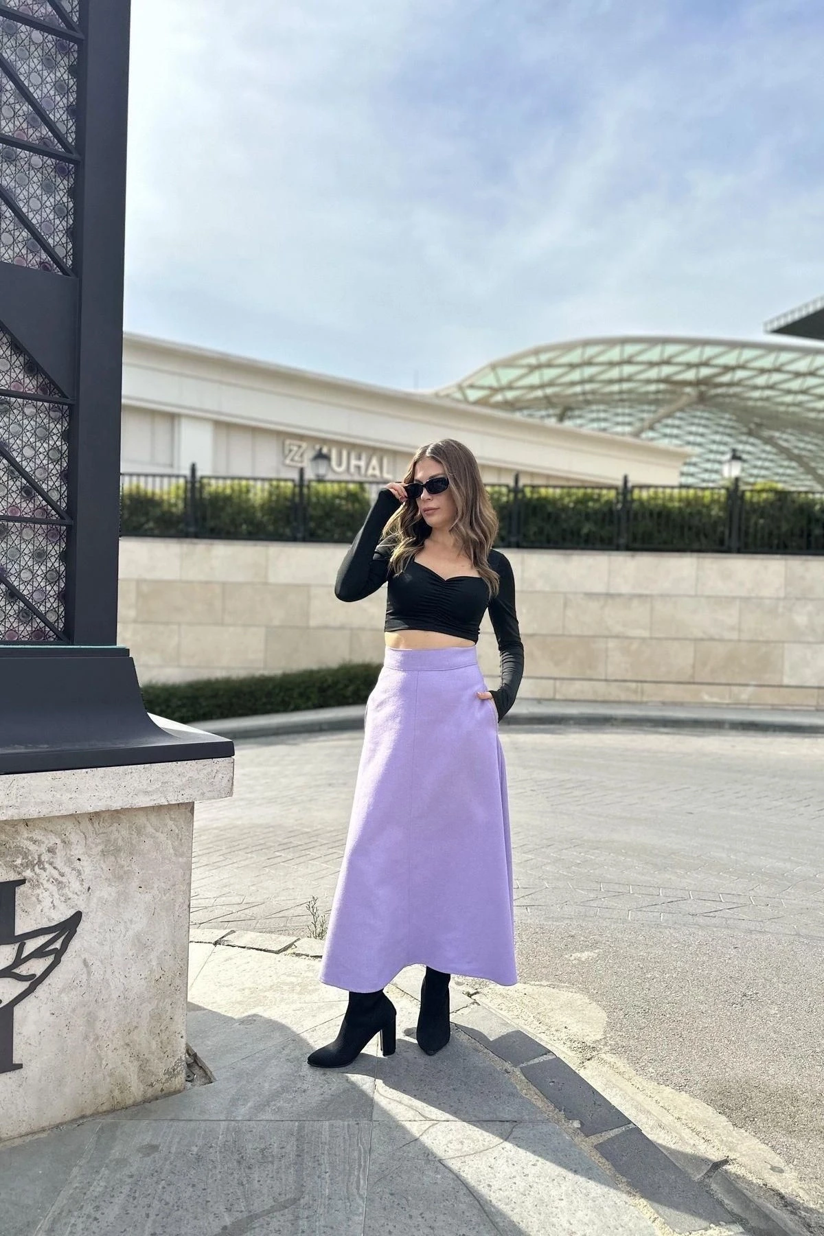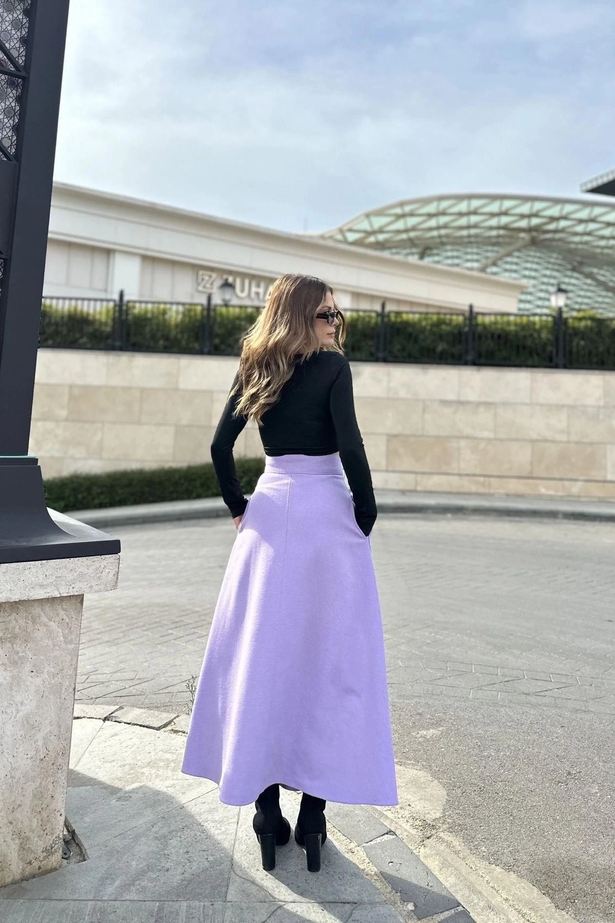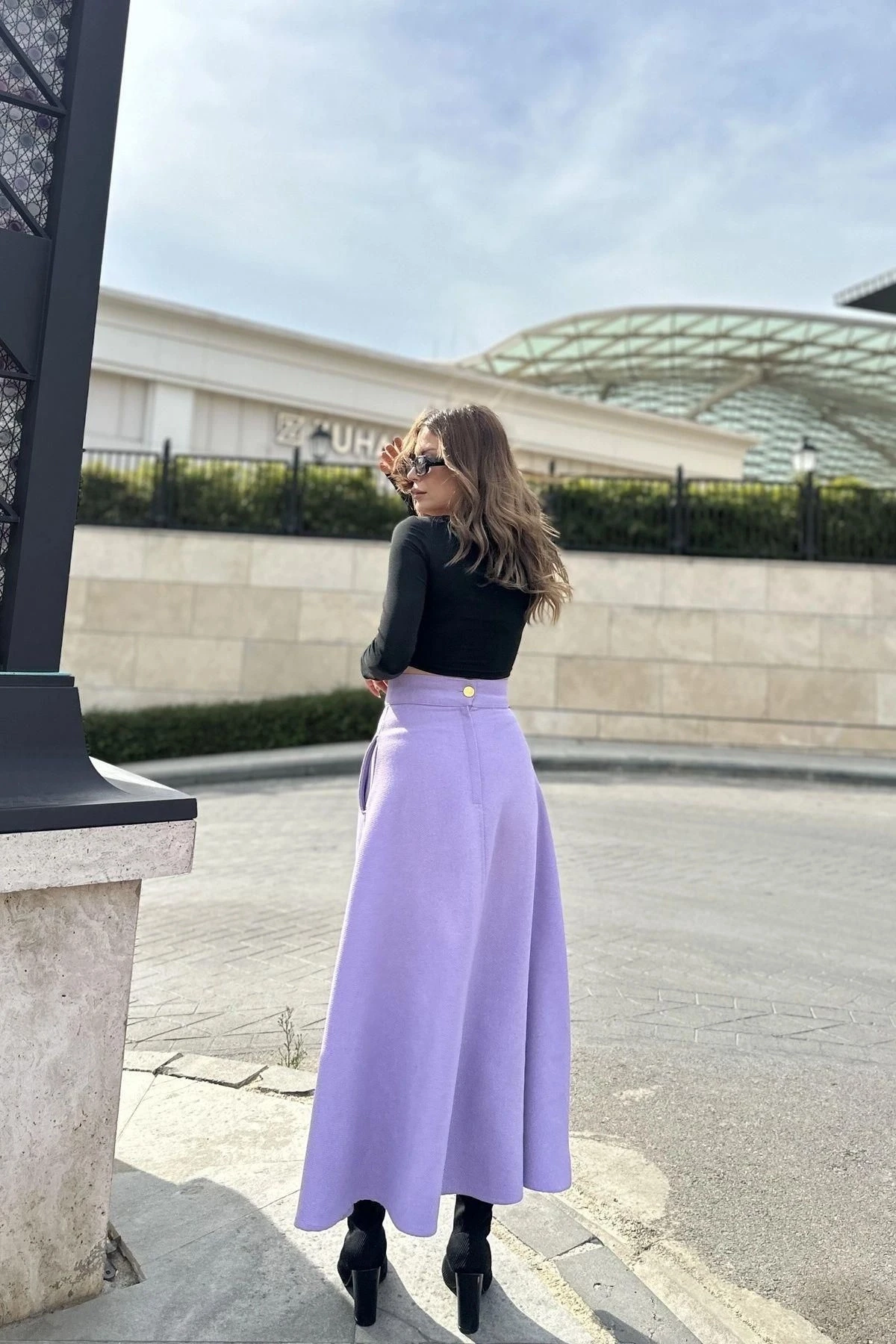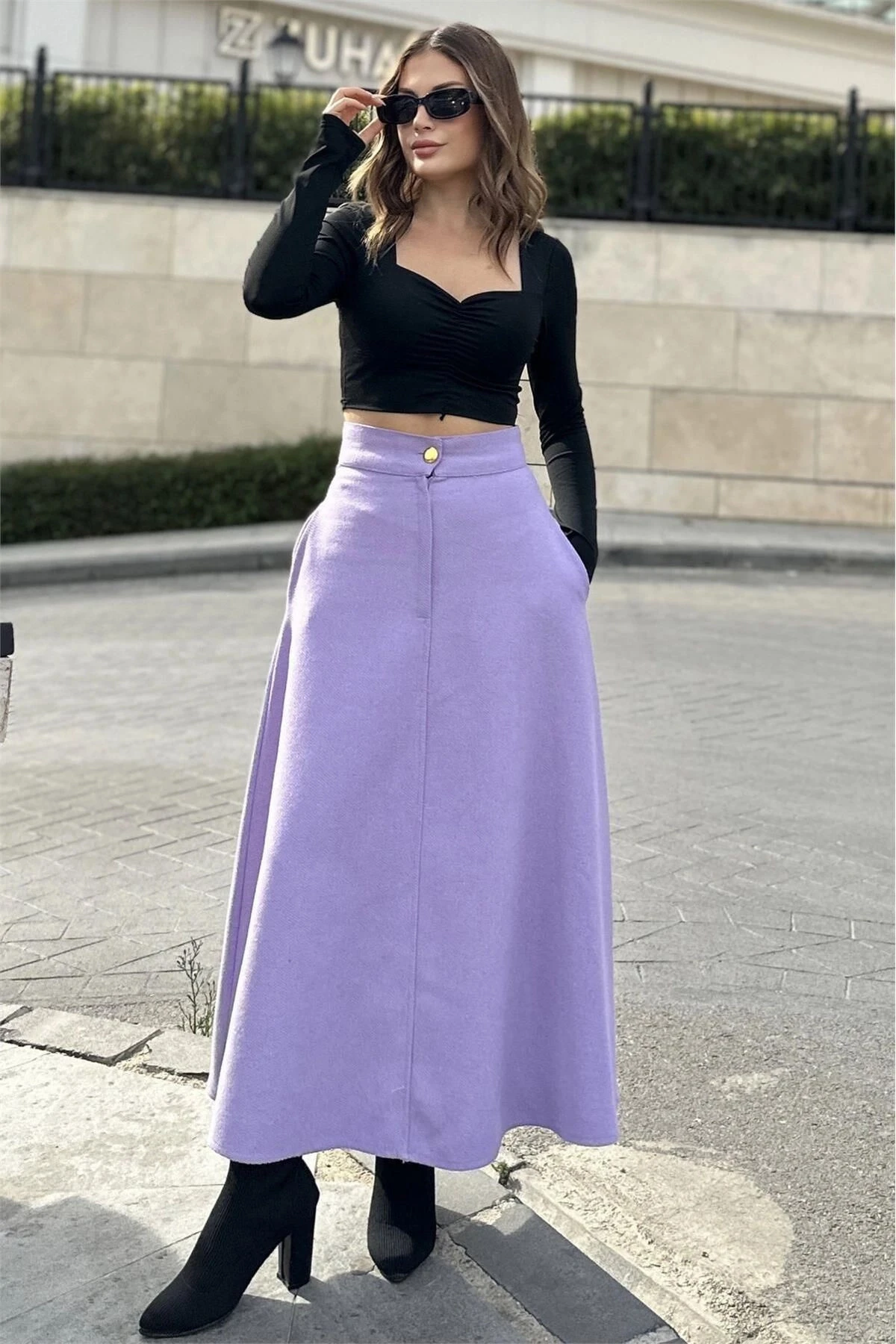 Kadın Lila Yüksek Bel, Cepli, Uzun, Fitilli Kaşe Kumaş, Maksi Kiloş Etek (DAR KALIP)