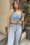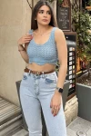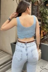 Kadın Mavi Ajurlu Merserize Triko Örme, Terletmez, Askılı Crop Bluz