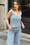 Kadın Mavi Ajurlu Merserize Triko Örme, Terletmez, Püskül Detaylı, Kalın Askılı Bluz