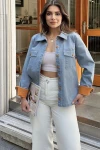 Kadın Mavi Arkası Çiçek Nakış İşlemeli, Kontrast Renk Katlamalı, Uzun Kol, Denim Kot Ceket