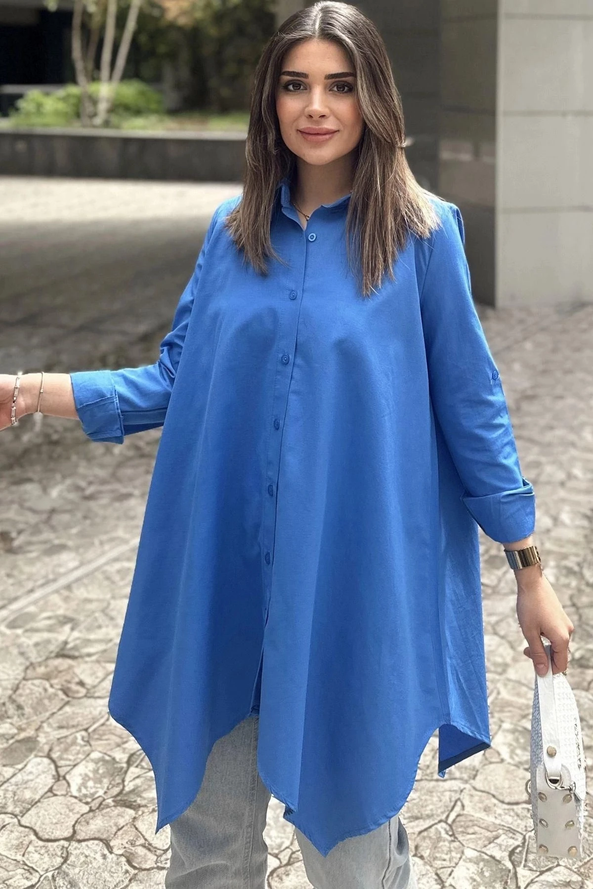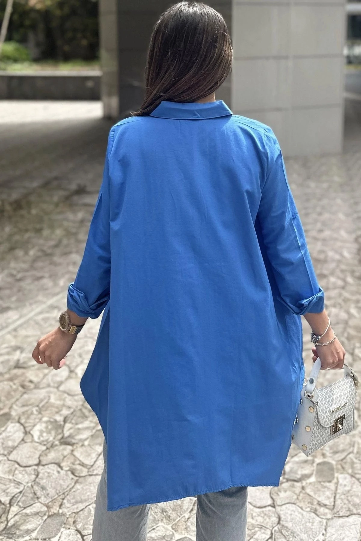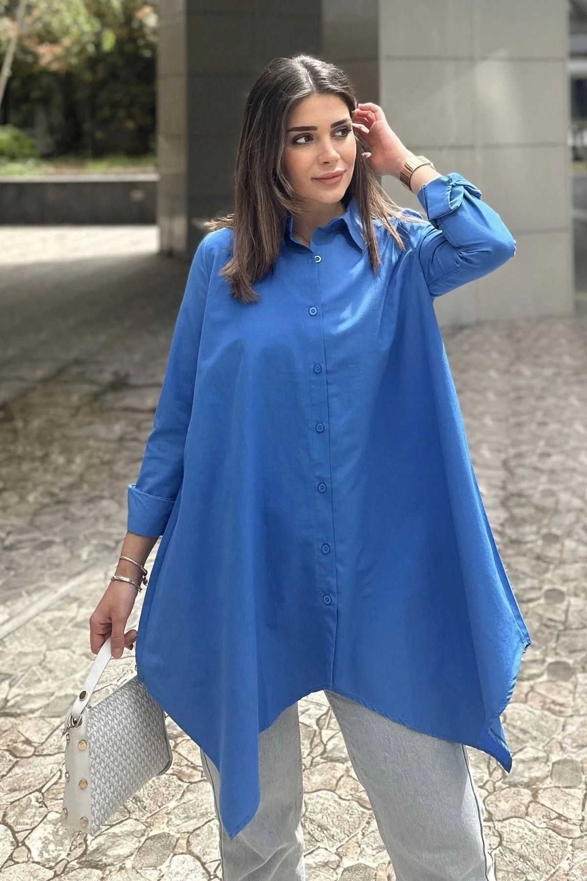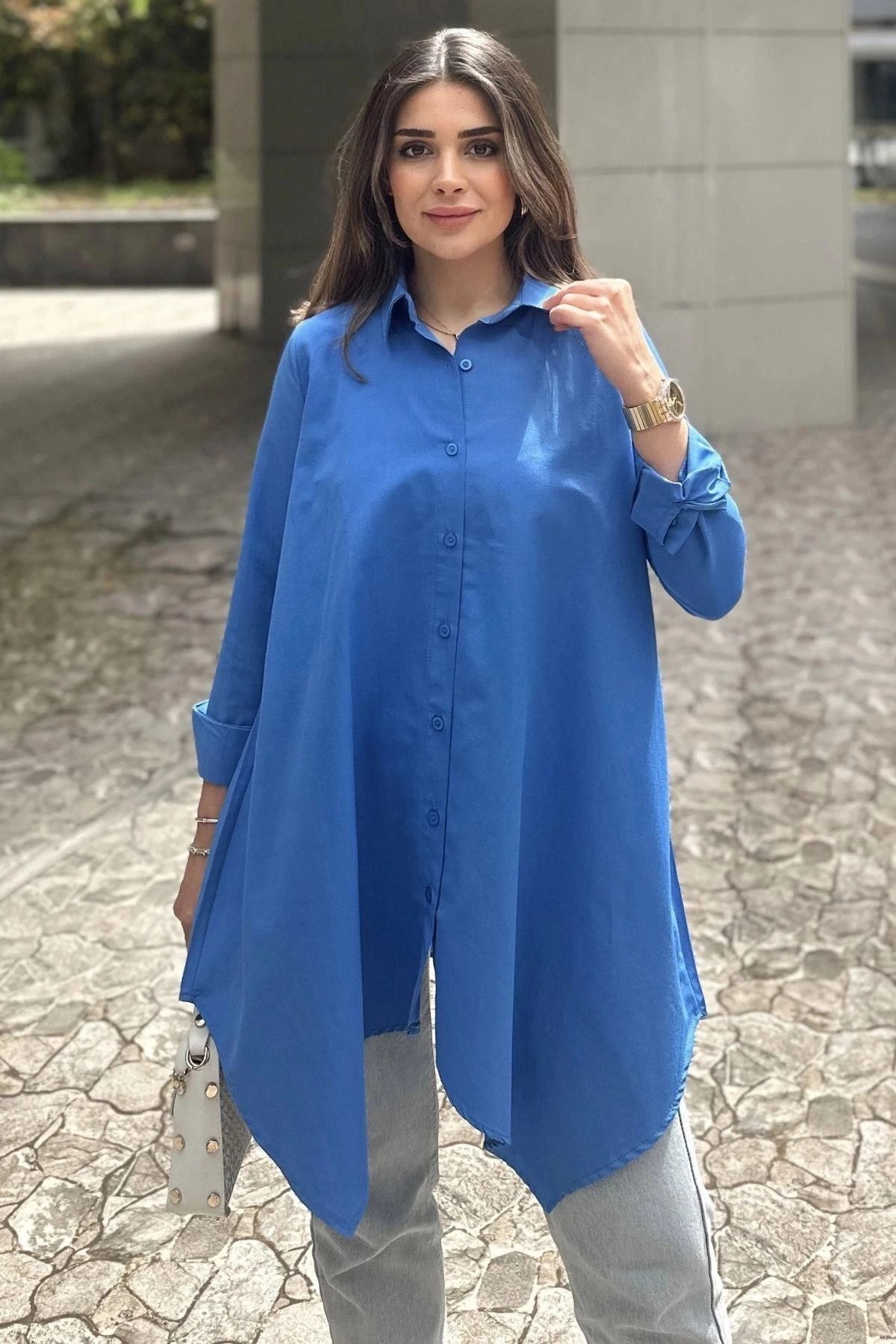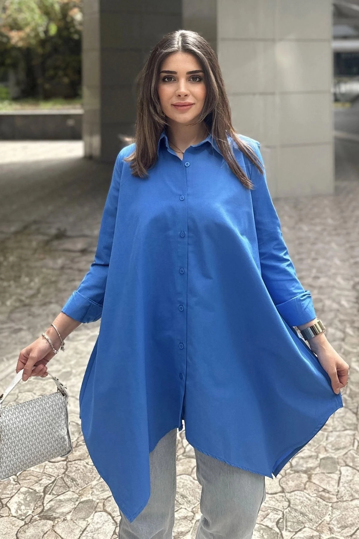 Kadın Mavi Asimetrik Kesim, Uzun Kollu, Pamuklu Salaş Tunik Gömlek