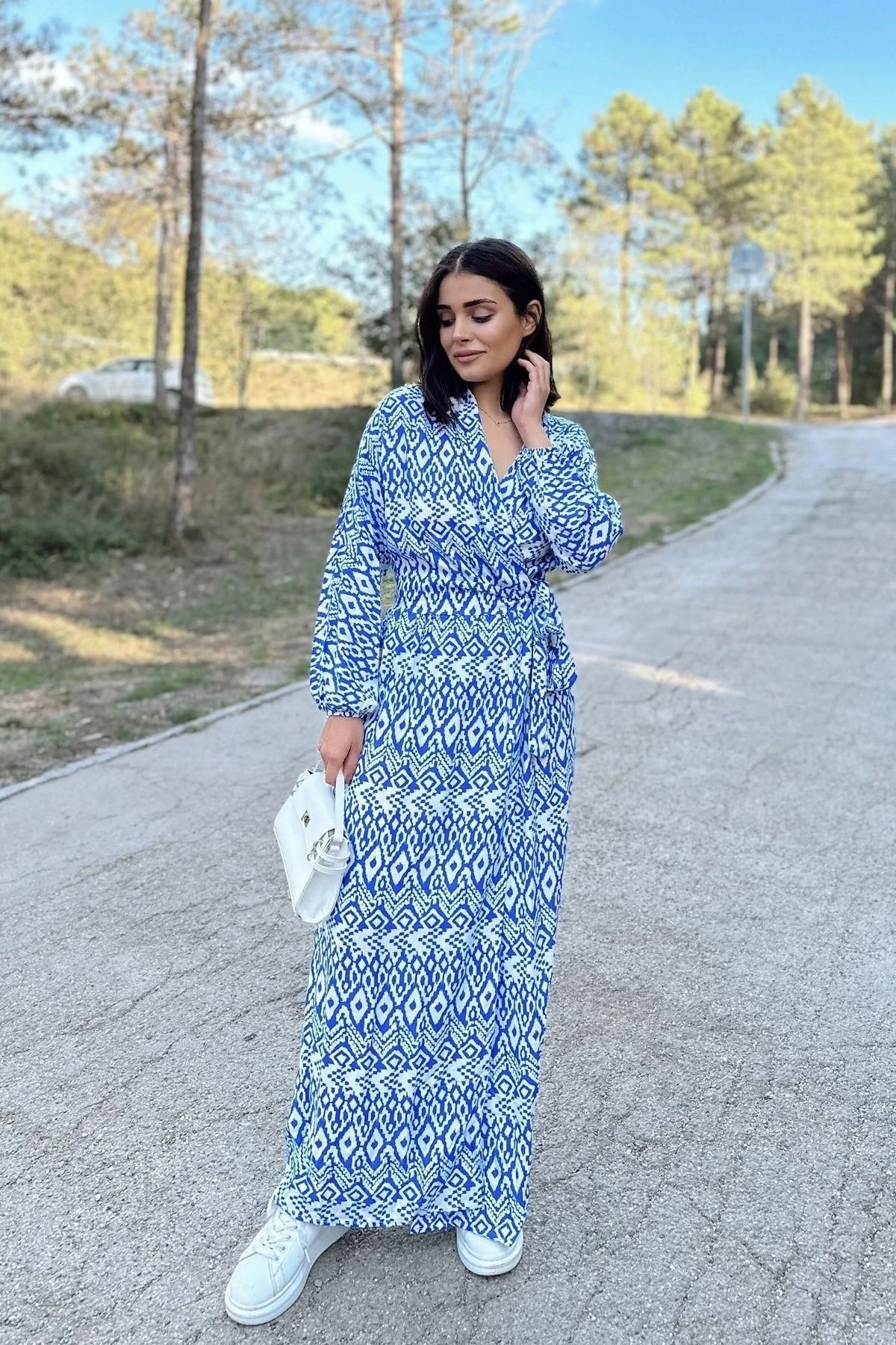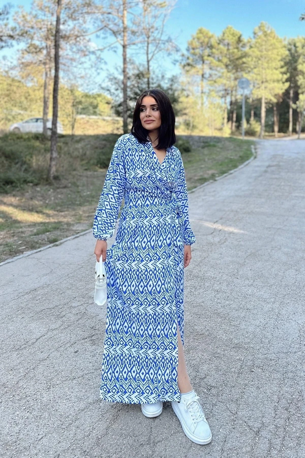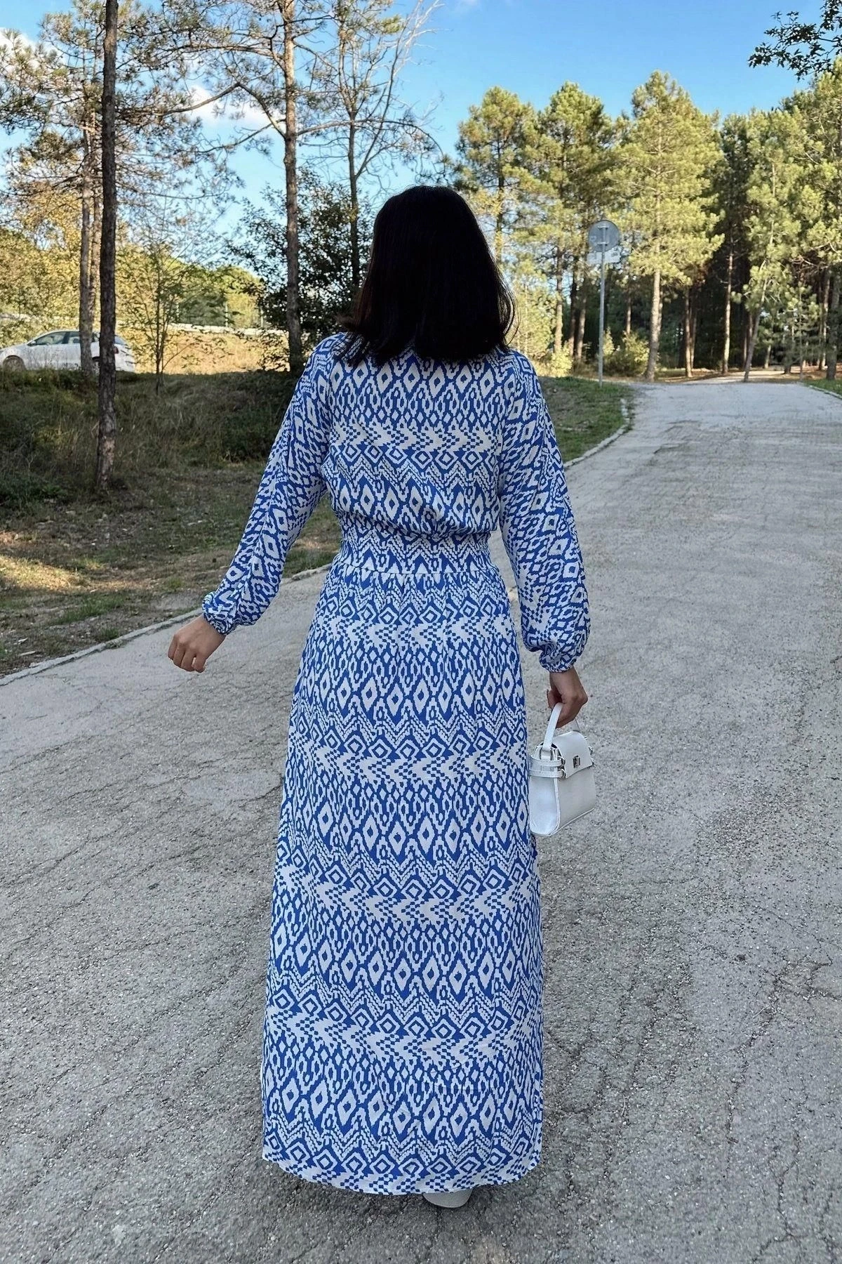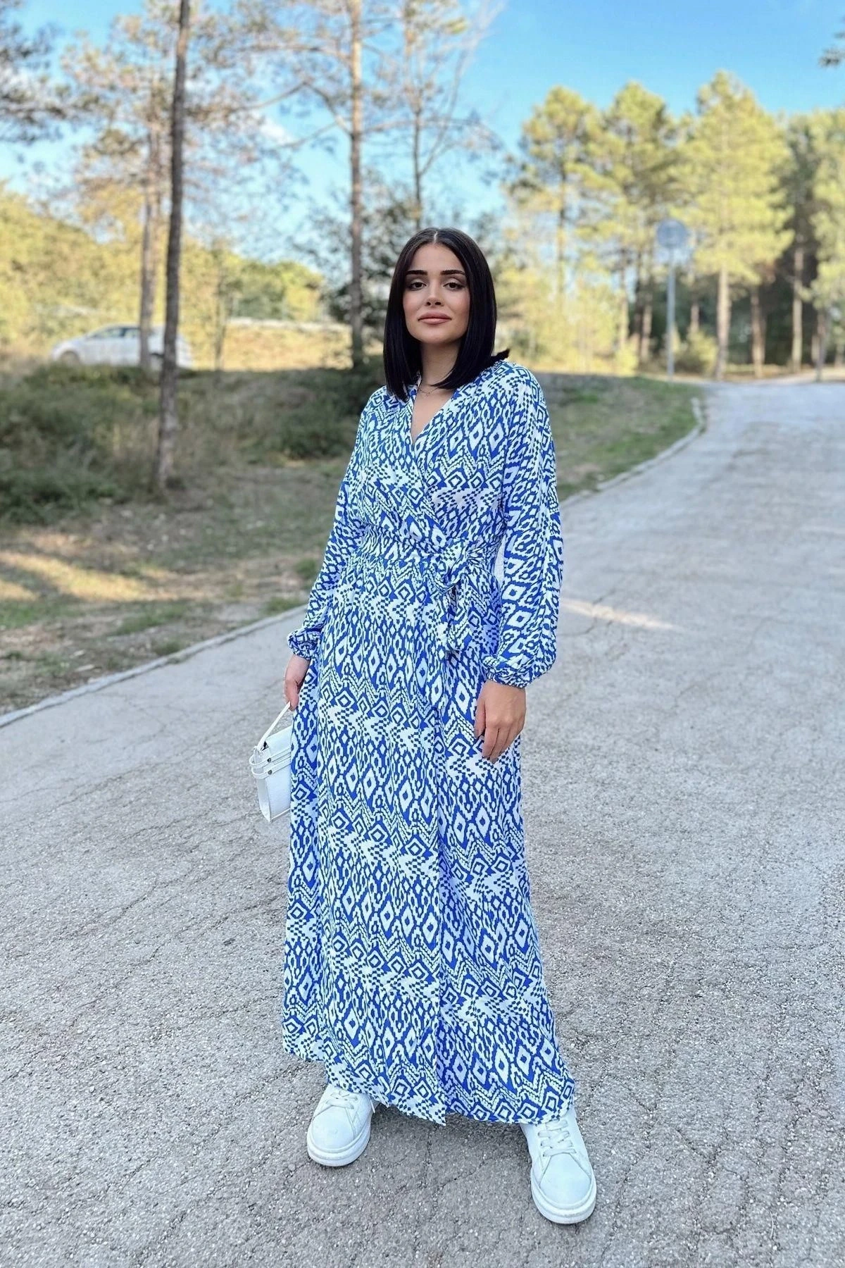 Kadın Mavi & Beyaz Kruvaze Yaka, Yırtmaçlı, Beli Kuşaklı, Bilekleri Lastikli, Salaş, Uzun Elbise