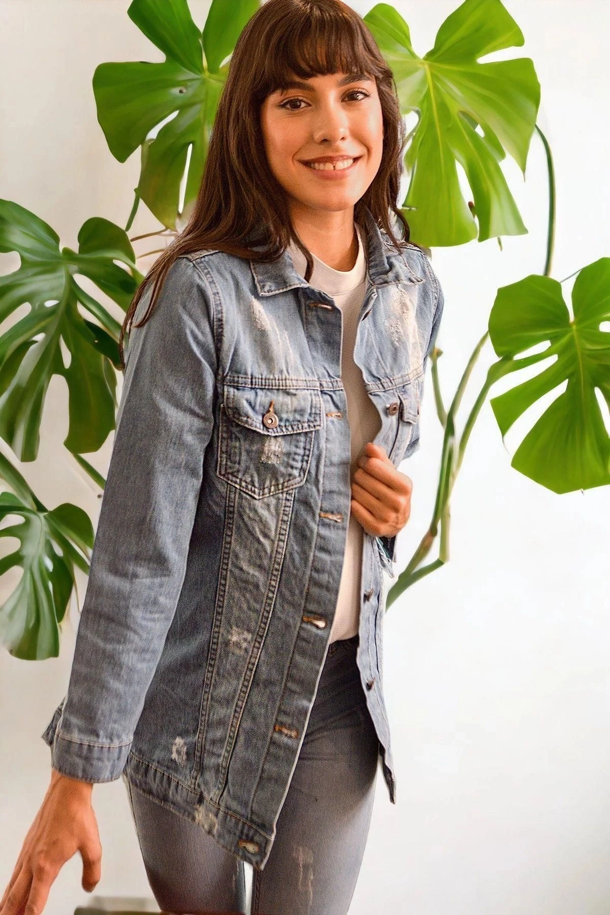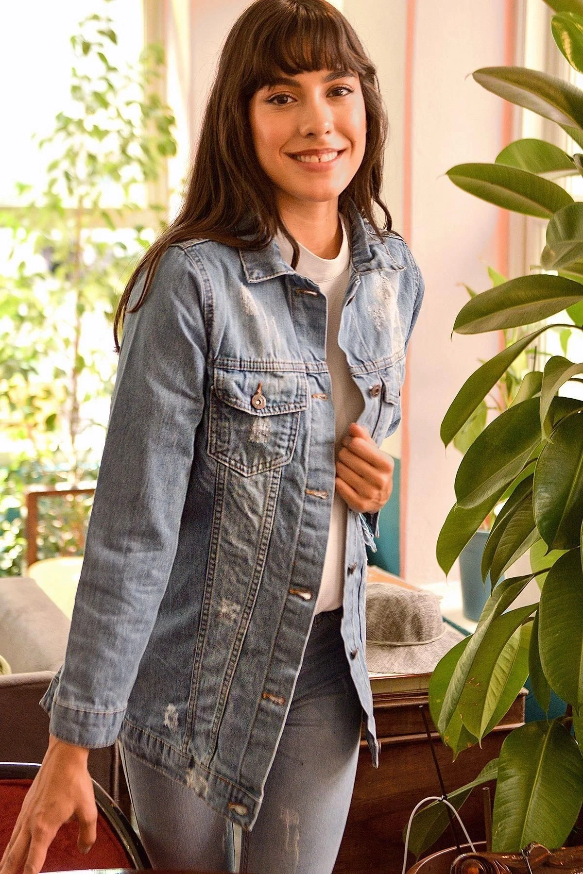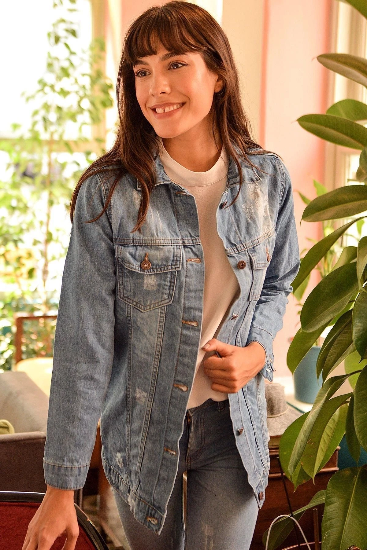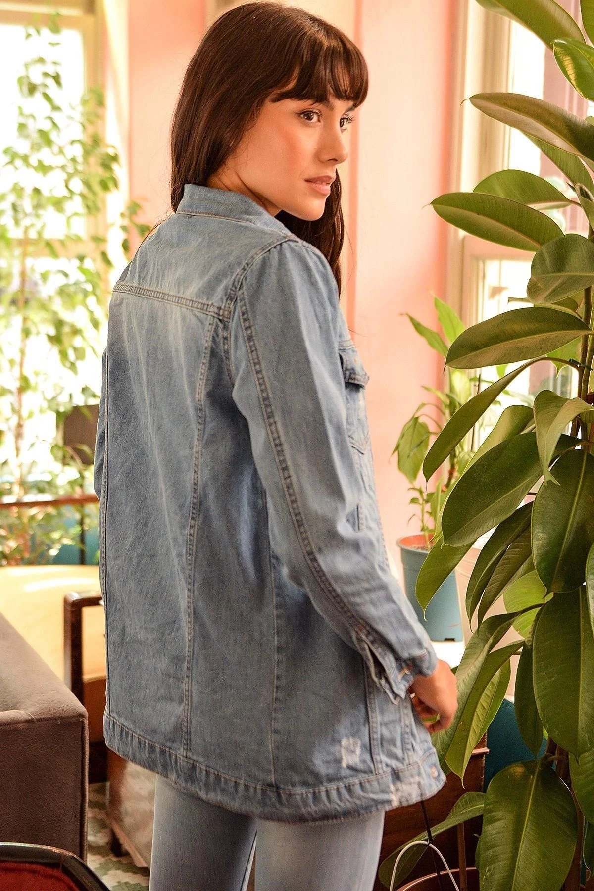 Kadın Mavi Ceket Yaka, Uzun Kol, Cep Detaylı, Jean Kot Kaliteli Kumaş, Düz Kesim, Maksi Boy Ceket