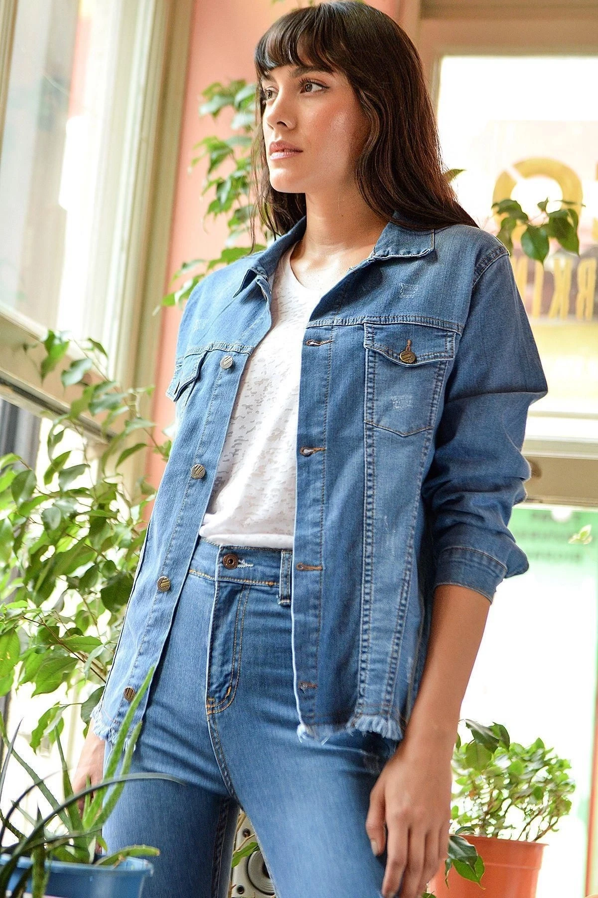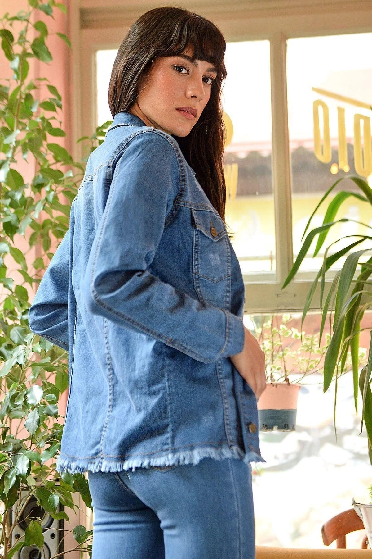 Kadın Mavi Ceket Yaka Uzun Kol Cep Detaylı Uçları Püsküllü Jean Kot Kaliteli Kumaş Maksi Boy Ceket