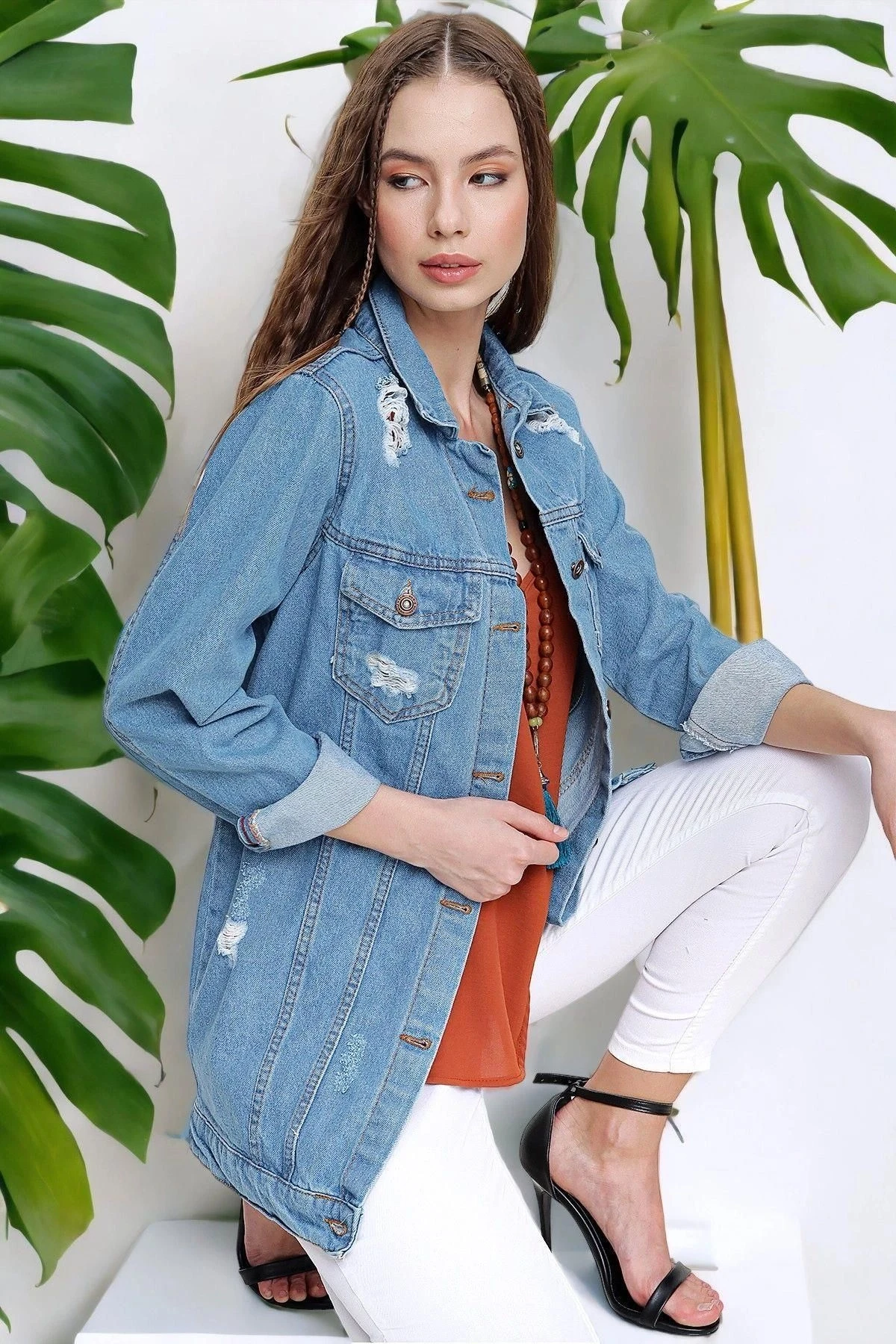 Kadın Mavi Ceket Yaka Uzun Kol Kot Jean Kot Kaliteli Kumaş Düz Kesim Ceket