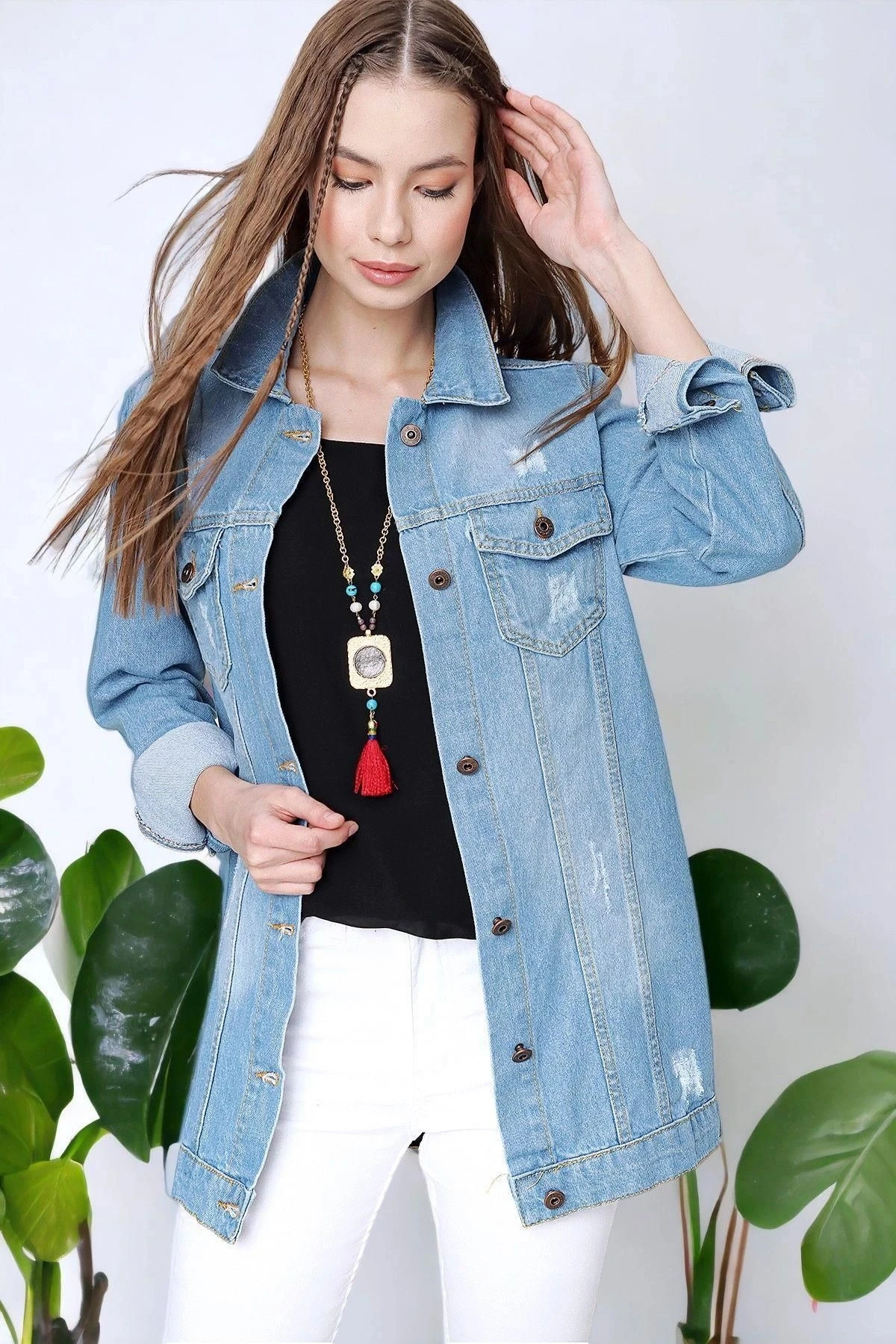 Kadın Mavi Ceket Yaka Uzun Kol Kot Jean Kot Kaliteli Kumaş Düz Kesim Ceket