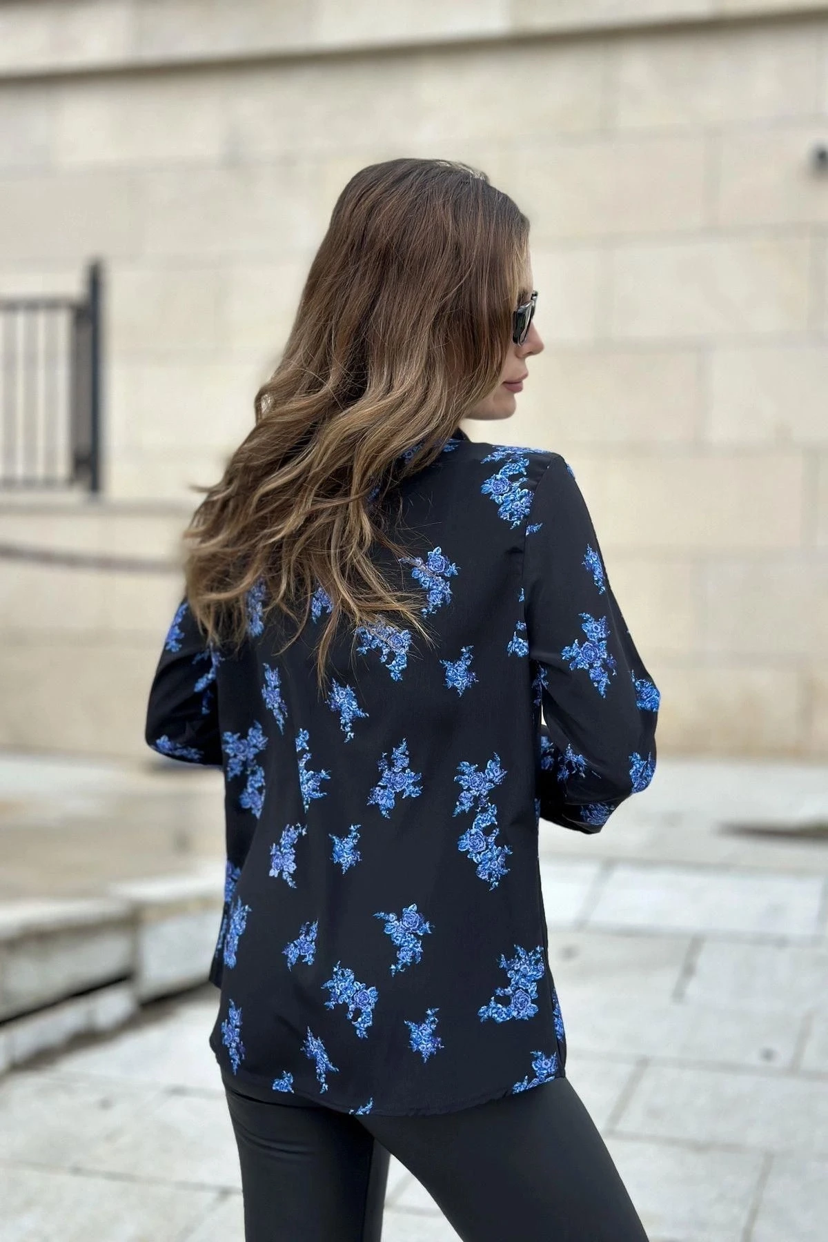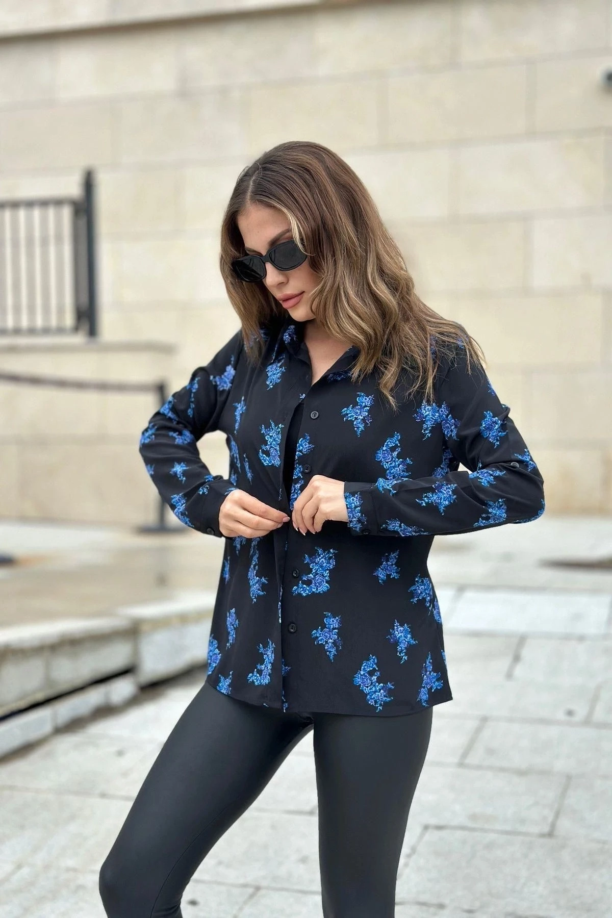 Mavi Çiçekli & Siyah Kadın Gömlek