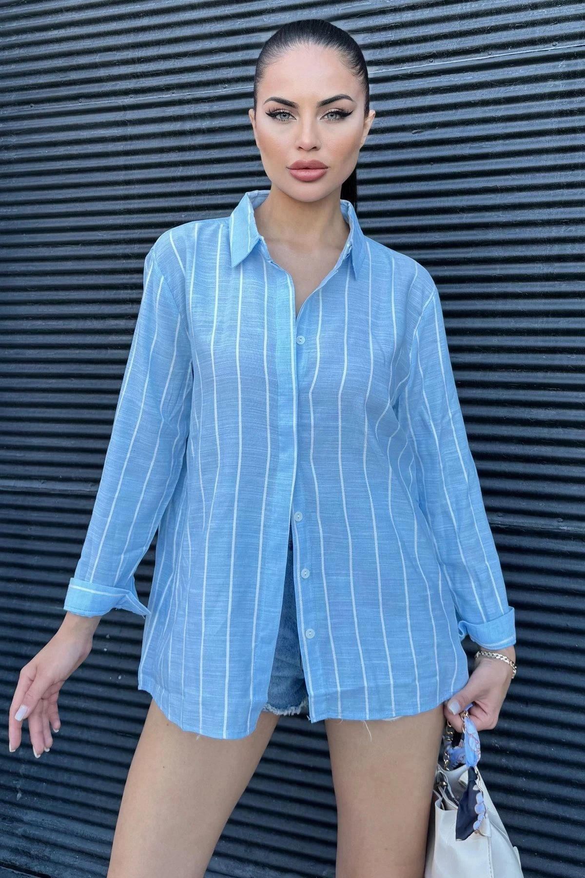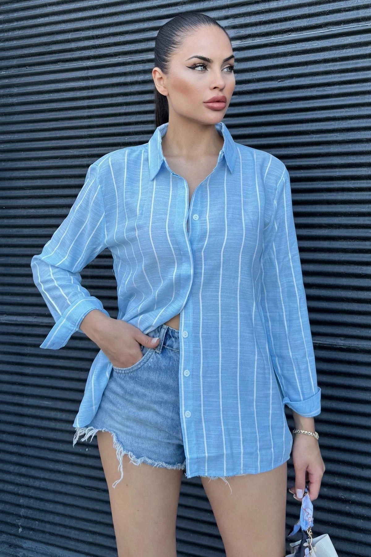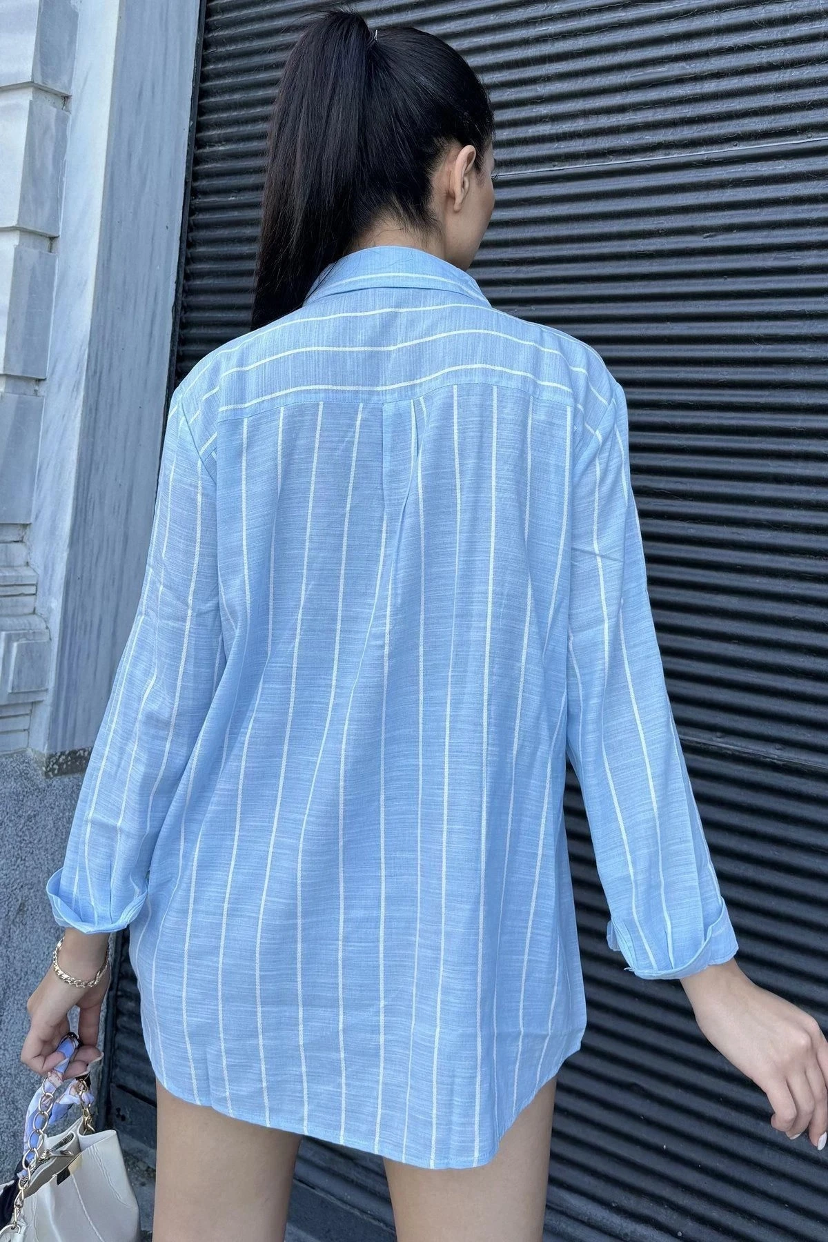 Kadın Mavi Çizgili Desen, Terletmez, Dokulu İthal Kumaş, Salaş Kesim, Dökümlü Gömlek