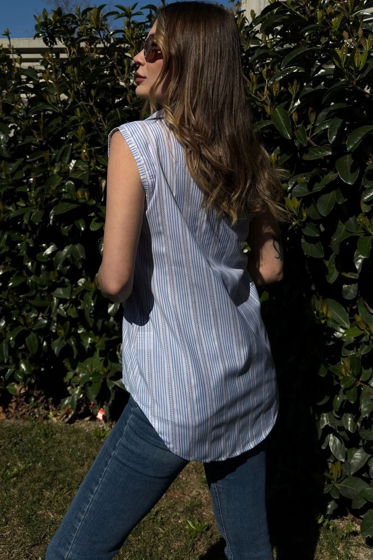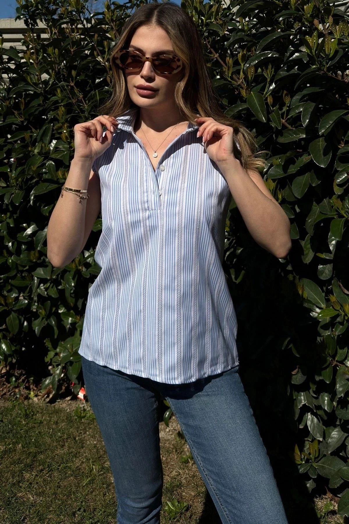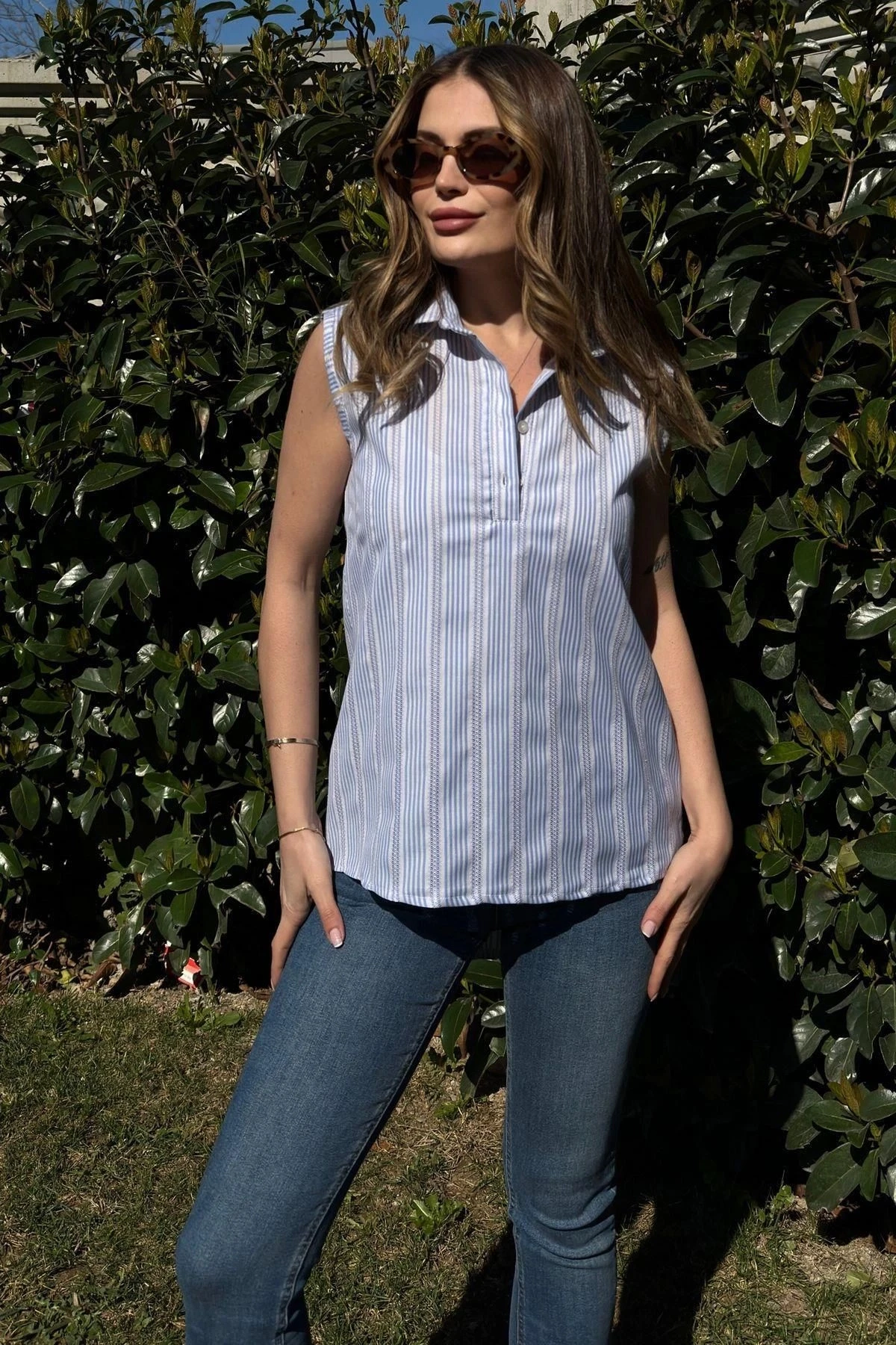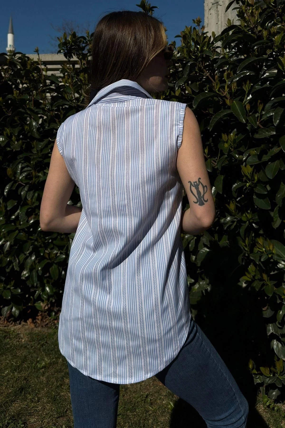 Kadın Mavi Çizgili, Dokulu Yazlık Kumaş, Yarım Patlı, Sıfır Kollu Bluz