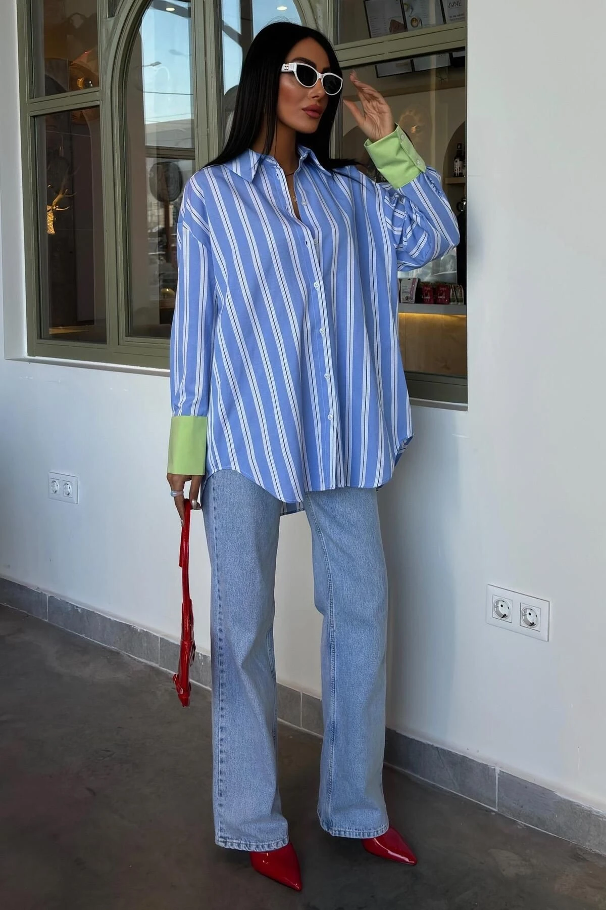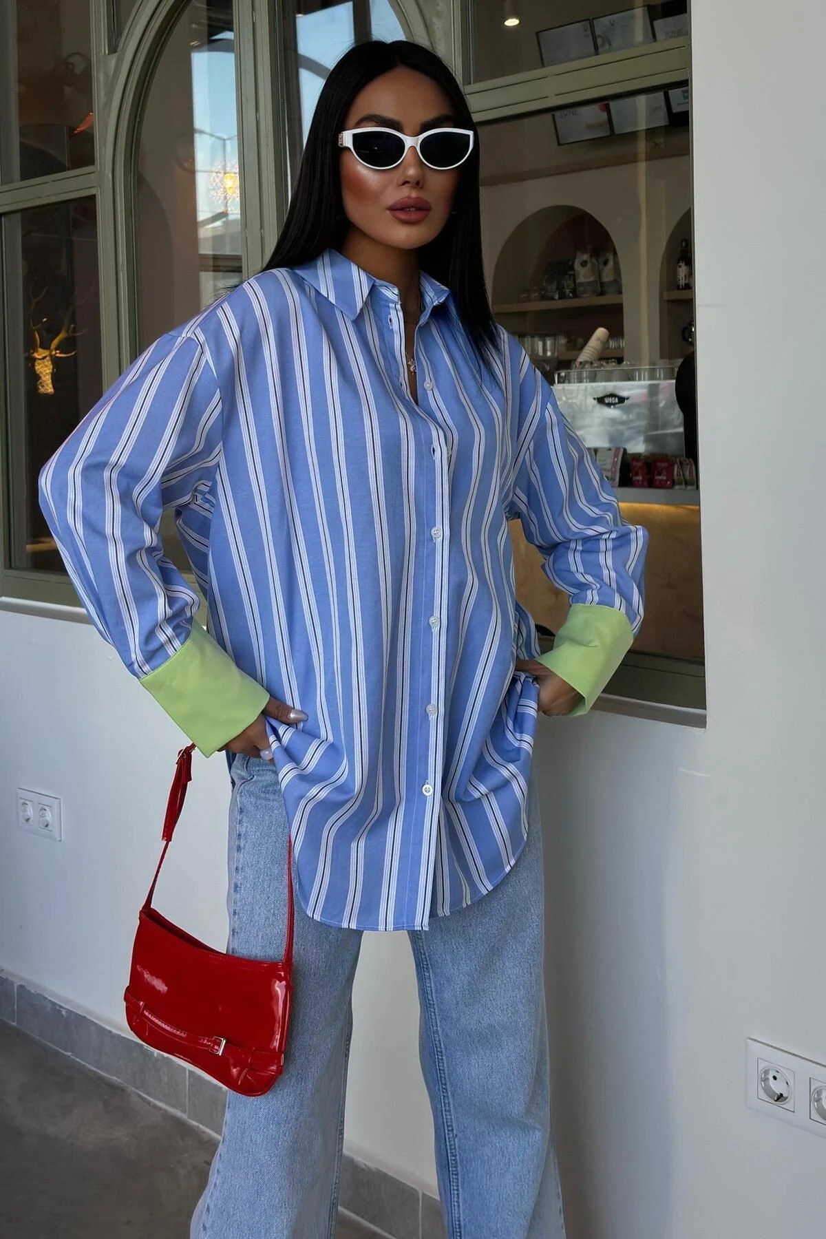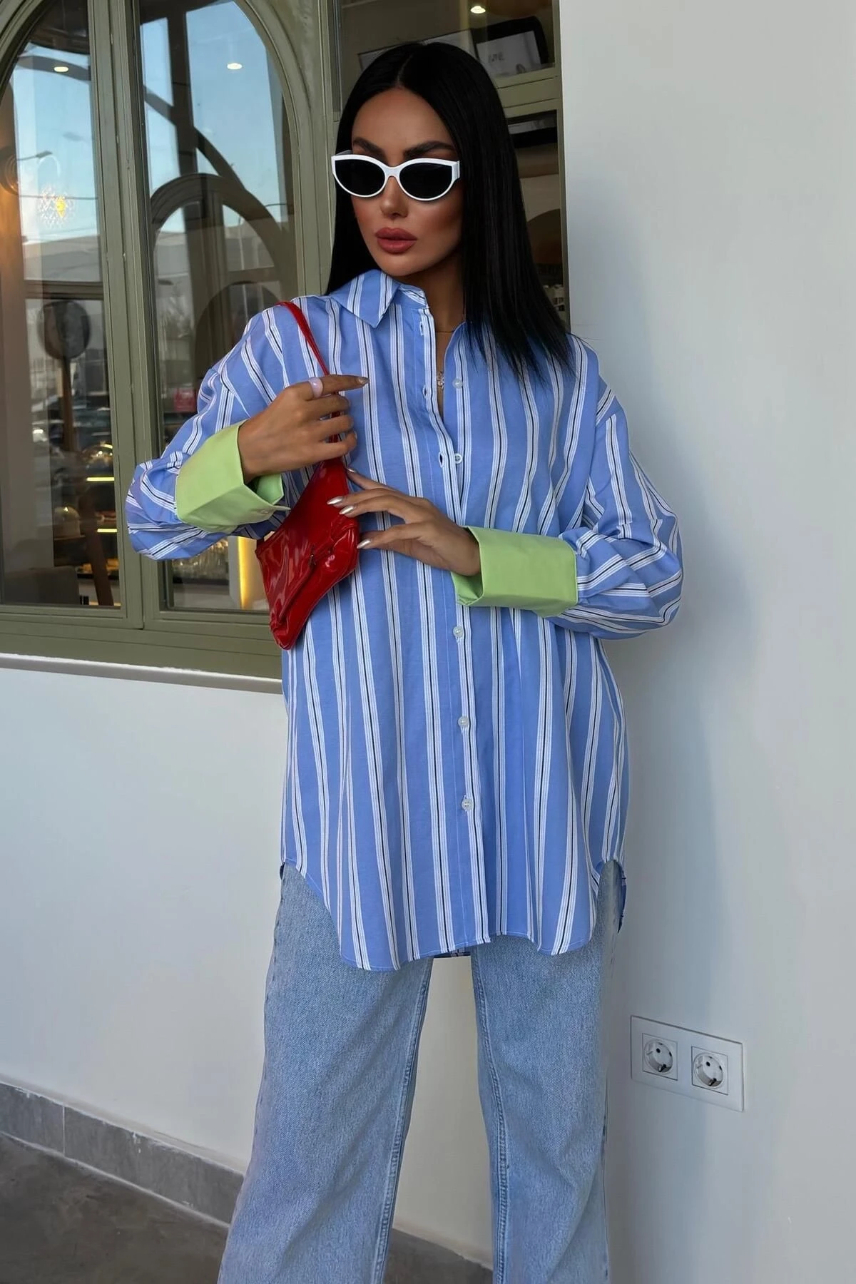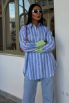 Kadın Mavi Çizgili Poplin Oversize Uzun Kollu Gömlek