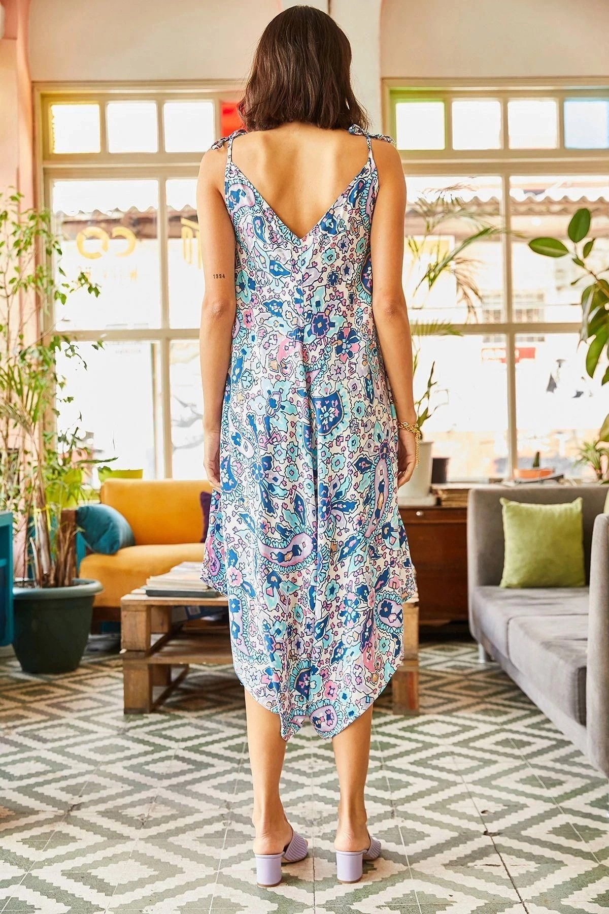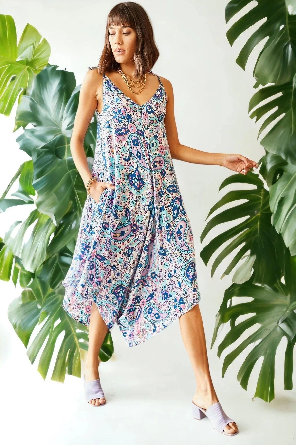 Kadın Mavi Çok Renkli Kaliteli Kumaş Oversize Kesim Asimetrik Kol V Yaka Rahat Boy Tulum