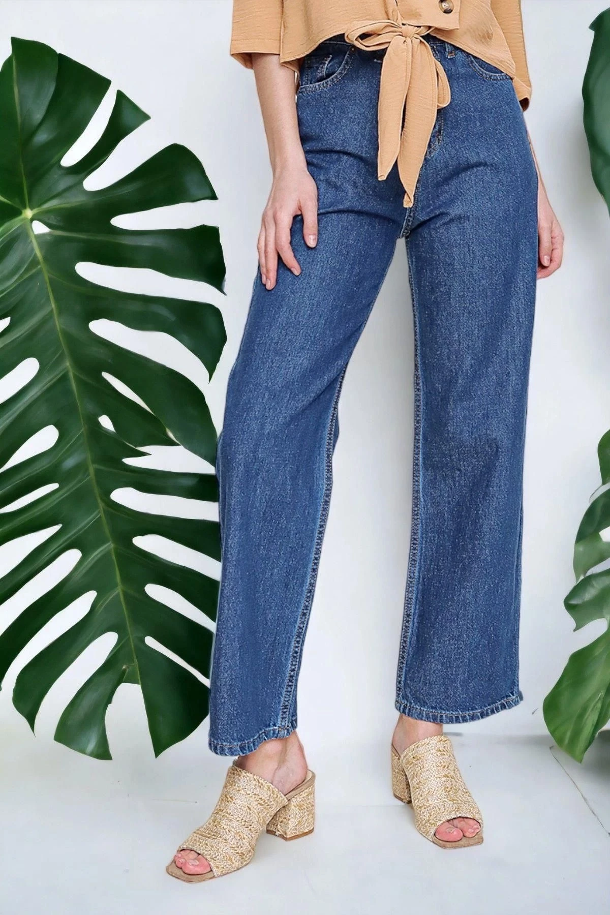 Kadın Mavi Düğmeli Detaylı Jean Kaliteli Kumaş, Rahat Kesim, Standart Boy Pantolon