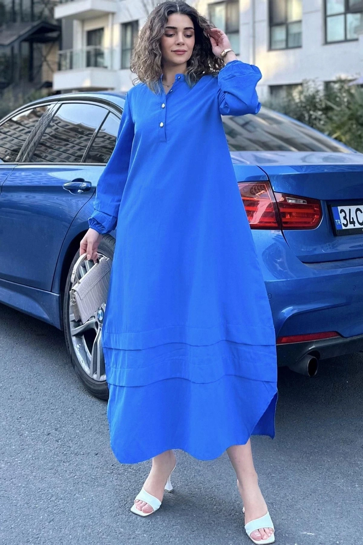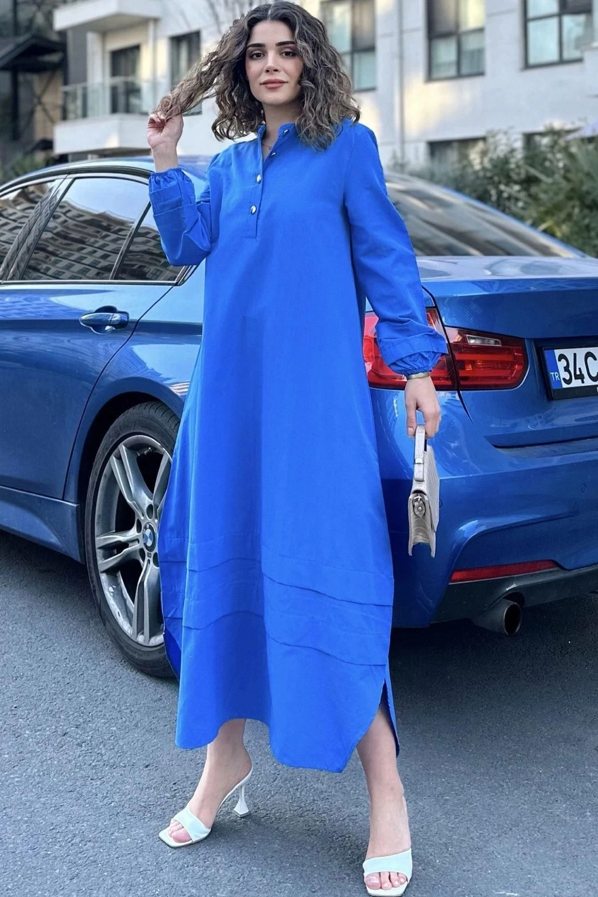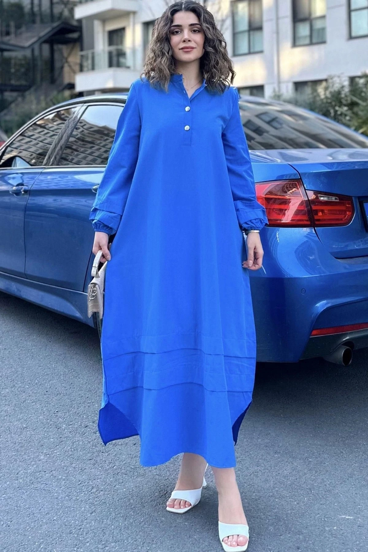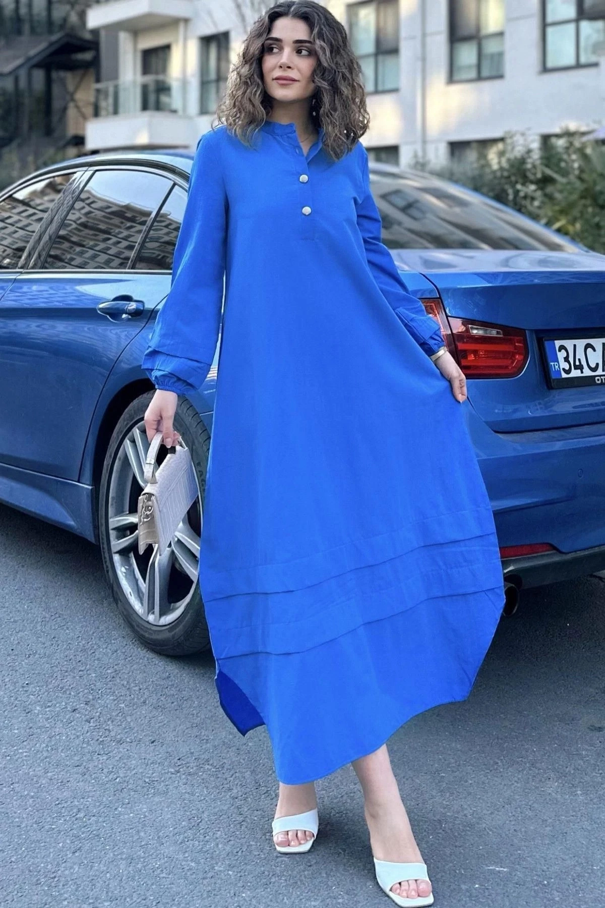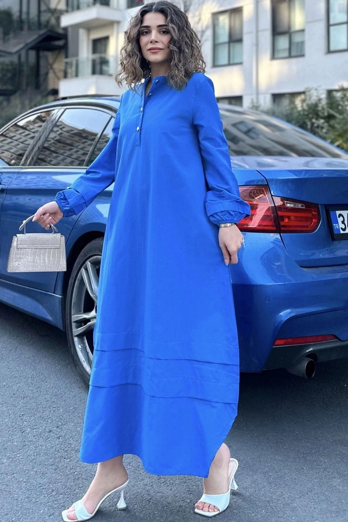 Kadın Mavi Hakim Yaka, Lastikli Balon Kol, Etek Ve Kolu Kat Kumaş Dikişli, Uzun Salaş Elbise