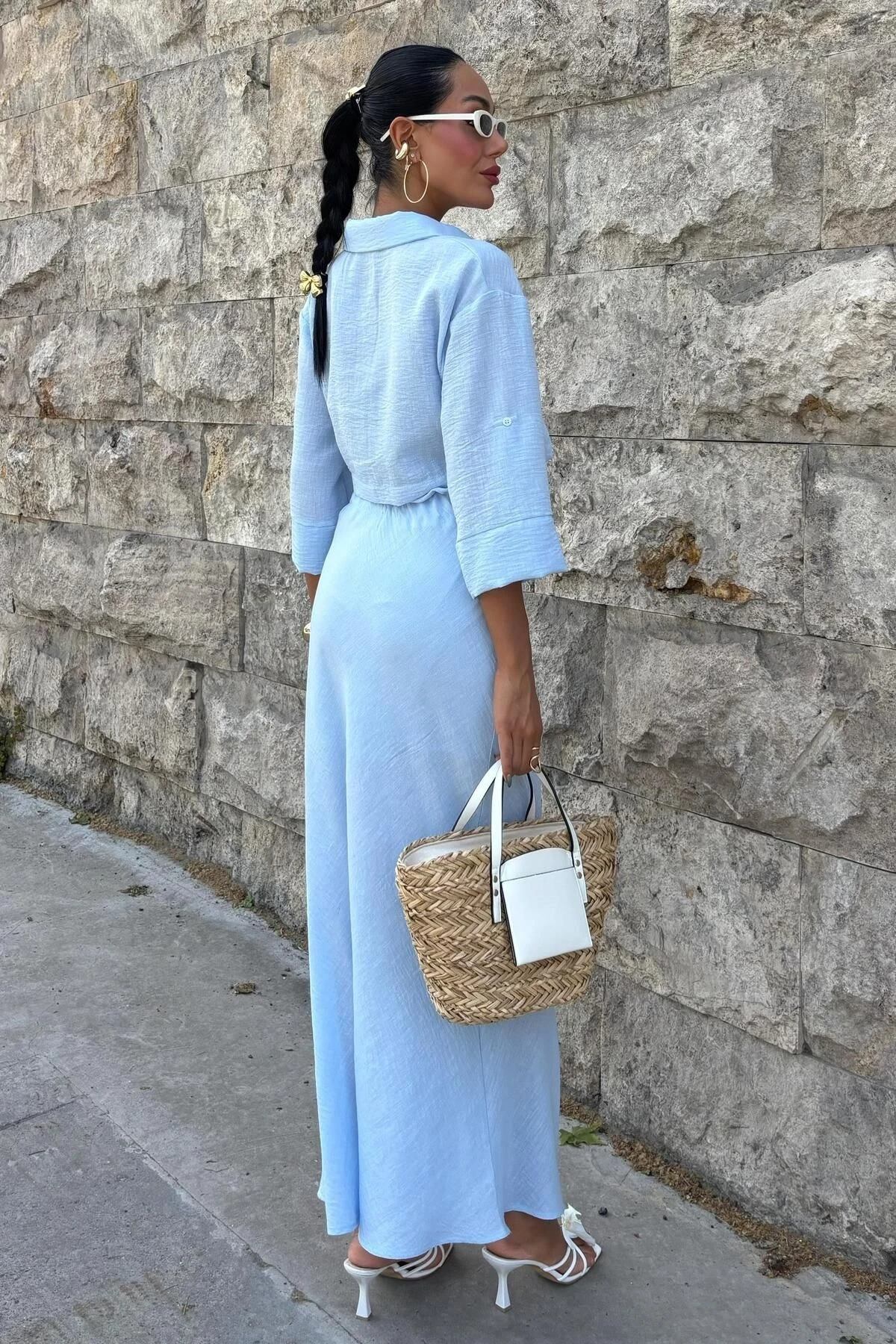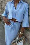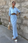 Kadın Mavi Keten Uzun Kollu Büzgülü Takım