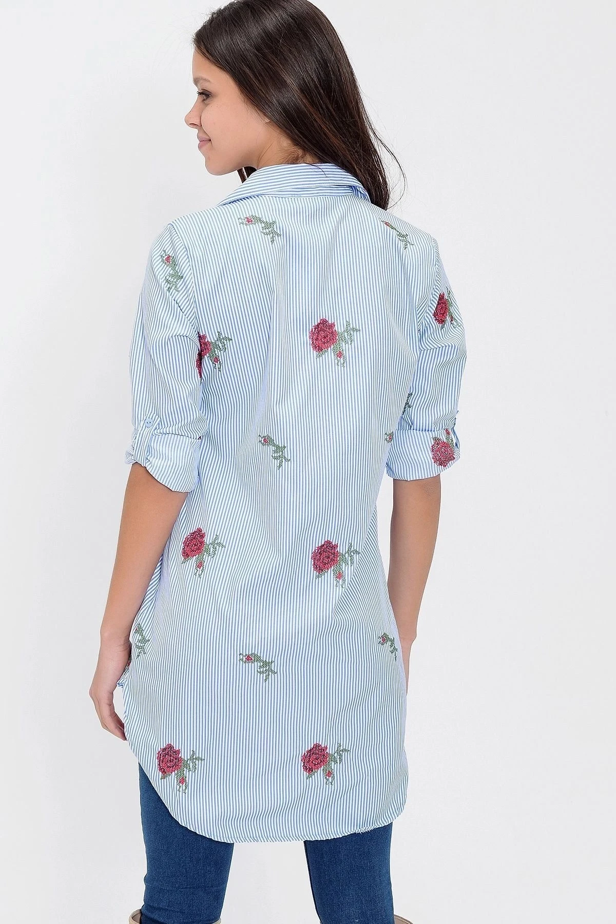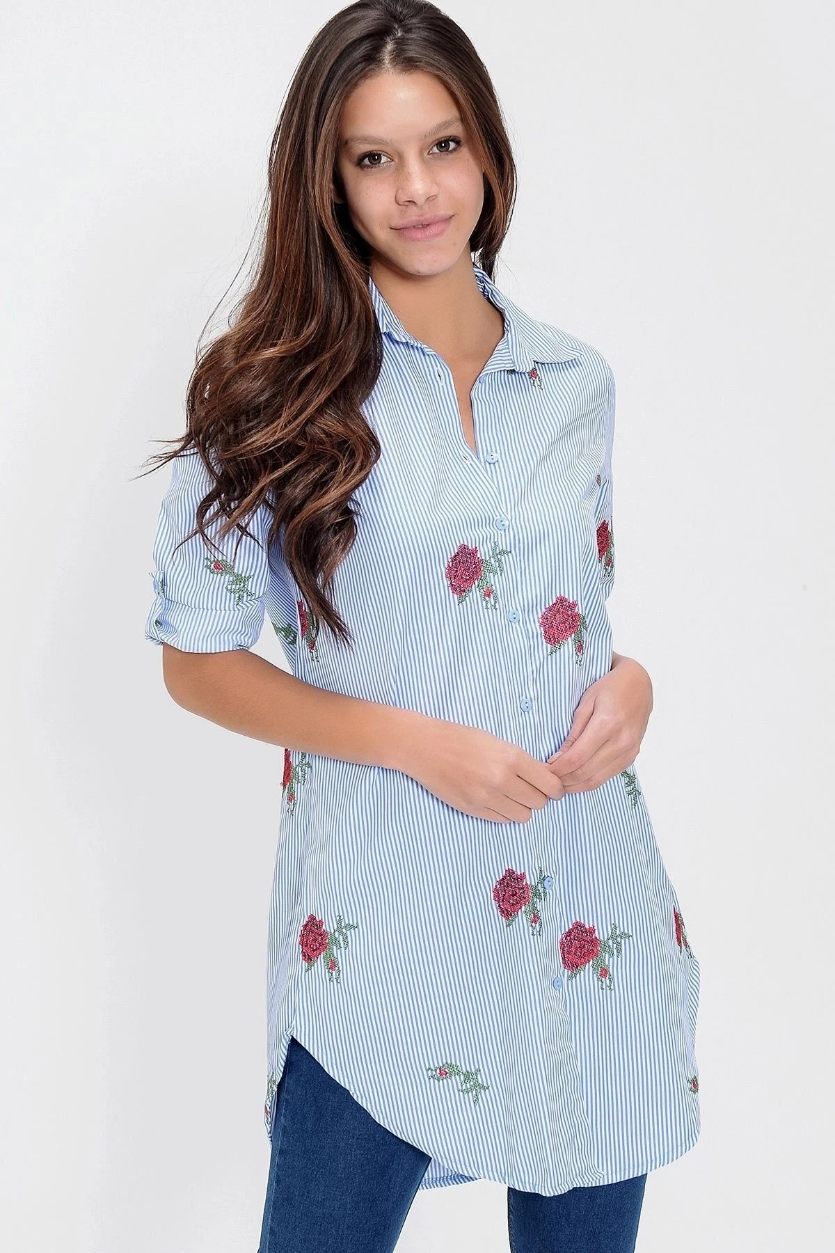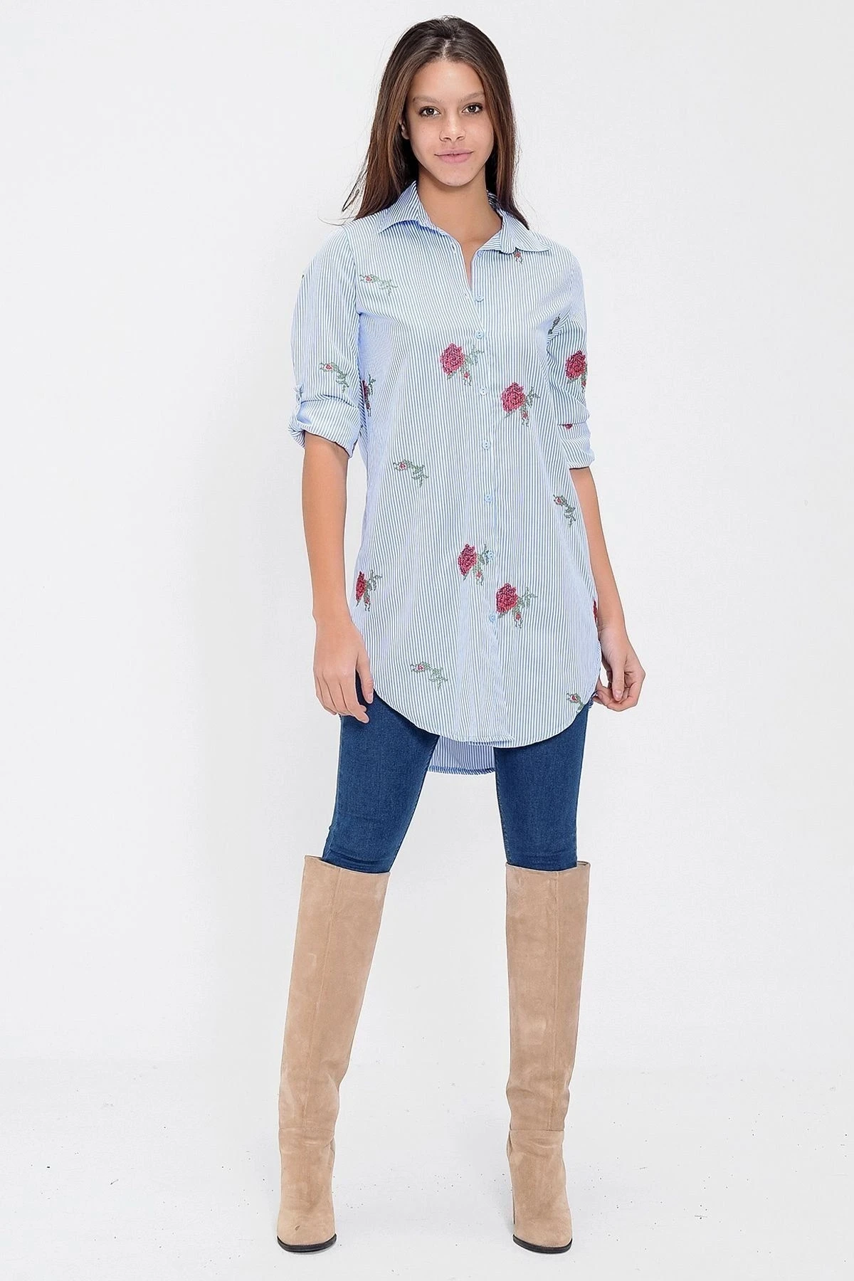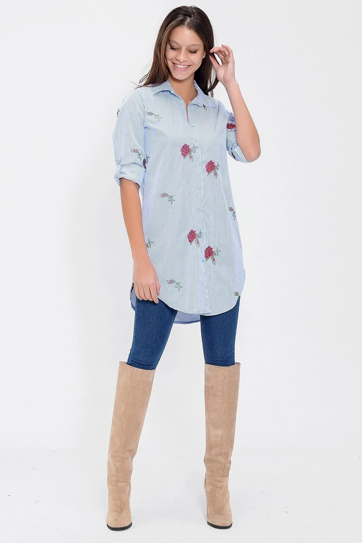 Kadın Mavi & Kırmızı Uzun Kol Nakış Detaylı Uzun Gömlek Tunik Elbise - Tesettüre Uygun