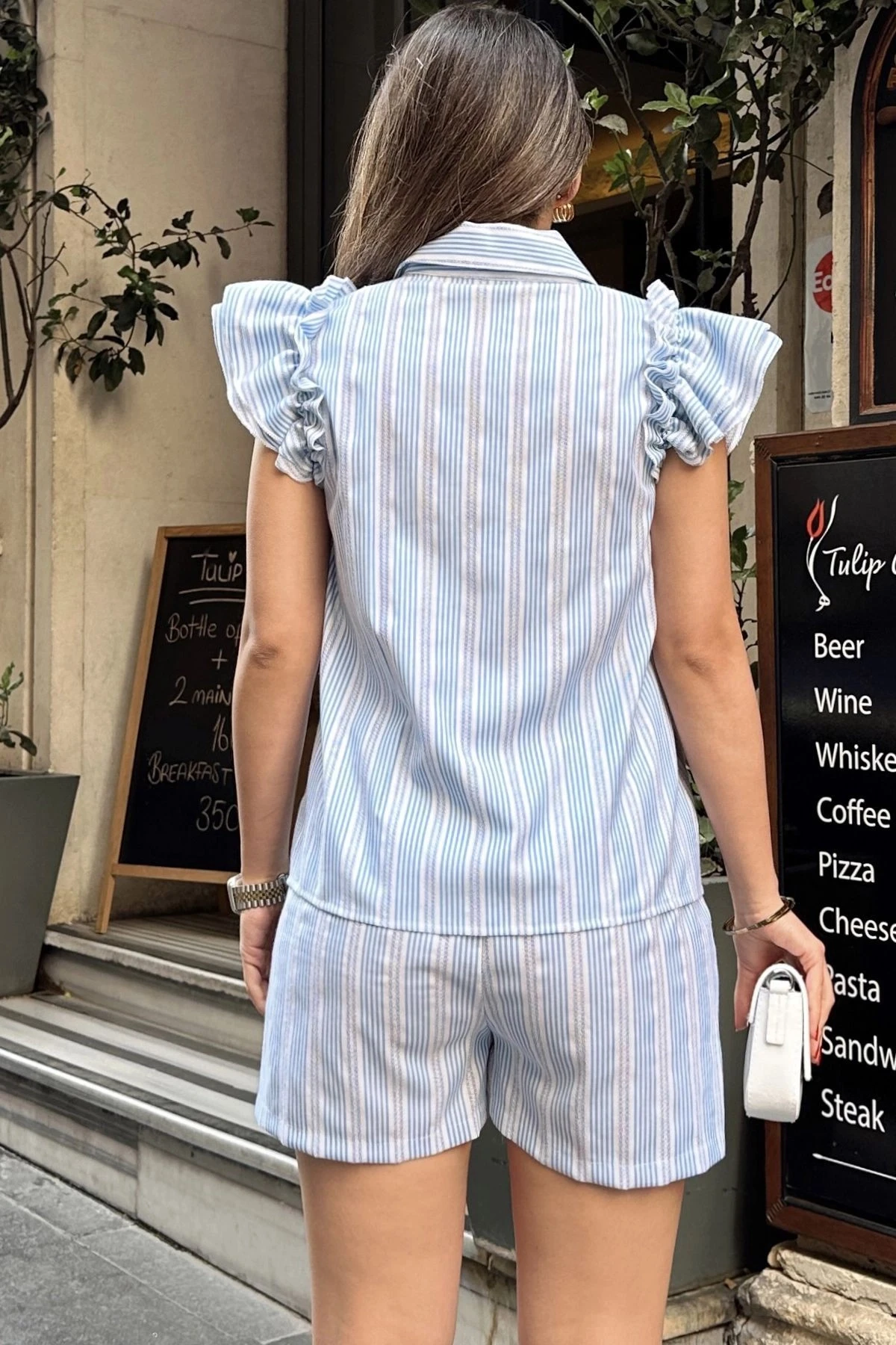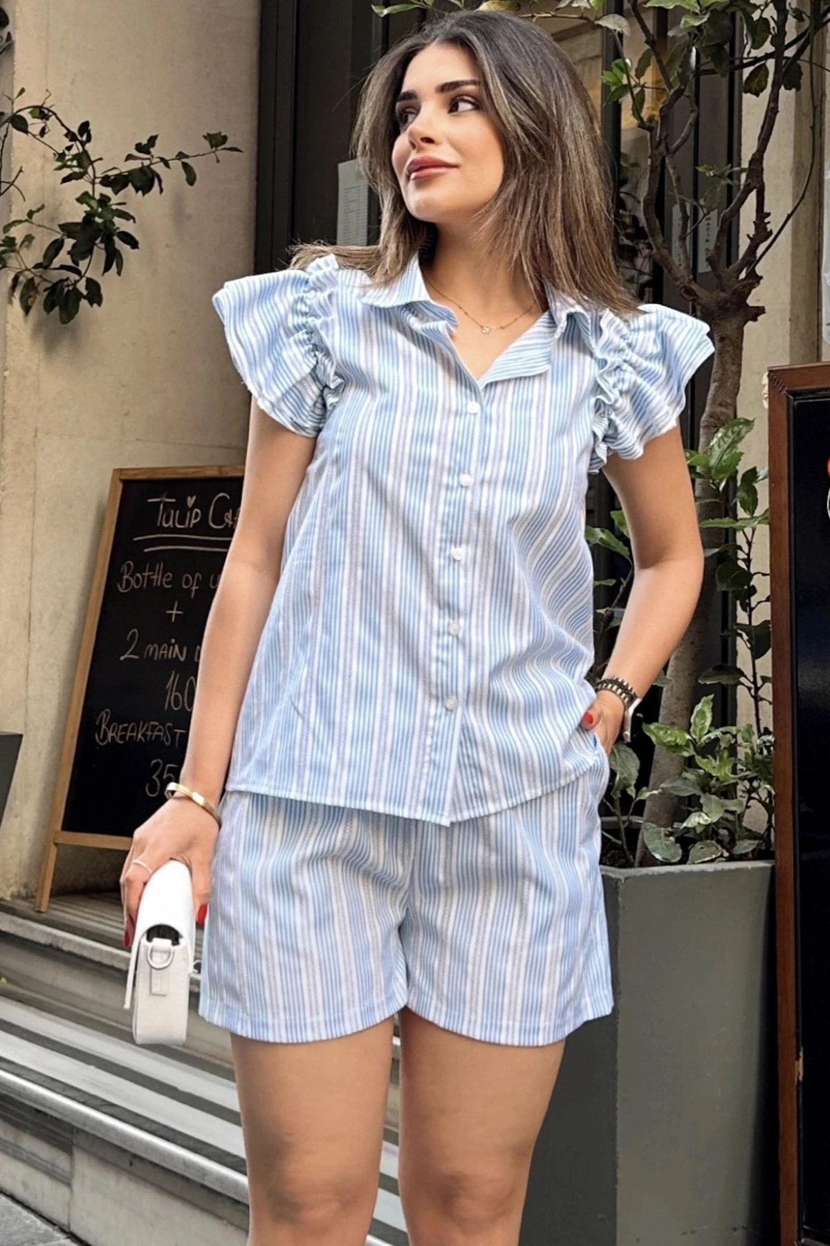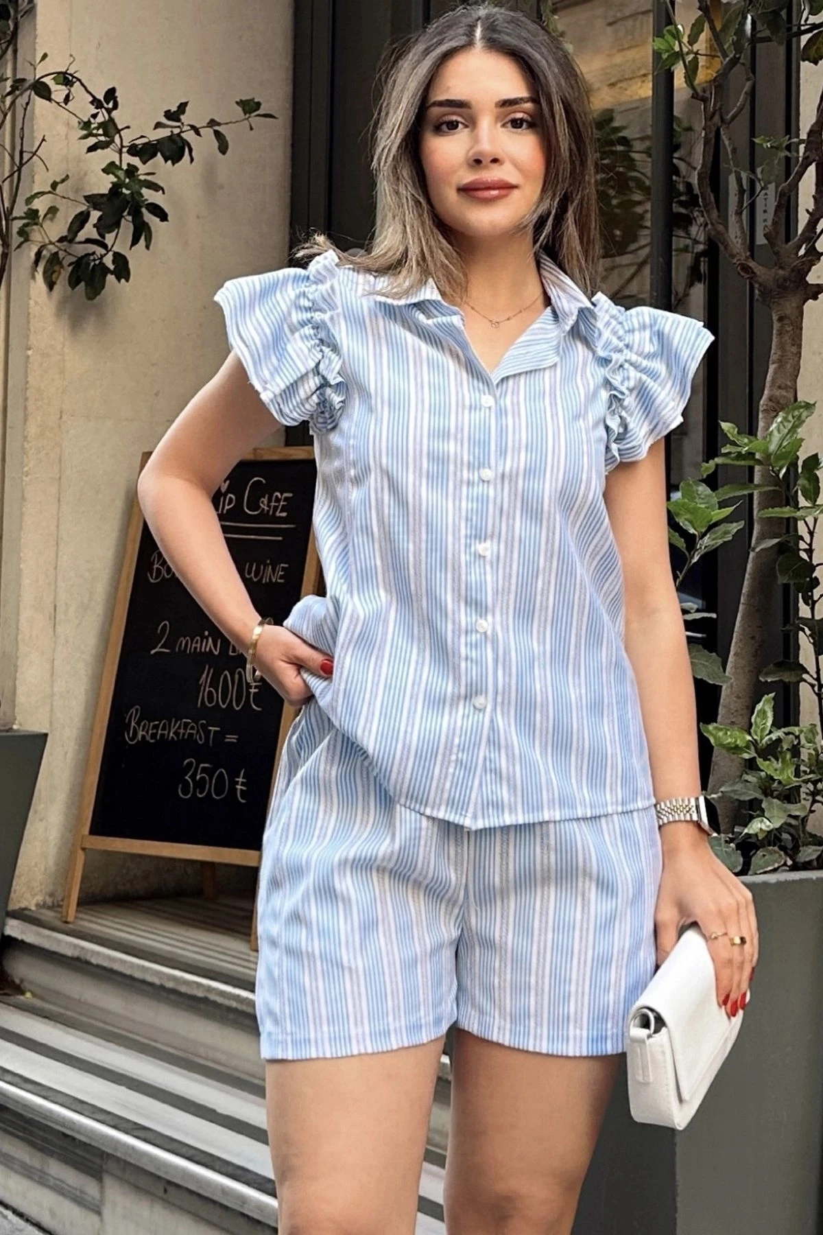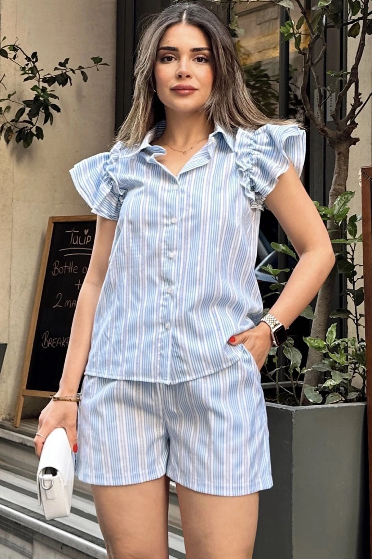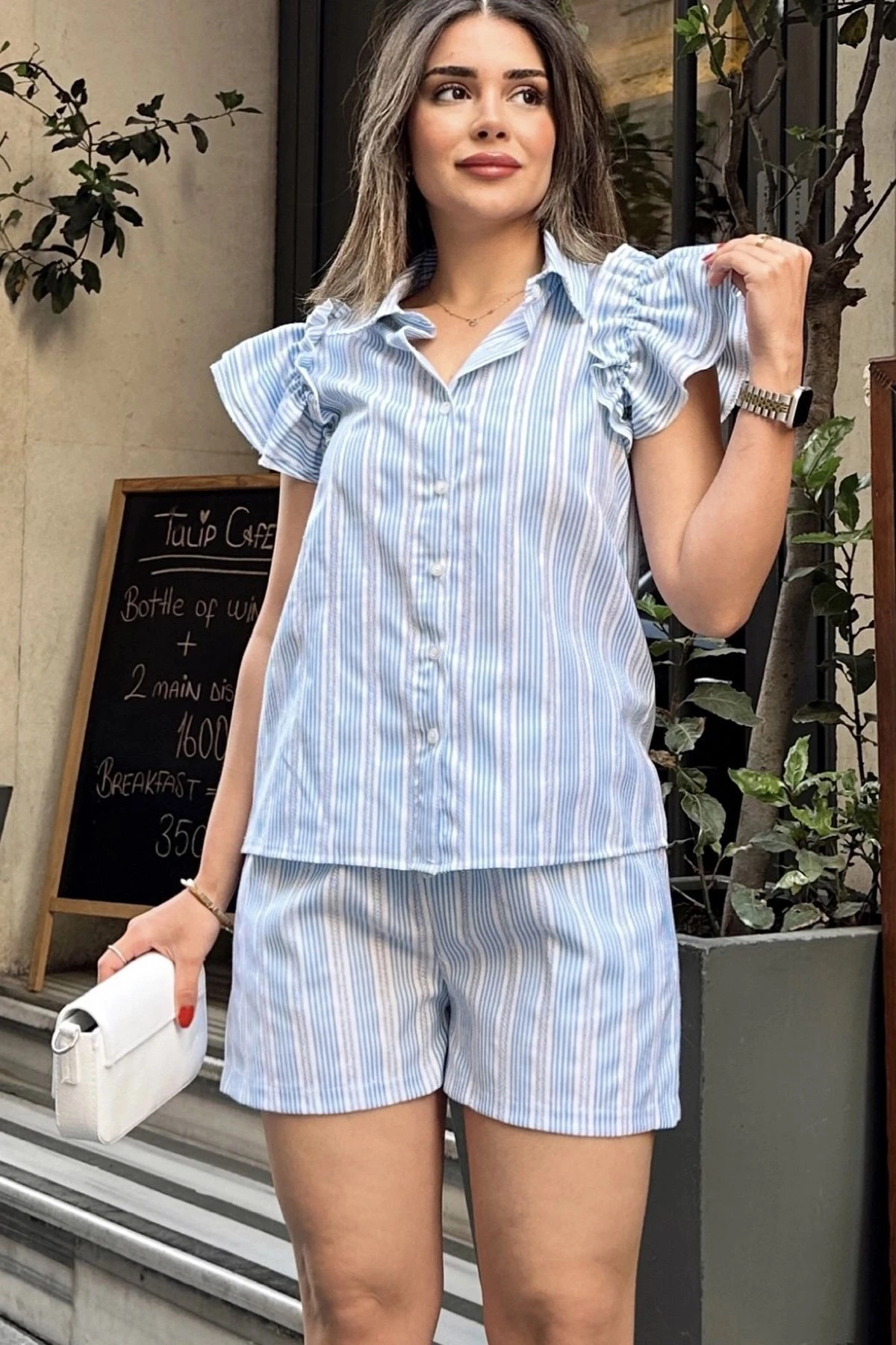 Kadın Mavi Kısa Kol, Omuzları Flare Fırfır Tasarımlı, Terletmez, Çizgi Desenli Fisto Gömlek