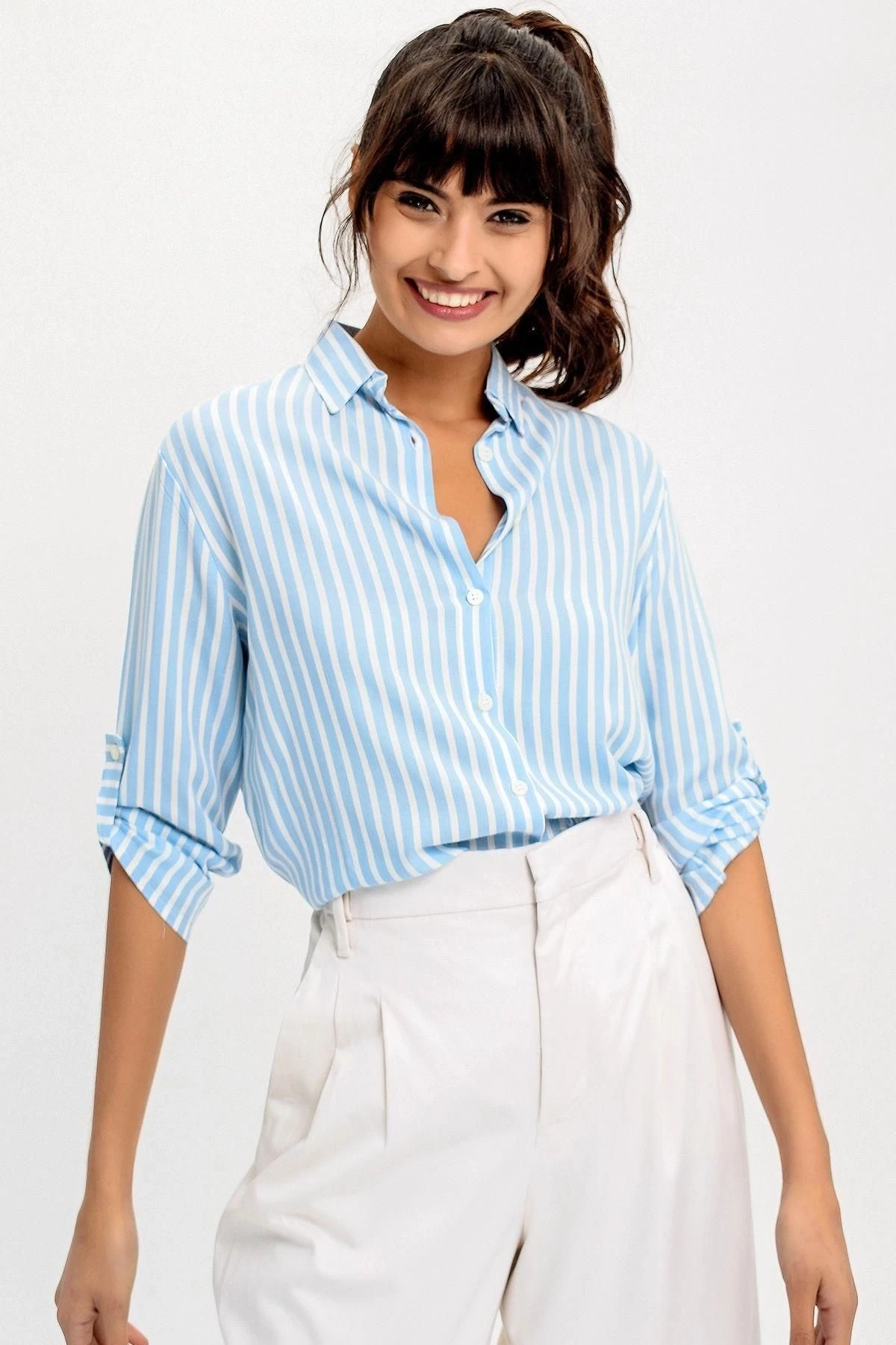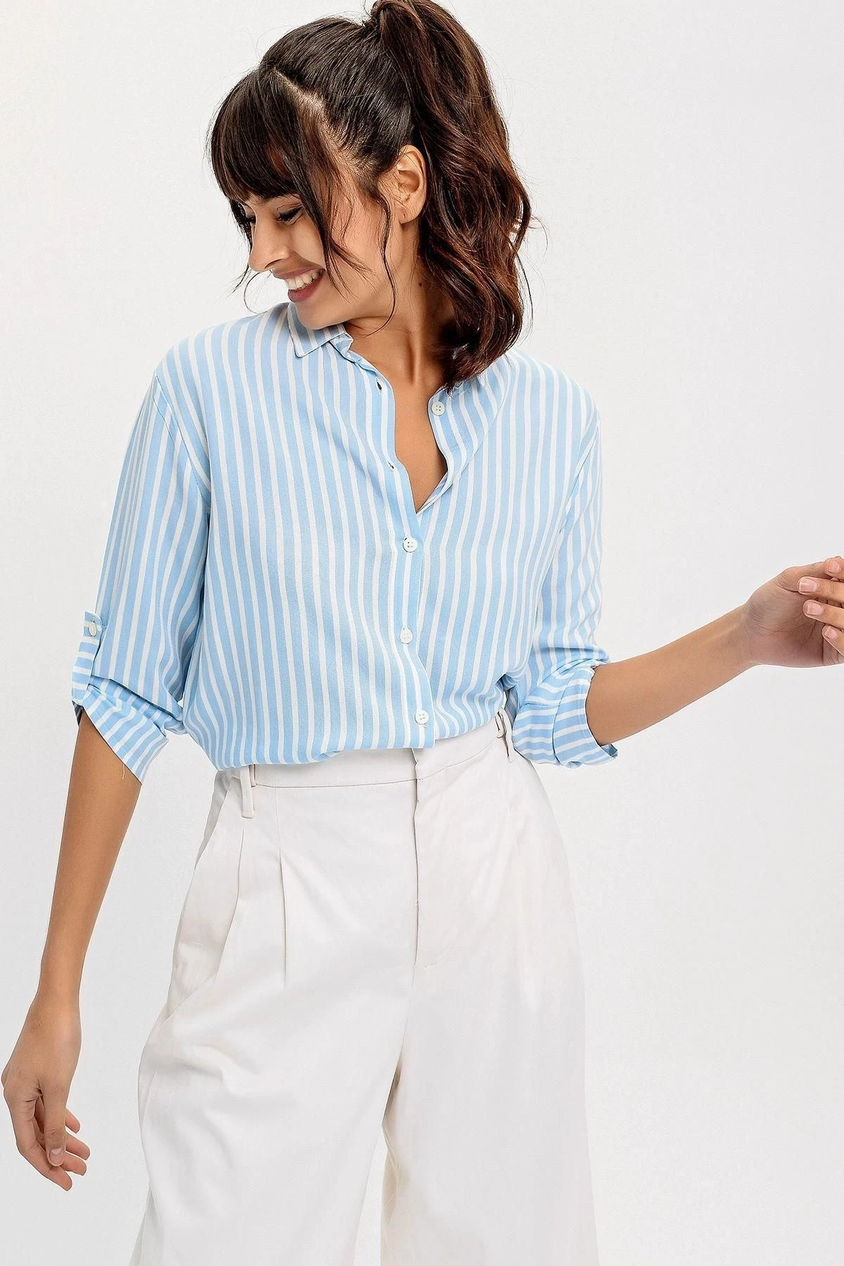 Kadın Mavi Klasik Yaka, Uzun Kol, Çizgili, Basic, Regular Kesimli, Standart Boy Gömlek