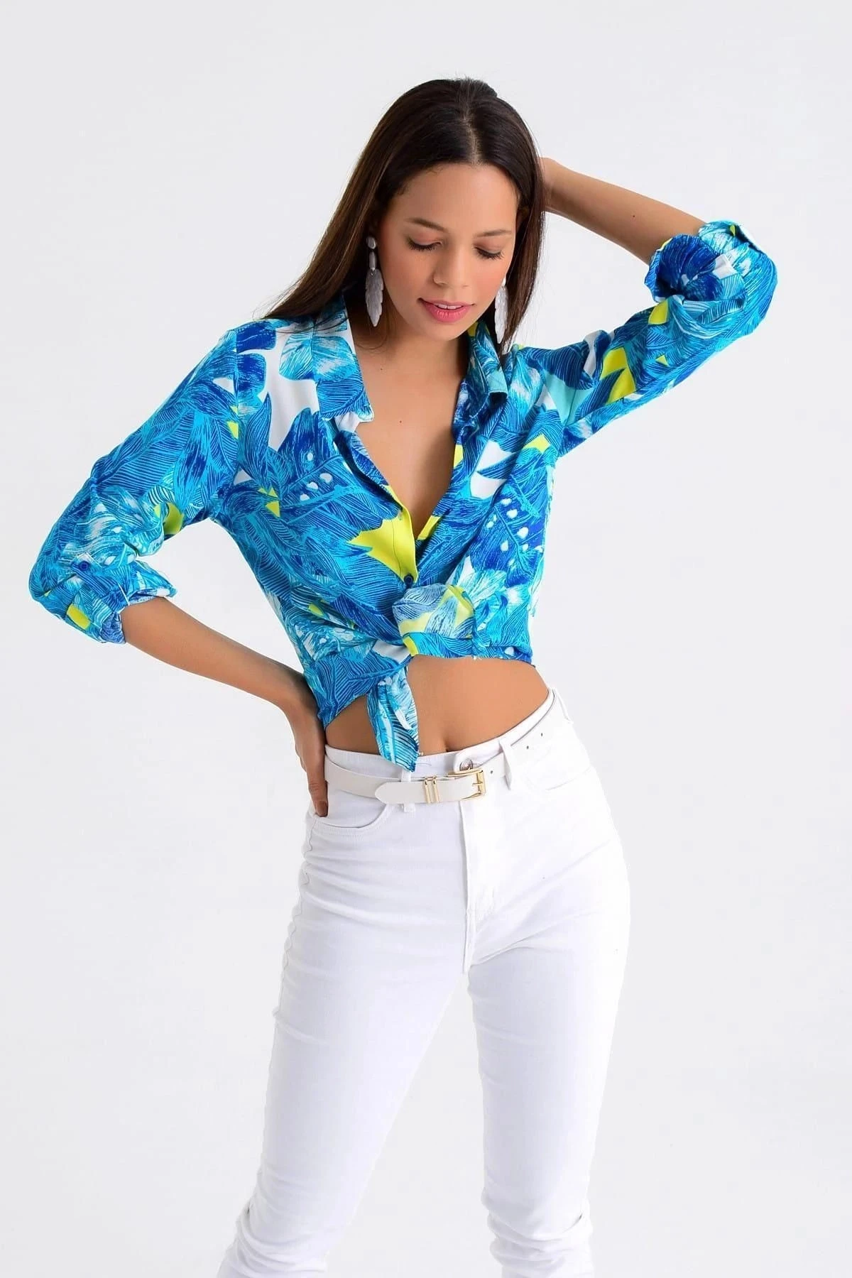 Kadın Mavi Klasik Yaka, Uzun Kol, Desenli, Regular Kesim, Standart Boy Gömlek.