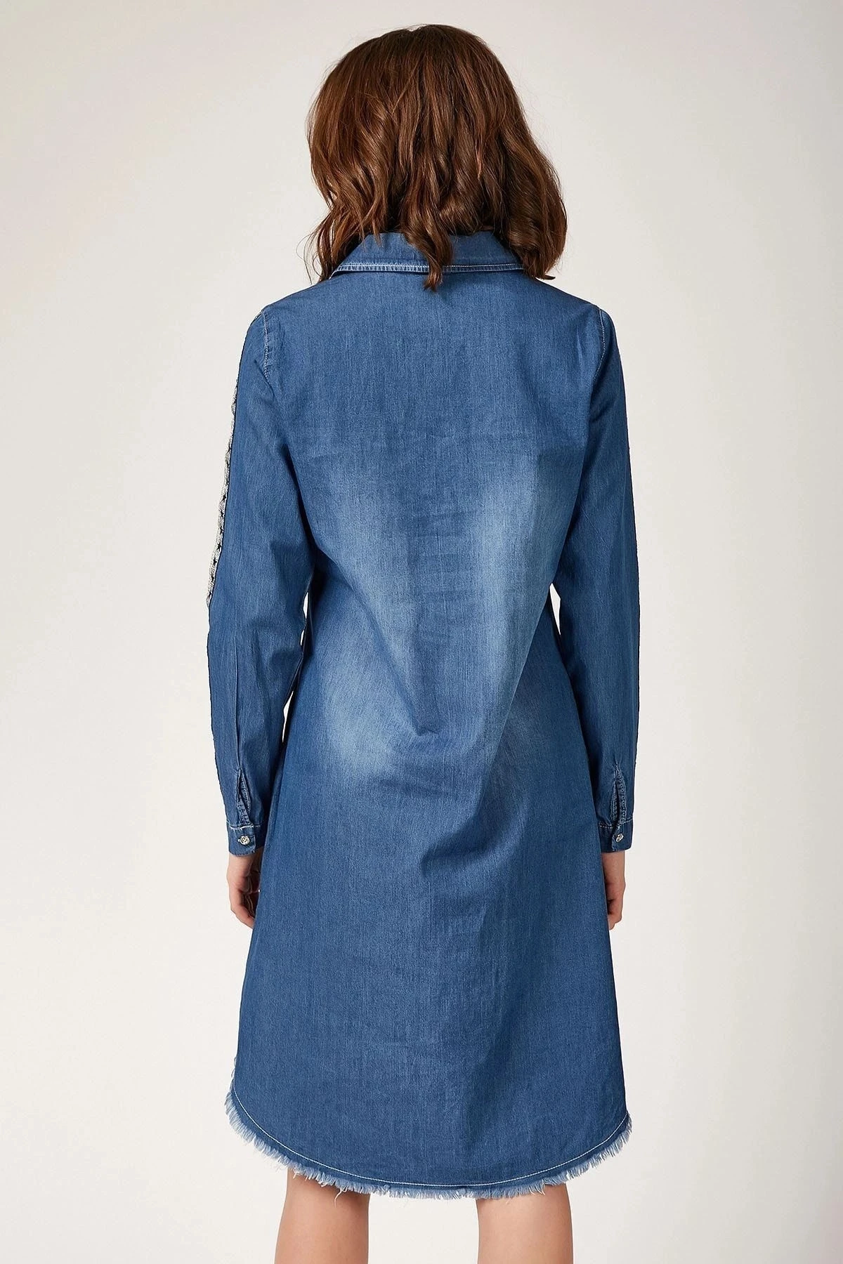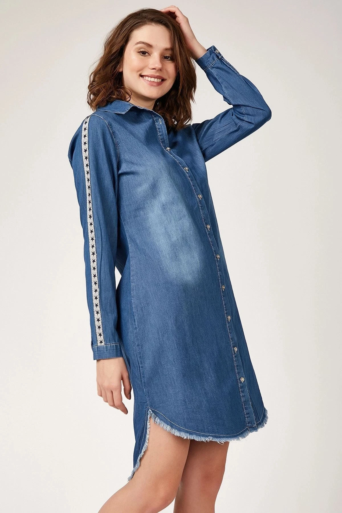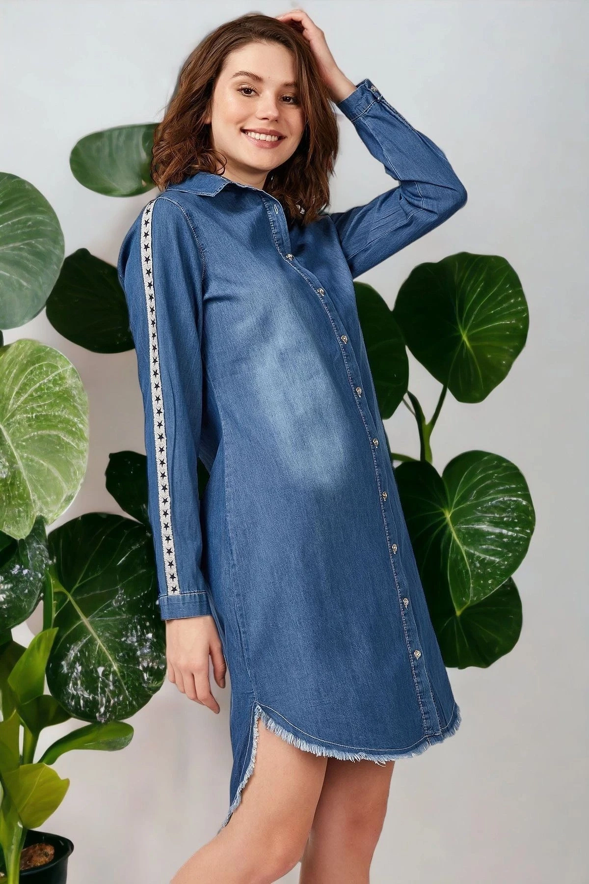 Kadın Mavi Klasik Yaka Uzun Kol Yıldız Biye Detaylı Asimetrik Jean Midi Boy Tunik - Tesettüre Uygun