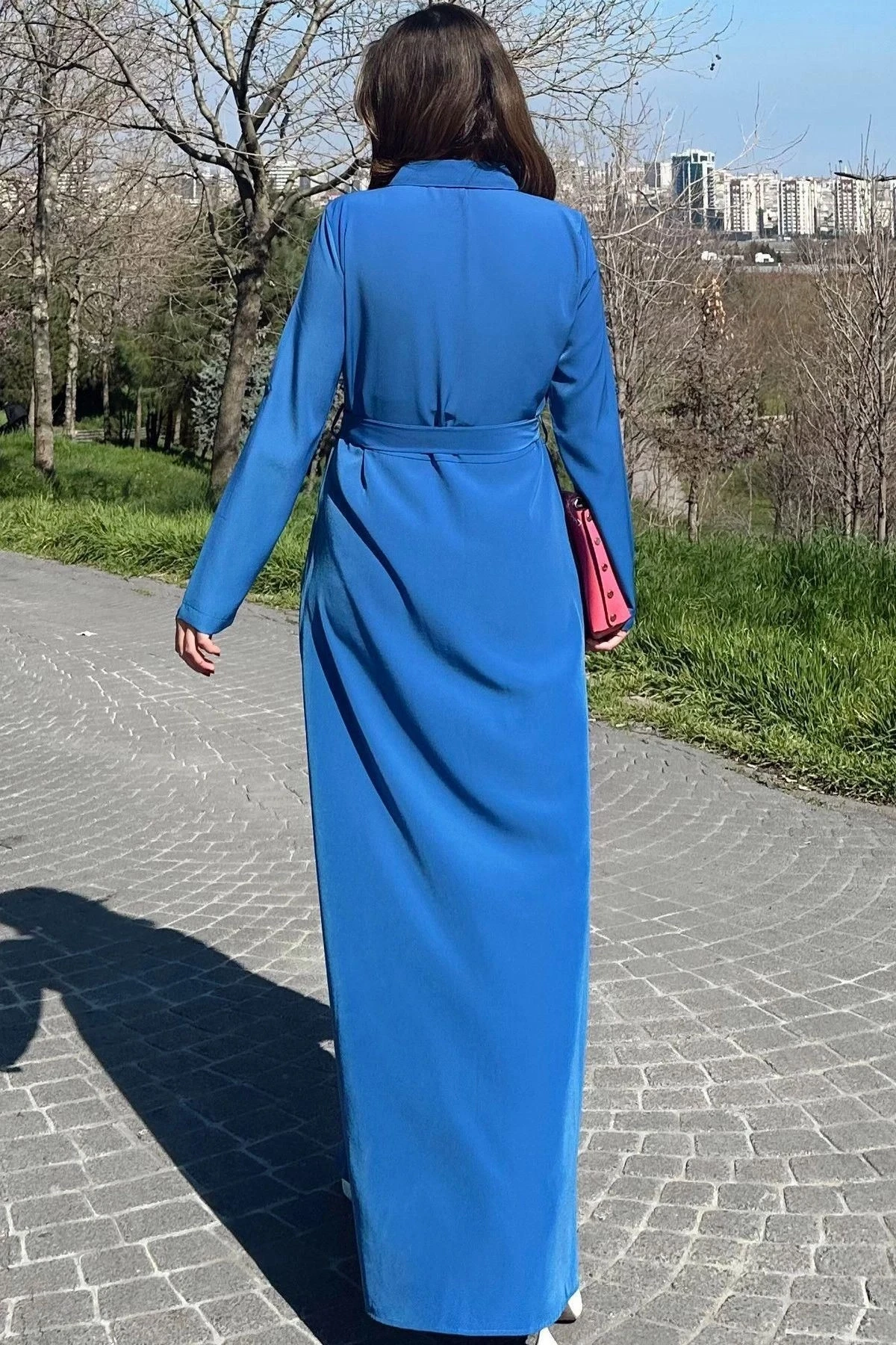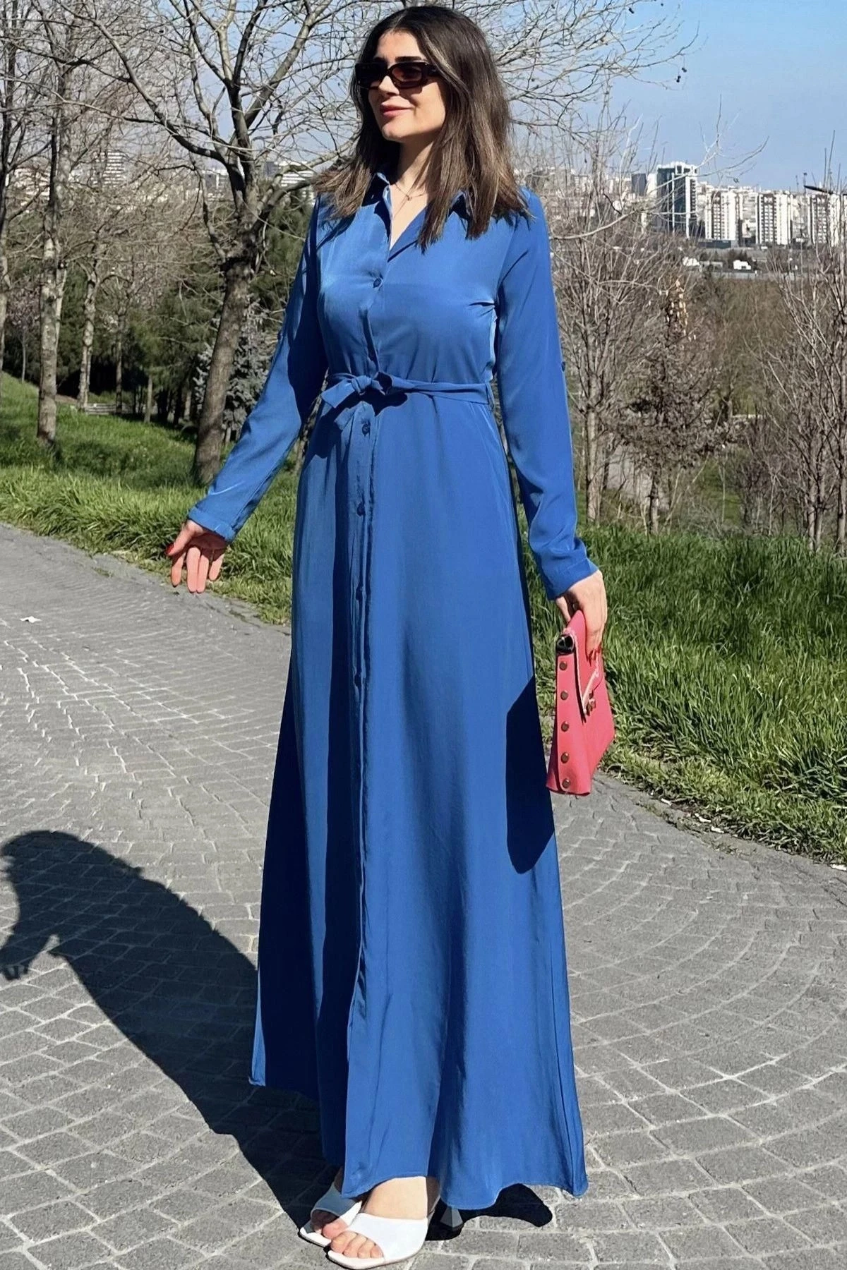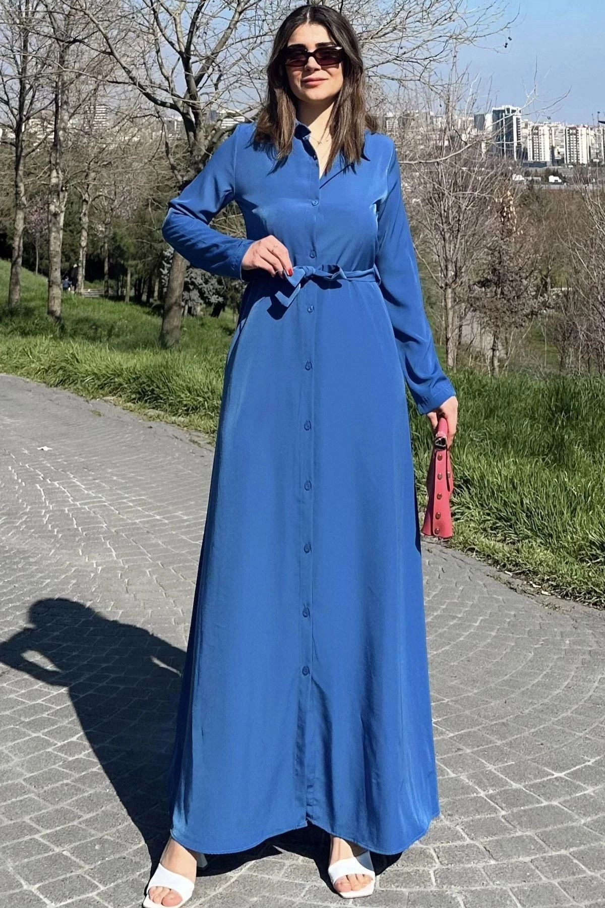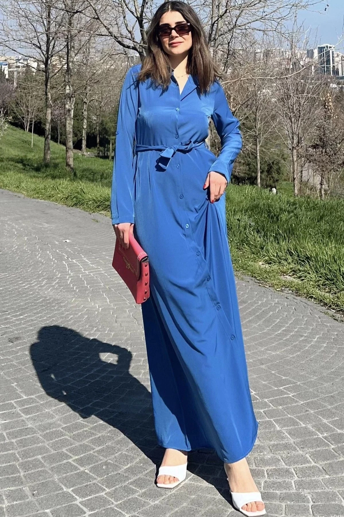 Kadın Mavi Kupra Kumaş, Uzun Kol, Beli Kuşaklı, Vucüda Oturan Kalıp, Uzun Gömlek Elbise