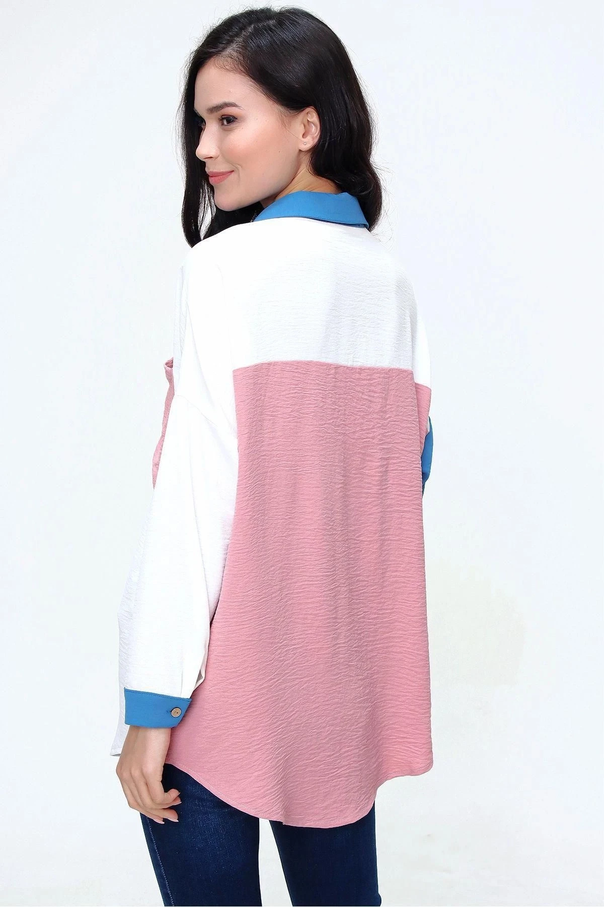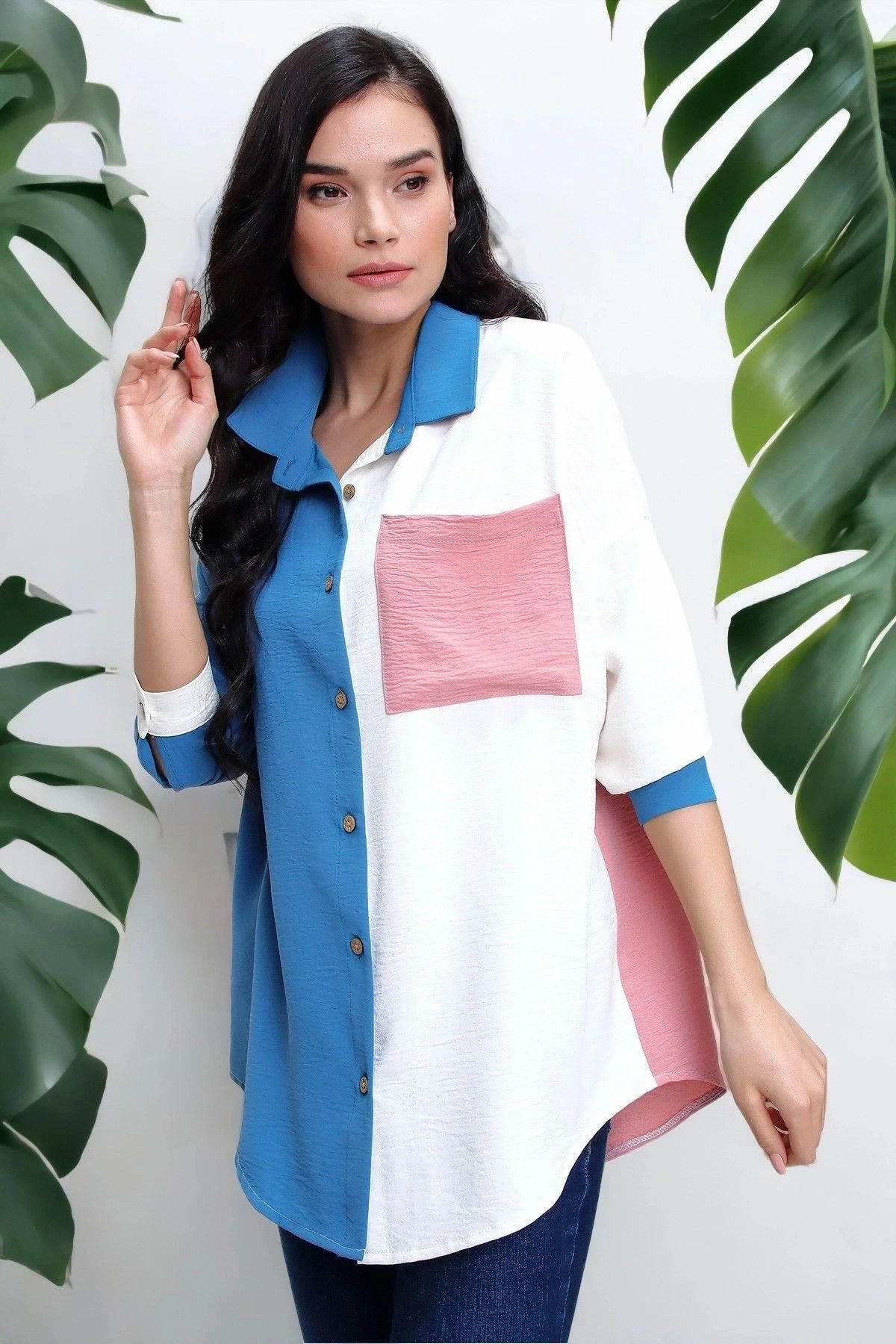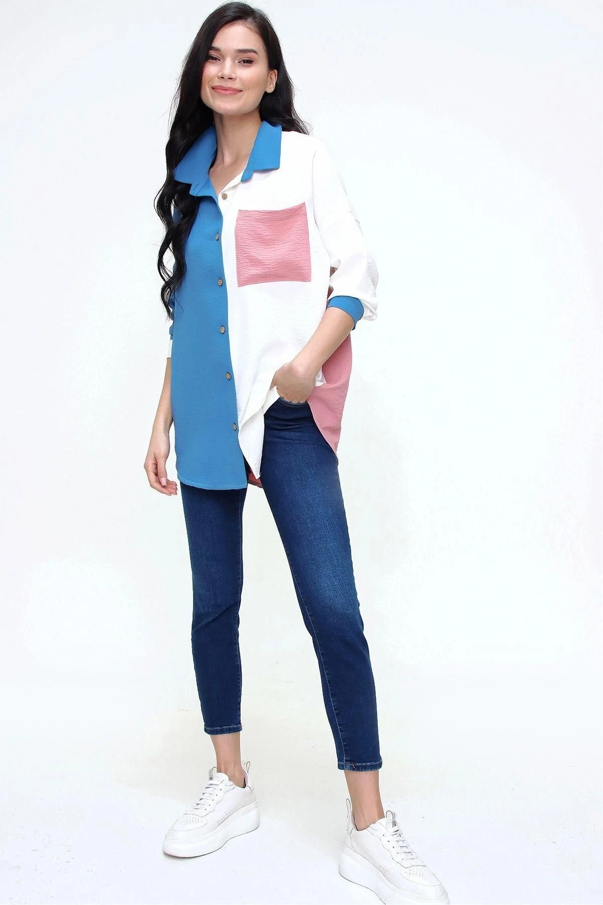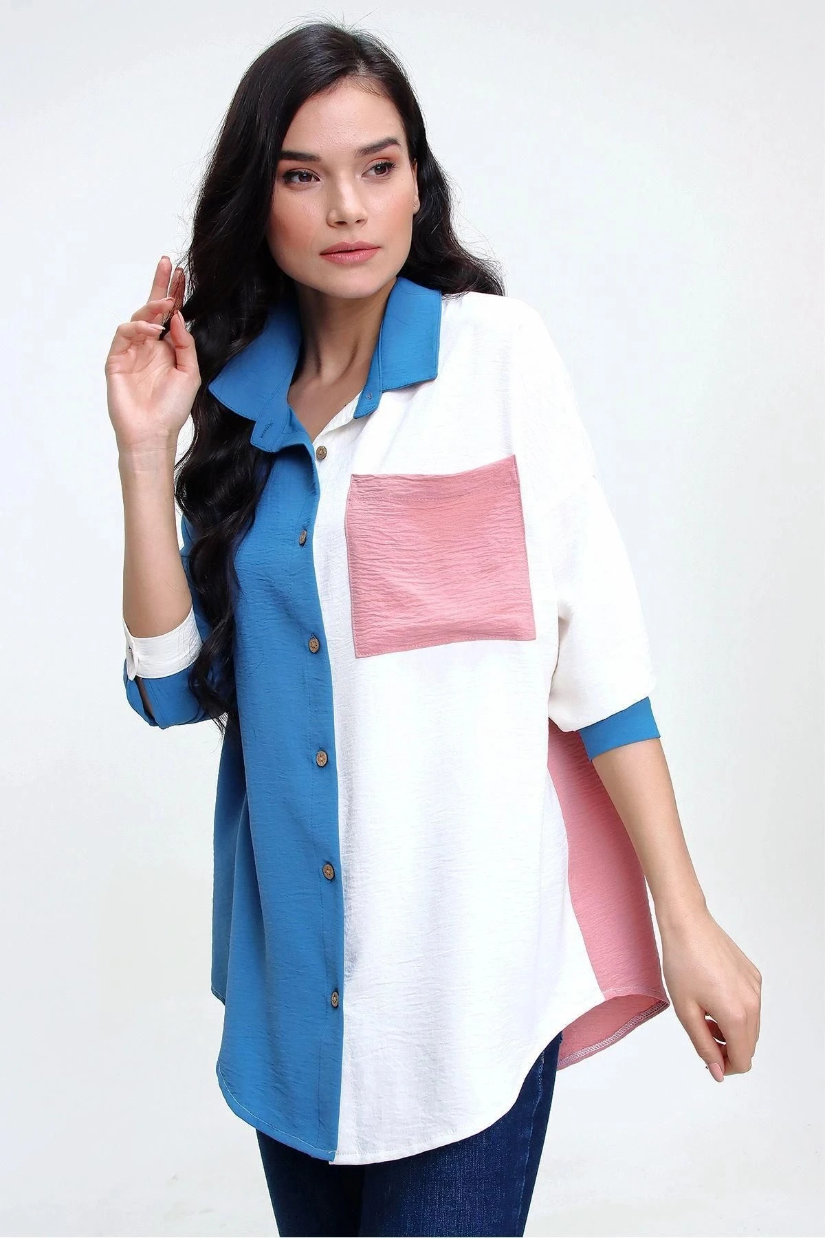 Kadın Mavi Uzun Kol Detaylı Renk Bloklu Oversize Gömlek Cepli Dökümlü Arkası Uzun Maksi Boy