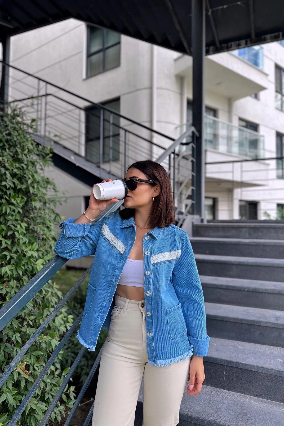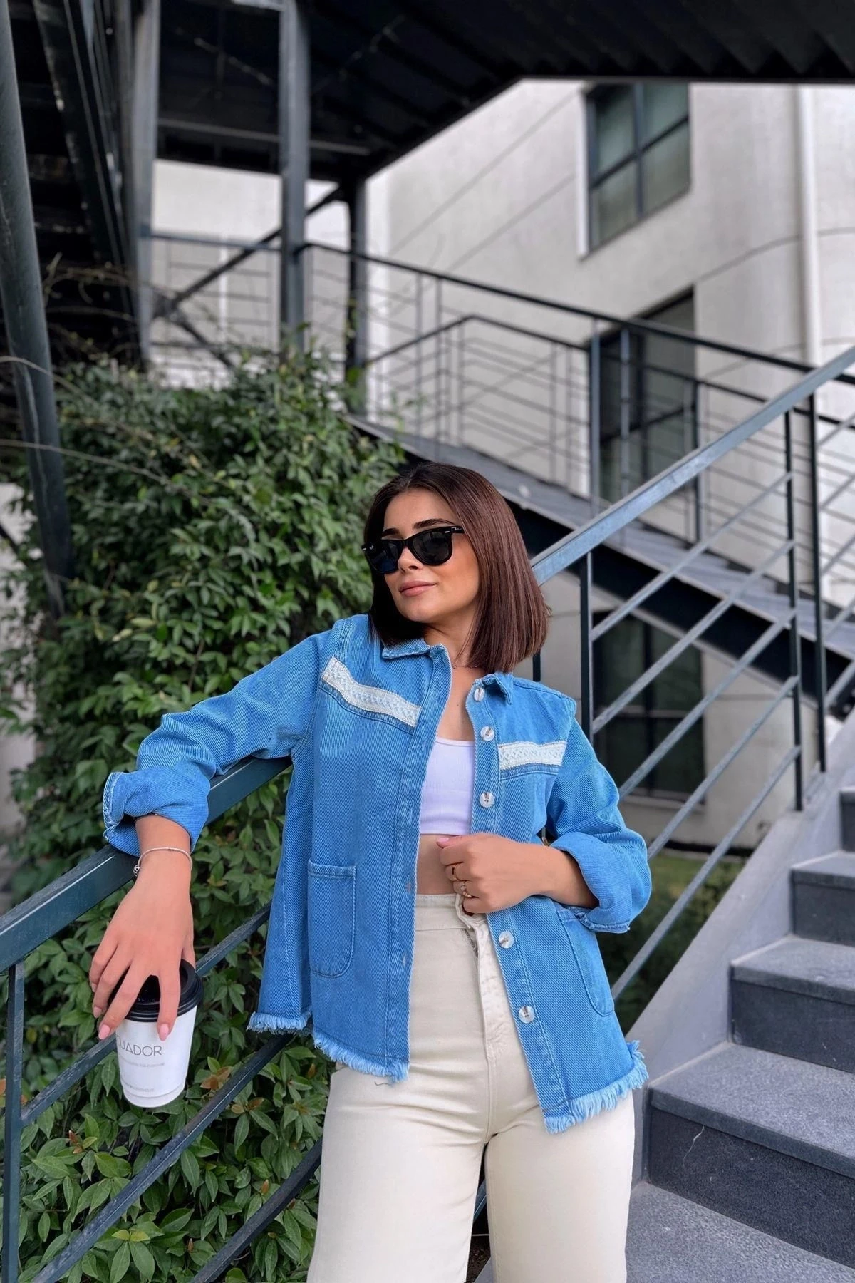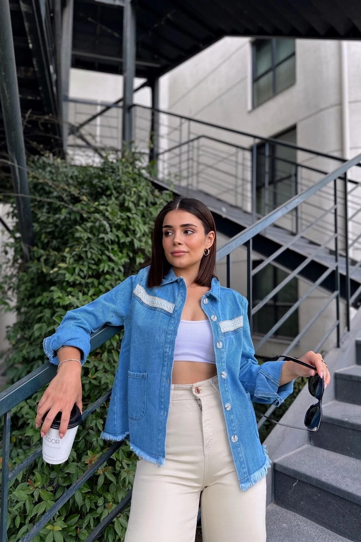Kadın Mavi Uzun Kol, Kalite Kot Kumaş, Şerit Detay, Eteği Püsküllü, Cepli Kot Gömlek & Denim Ceket
