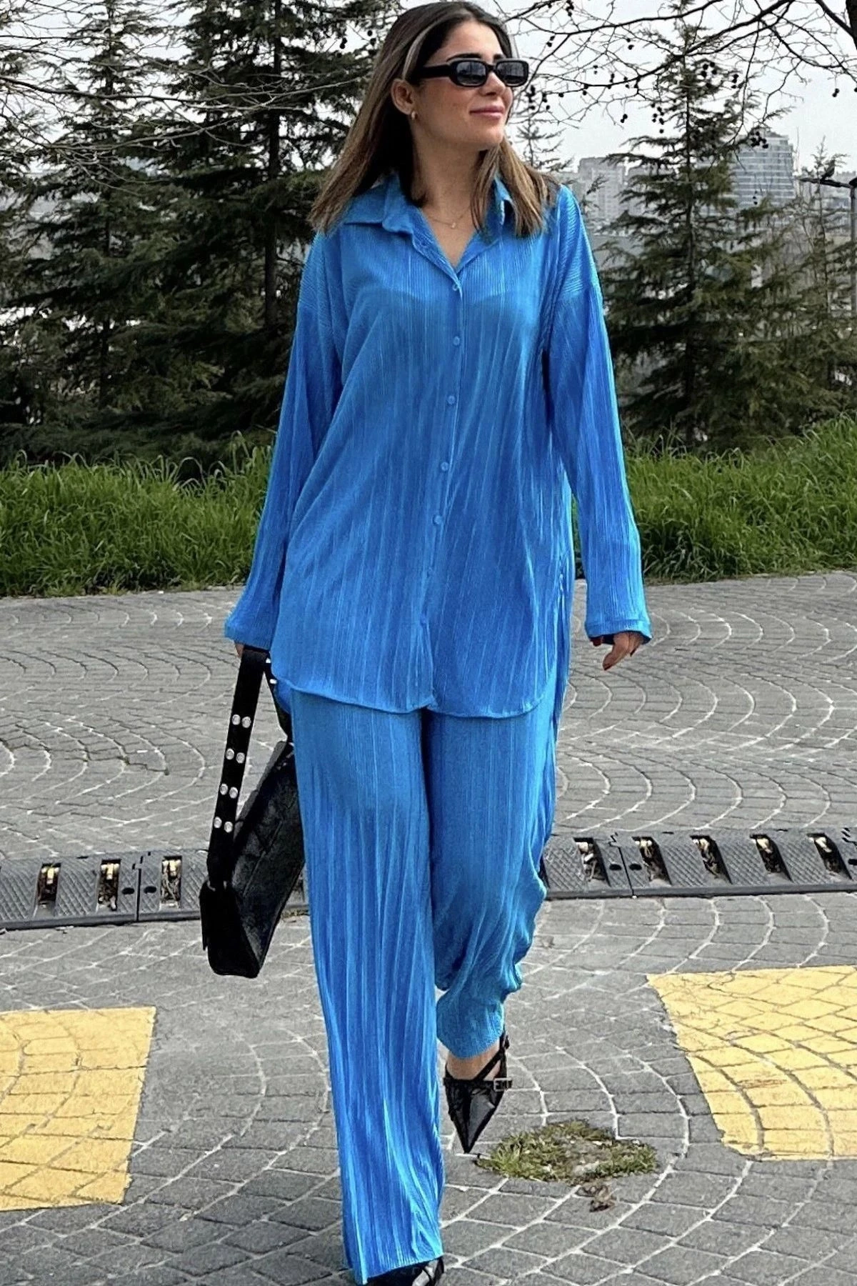 Kadın Mavi Uzun Tunik Gömlek & Beli Lastikli, Bol Paça Pantolon - Salaş Bürümcük Takım