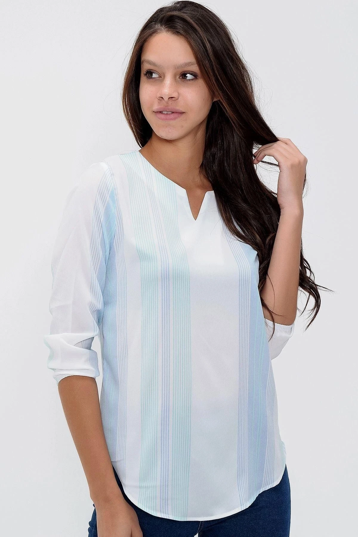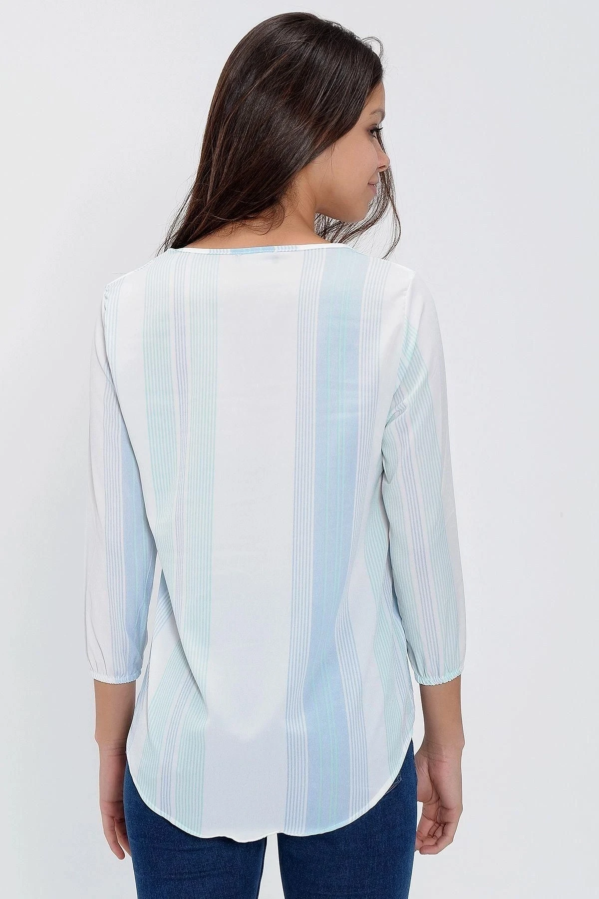 Kadın Mavi Yakası Yırtmaçlı Krep Bluz Truvakar Kol Çizgili ve Giy Çık - Tesettüre Uygun