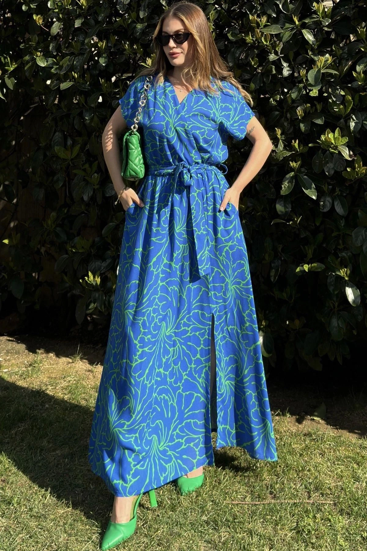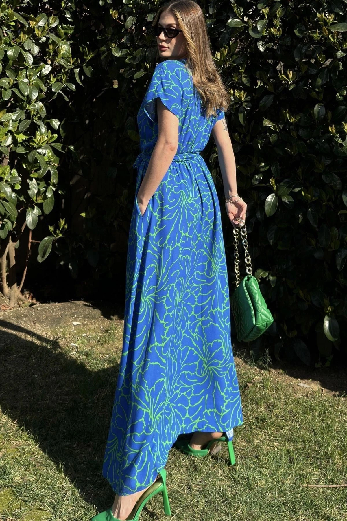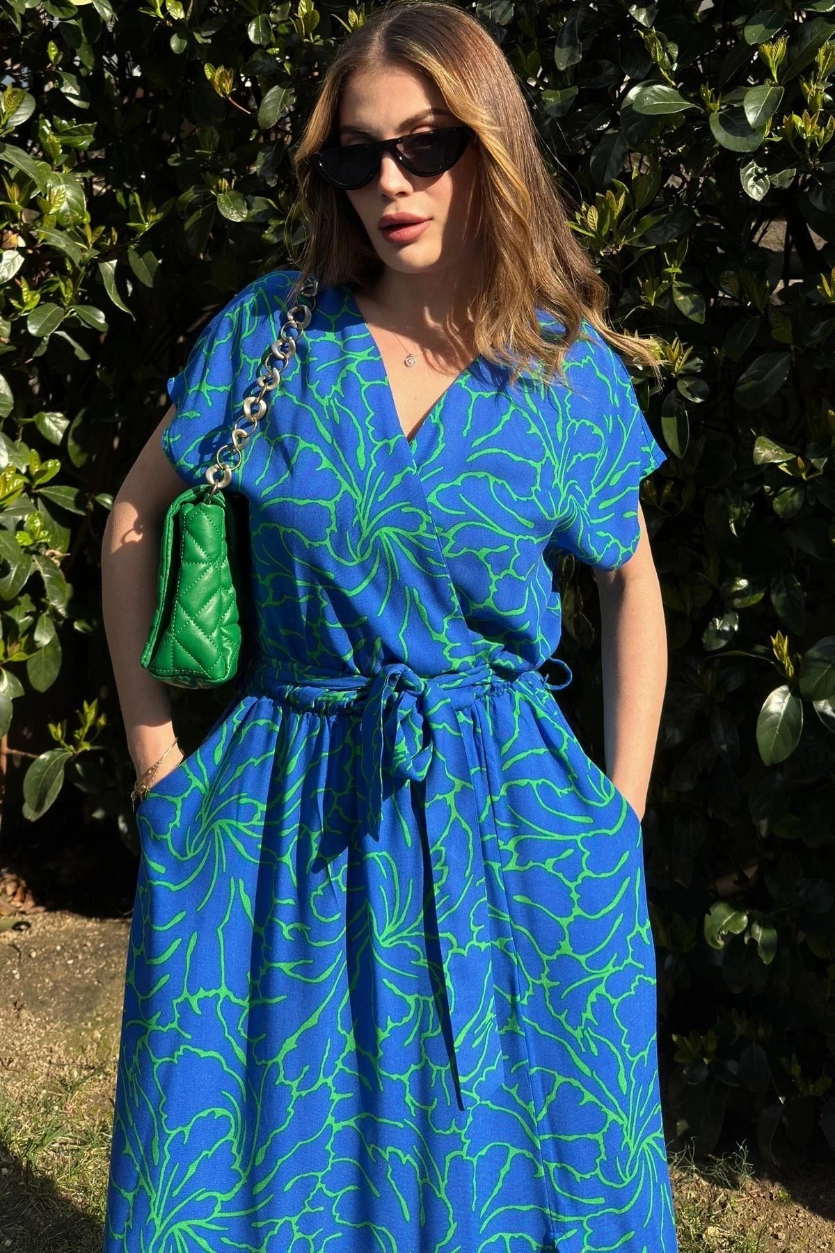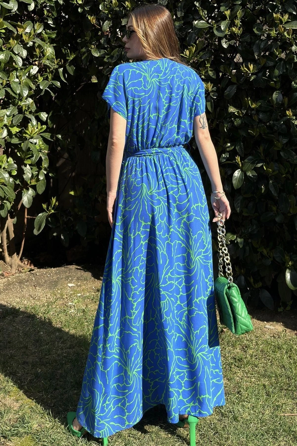 Kadın Mavi & Yeşil Desenli Kısa Kol, Kruvaze Beli Lastikli Önden Yırtmaçlı Uzun/Maksi Kiloş Elbise