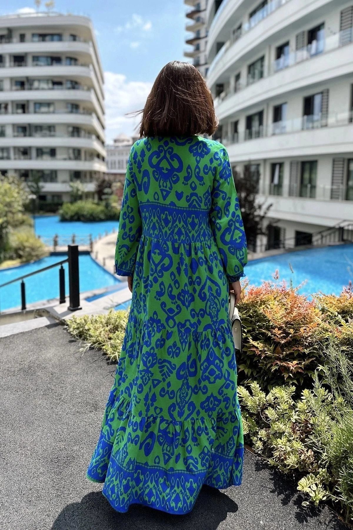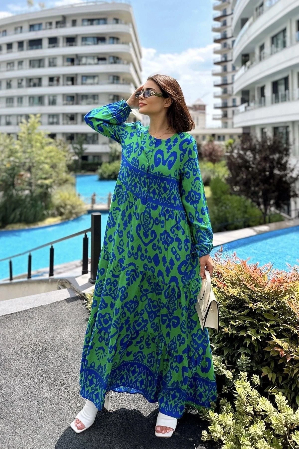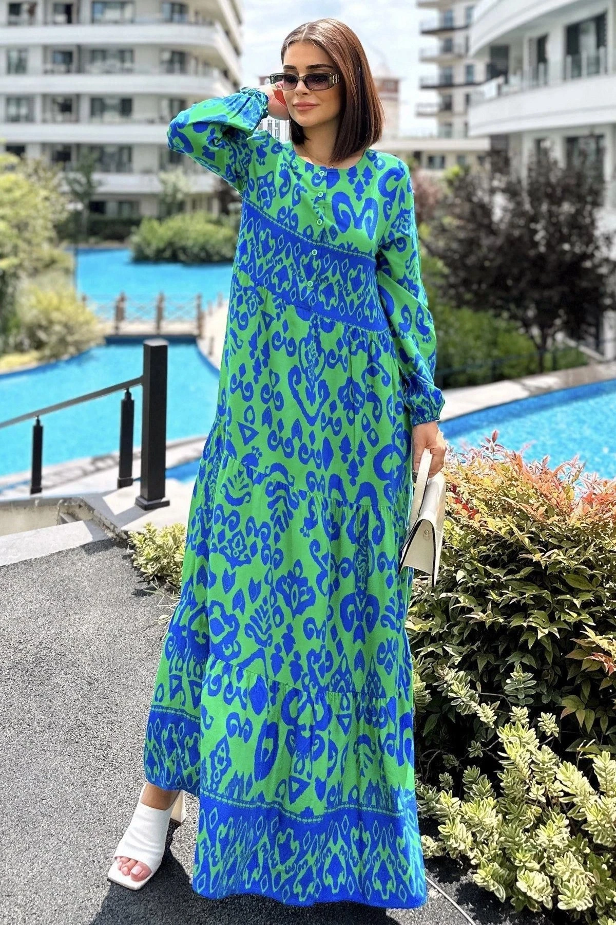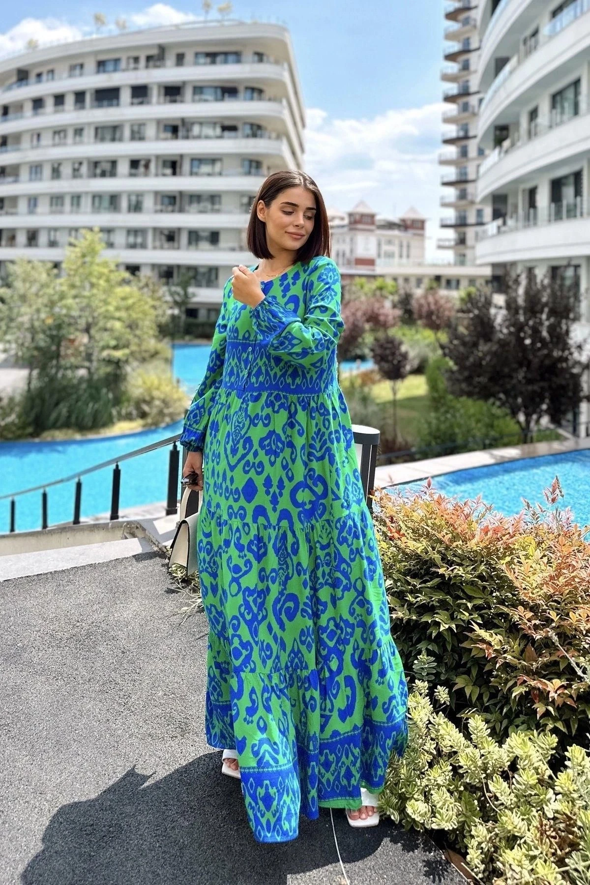 Kadın Mavi & Yeşil Düğmeli Yuvarlak Yaka, Eteği Pliseli, Bilekleri Lastikli, Salaş, Uzun Elbise